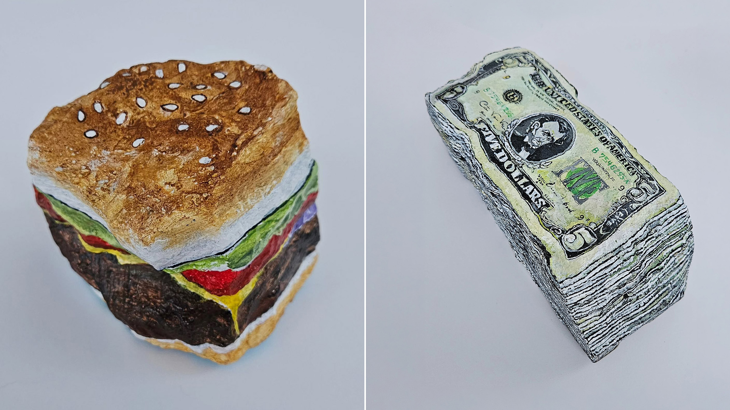 Elizabeth Saloka transforme des cailloux en objets du quotidien ultra réalistes, mêlant illusion visuelle et réflexion sur la consommation.
