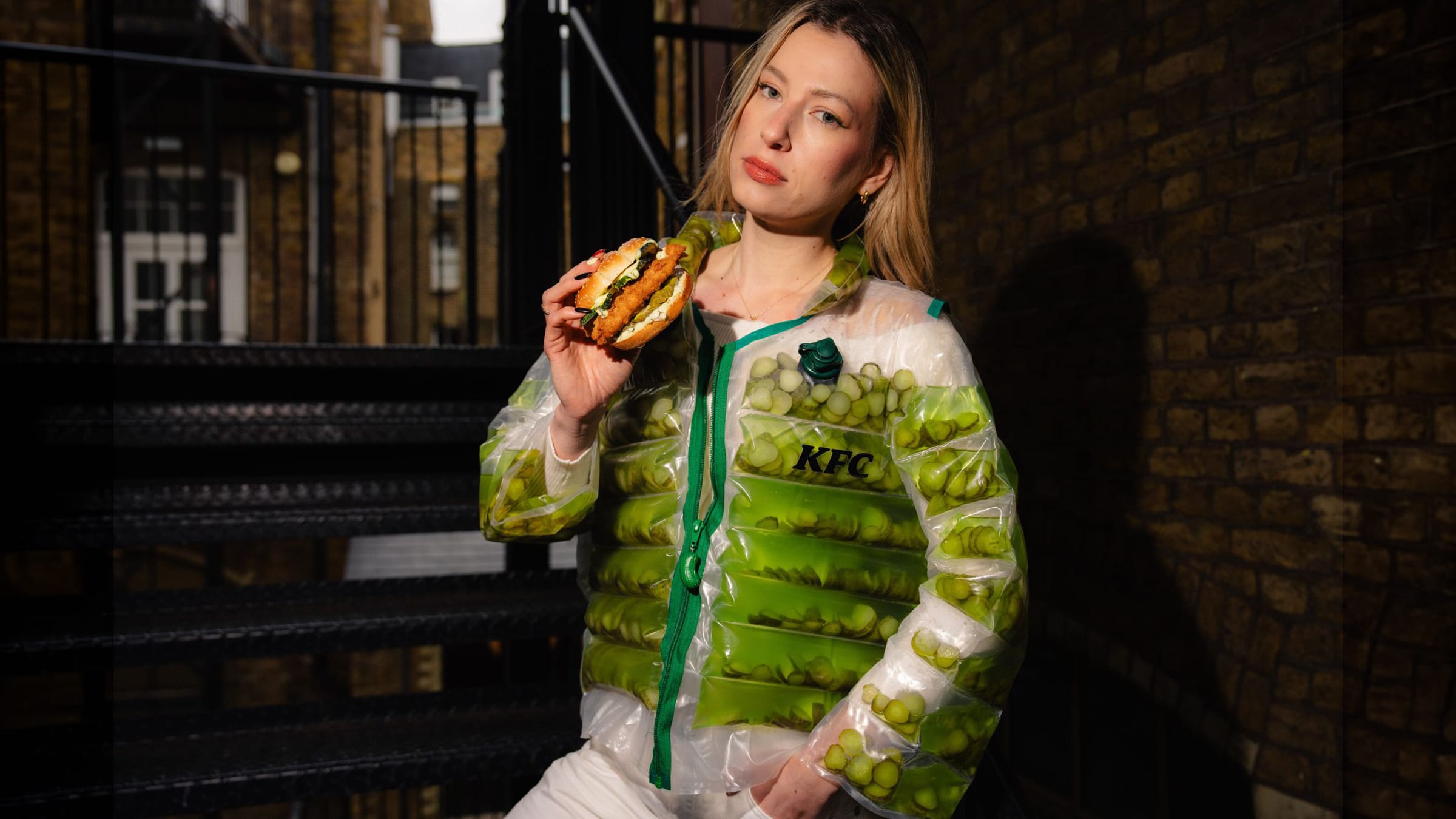 KFC dévoile une doudoune remplie de cornichons avec paille intégrée : une idée inspirée d’un délire viral pour promouvoir son menu Pickle.