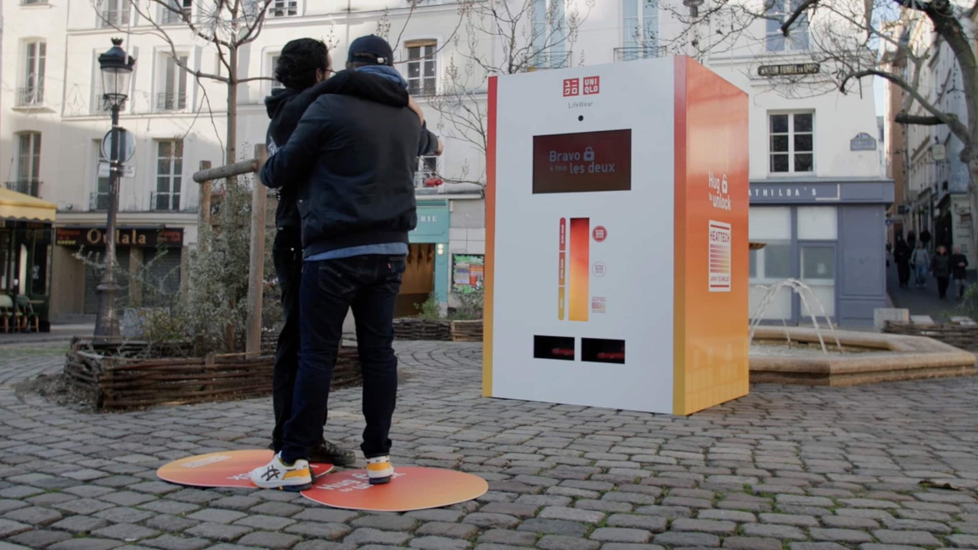 Creapills a imaginé Hug to Unlock, un distributeur interactif installé place de la Contrescarpe à Paris qui délivre un vêtement HEATTECH en échange d’un câlin. Plus l’étreinte dure, plus la récompense est chaude : standard, extra chaud ou ultra chaud. Une mécanique ludique et universelle, qui fait du geste humain la clé d’activation du produit et traduit la promesse en expérience tangible.