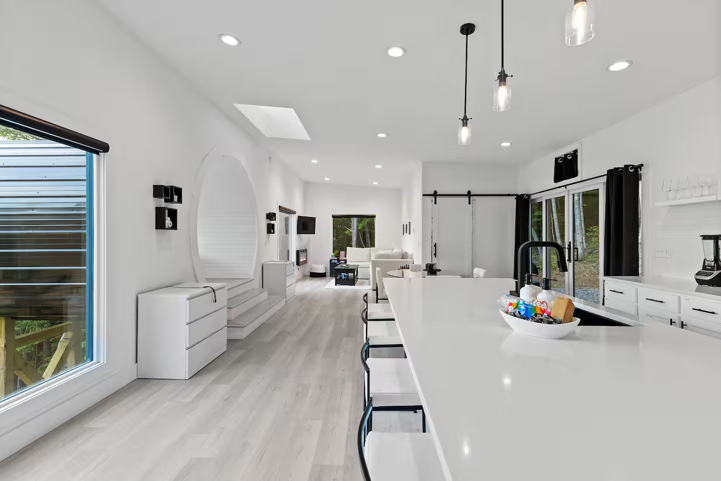 Derrière son apparence ludique, The Lens Lodge reste un hébergement entièrement fonctionnel. Les visiteurs y trouvent un salon lumineux, une cuisine équipée, une salle de bain avec vue sur les bois et même un canapé convertible pour accueillir d’autres voyageurs.