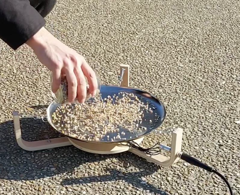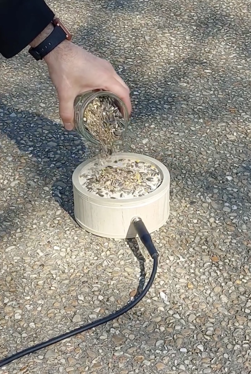 Le dispositif imaginé par l’artiste est aussi simple qu’ingénieux. Une surface métallique équipée de capteurs, reliée à un système sonore, sur laquelle il disperse des graines.