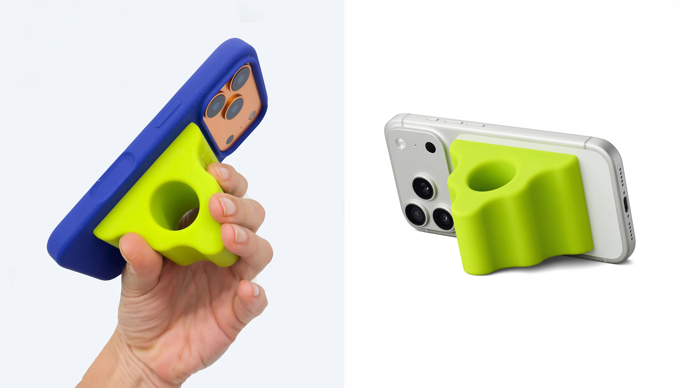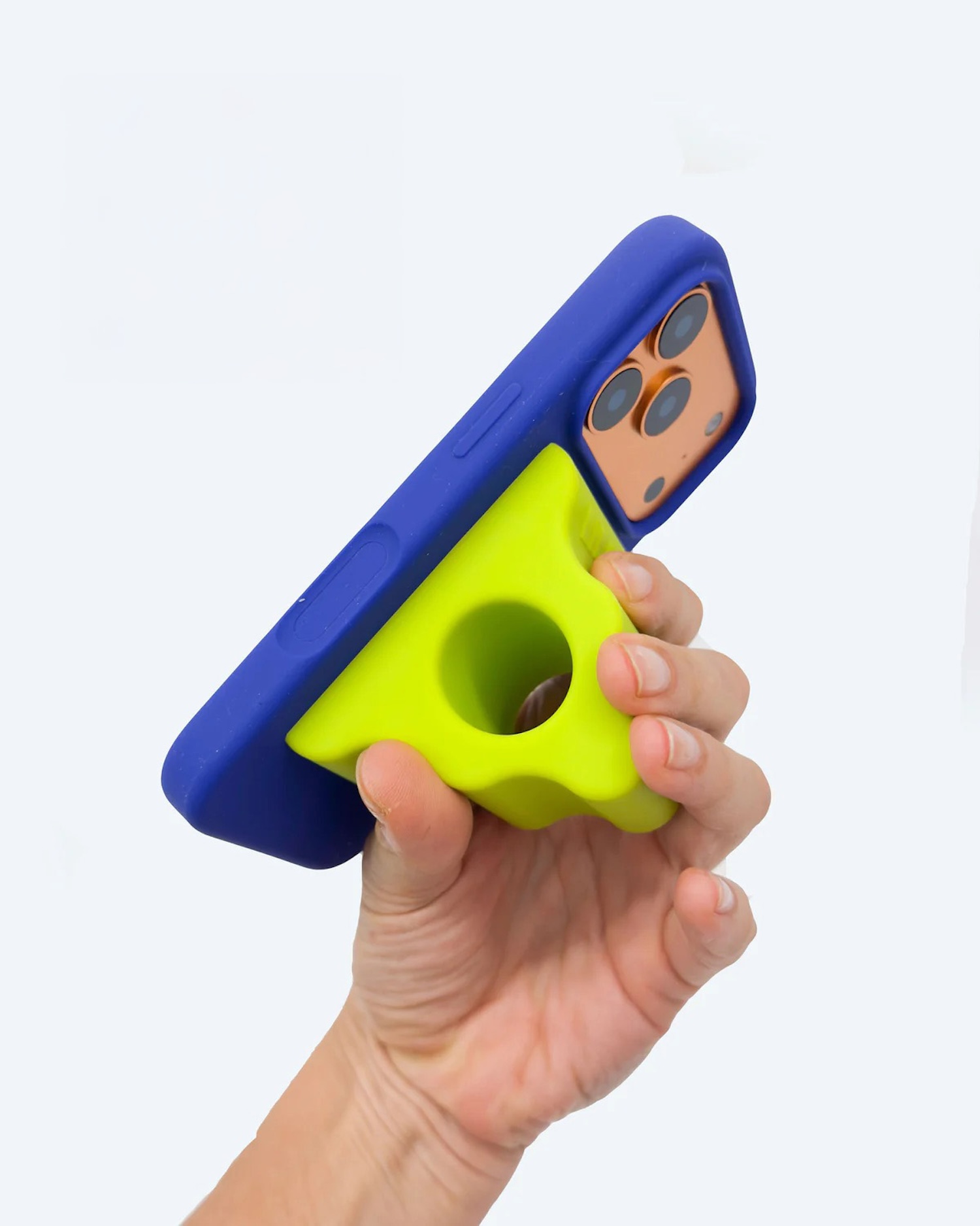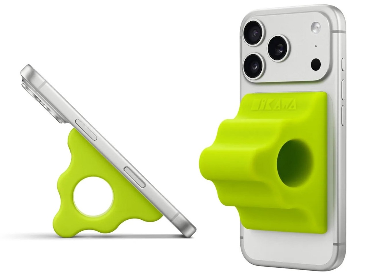 Plutôt qu’un design discret, Apple et Hikawa ont choisi un langage visuel sculptural, presque décoratif. Les deux coloris proposés (un chartreuse très vif et un gris “Crater” marbré) donnent au grip un statut d’objet à part entière, loin de l’image utilitaire qu’on associe habituellement à ce type d’aide.