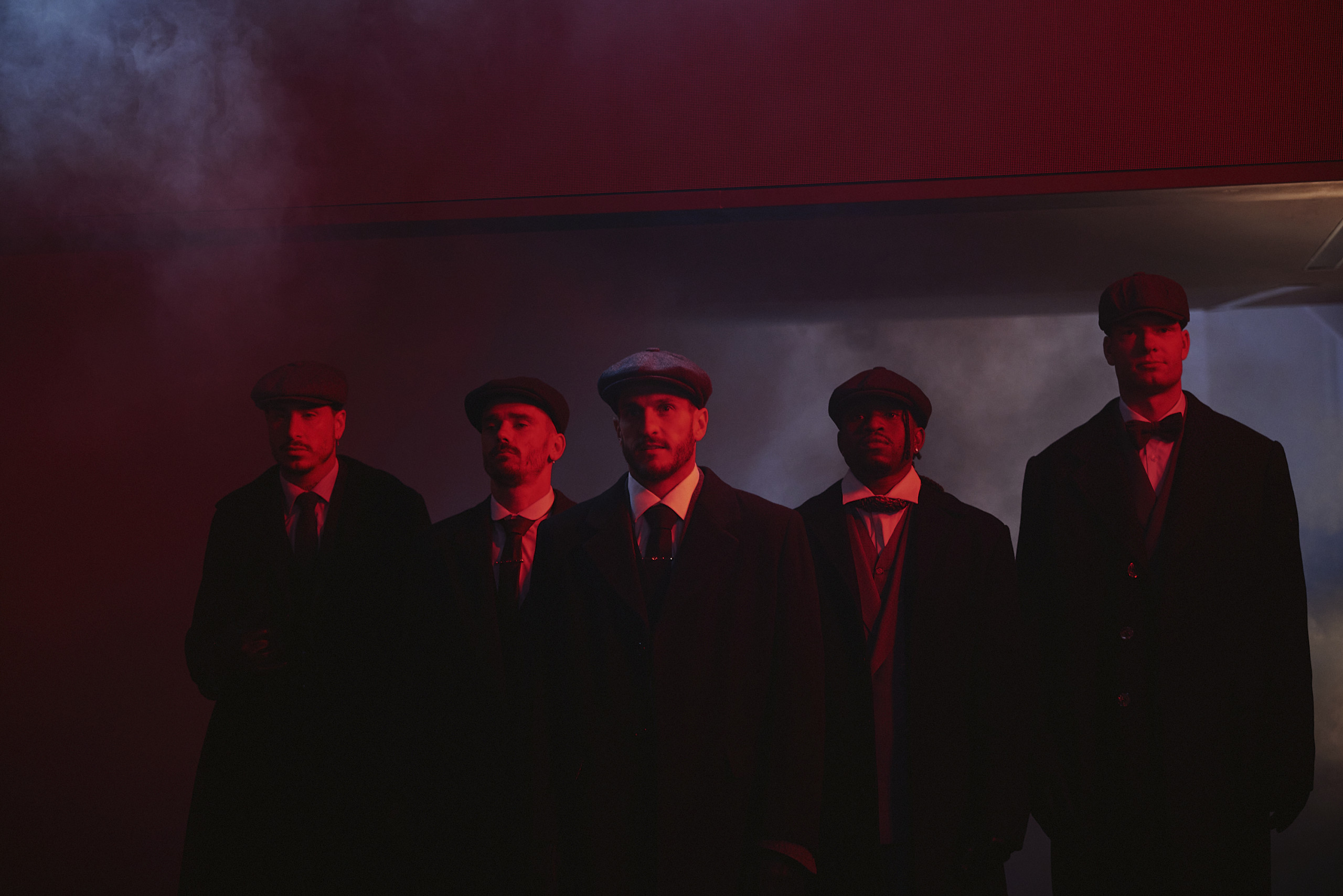 Dès l’arrivée de l’équipe, le ton était donné. Le bus des joueurs a été escorté par des véhicules d’époque et des acteurs habillés comme les membres du gang Shelby, recréant l’atmosphère du Birmingham des années 1930.