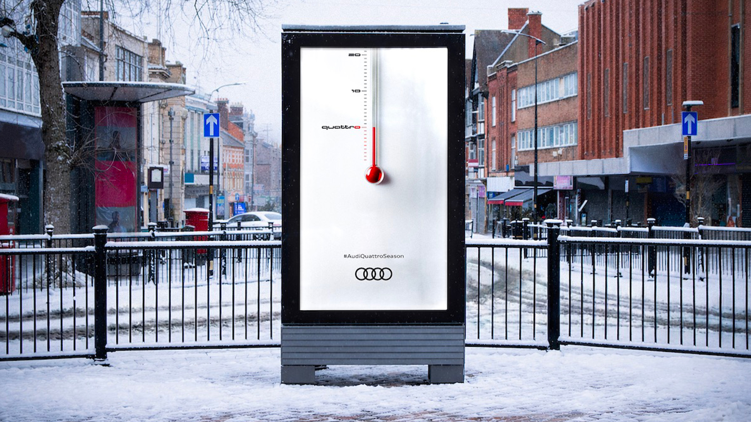 - Audi lance une campagne au Royaume-Uni qui laisse la météo annoncer le retour de la quattro season, sans montrer de voiture ni de performance, uniquement un thermomètre qui atteint zéro degré.
