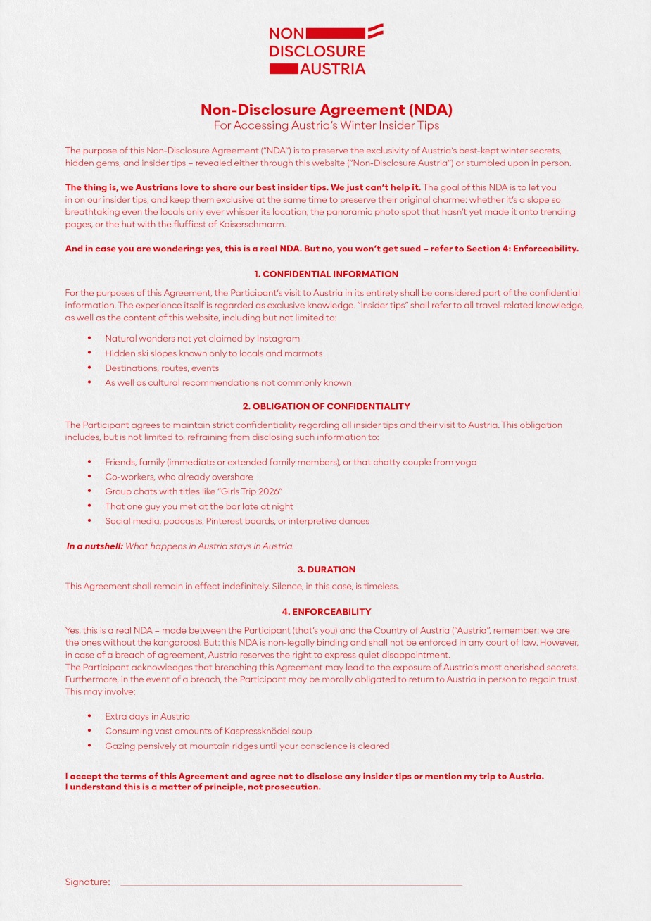- L’Autriche répond au surtourisme avec Non-Disclosure Austria, une campagne qui invite les visiteurs à signer symboliquement un accord de confidentialité pour ne pas dévoiler les lieux les plus préservés.