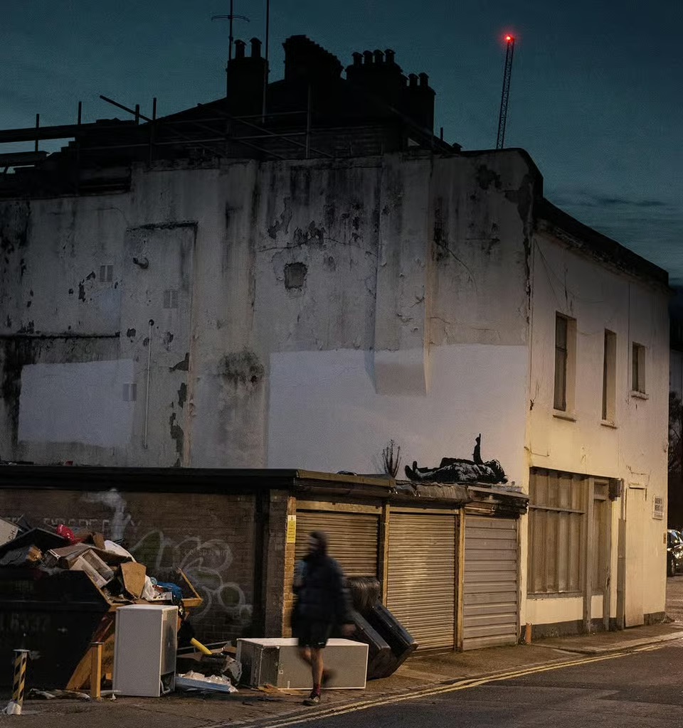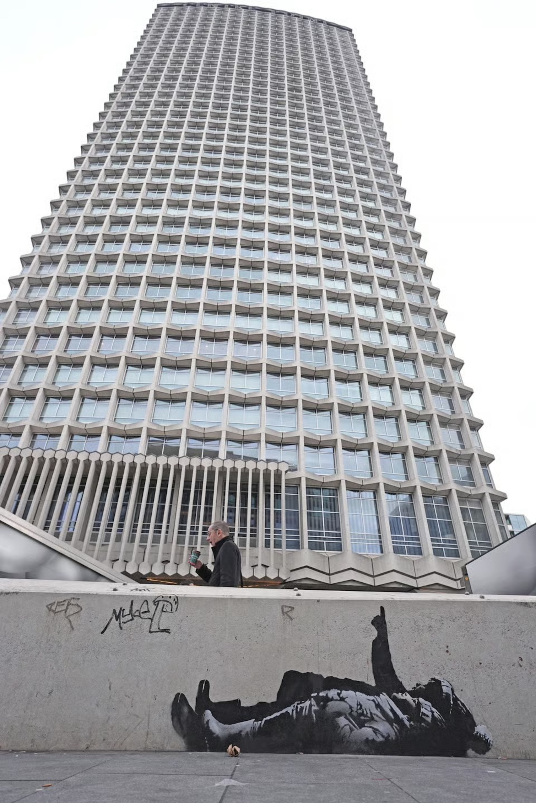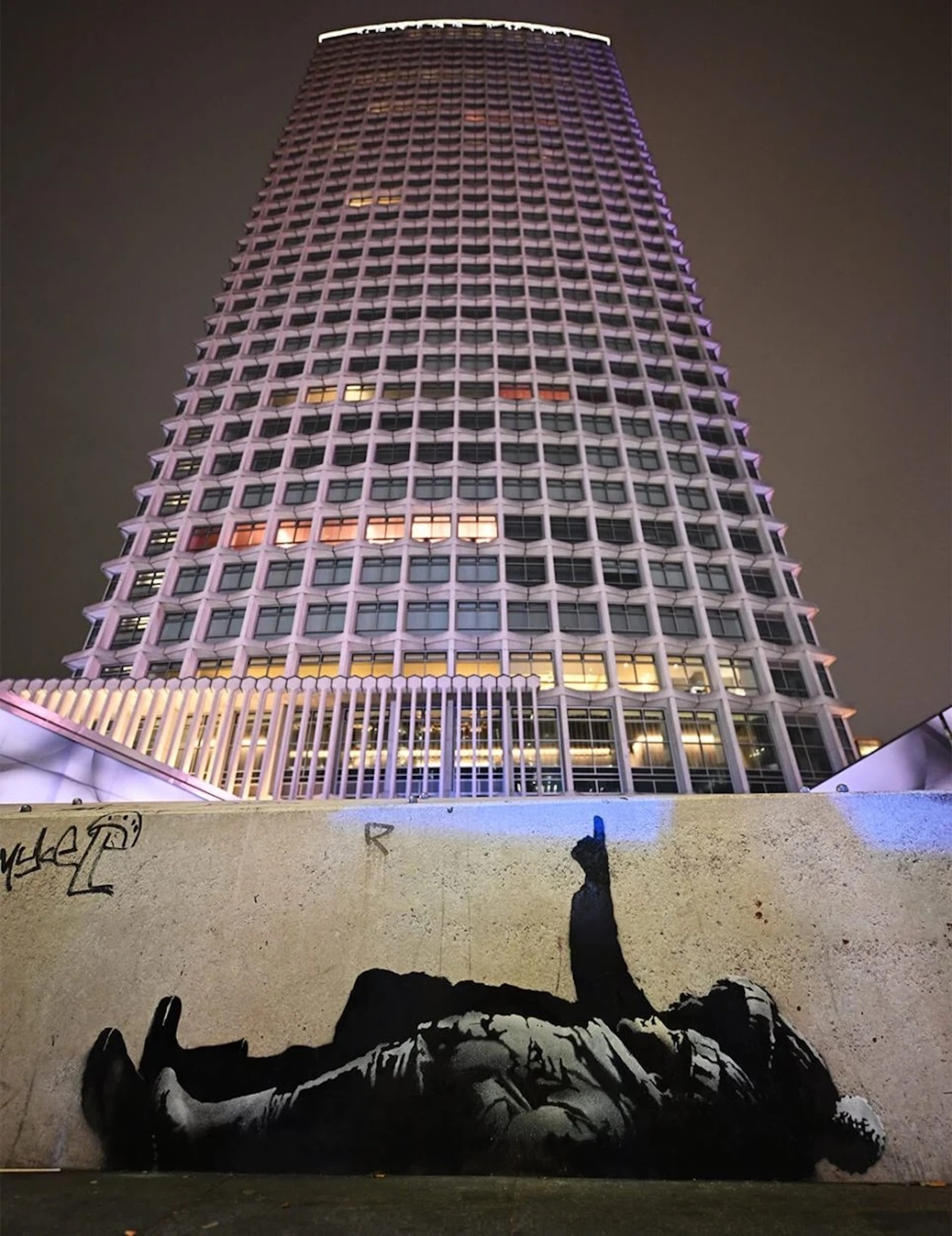 Ce qui intrigue, c’est qu’un pochoir identique a été repéré le même jour à plusieurs kilomètres de là, dans le centre de Londres, au pied du bâtiment Centre Point. Même composition, même duo au sol, même doigt pointé vers le ciel. Sauf que cette version n’a pas été relayée sur Instagram par Banksy, ce qui laisse son authenticité en suspens. Et certains commentateurs y lisent déjà autre chose : Centre Point aurait été inutilisée pendant des années malgré une grave crise du logement, à deux pas d’un refuge pour sans-abri. Les enfants allongés au pied de la tour pourraient donc renvoyer à ces personnes invisibles… et à cette injustice.