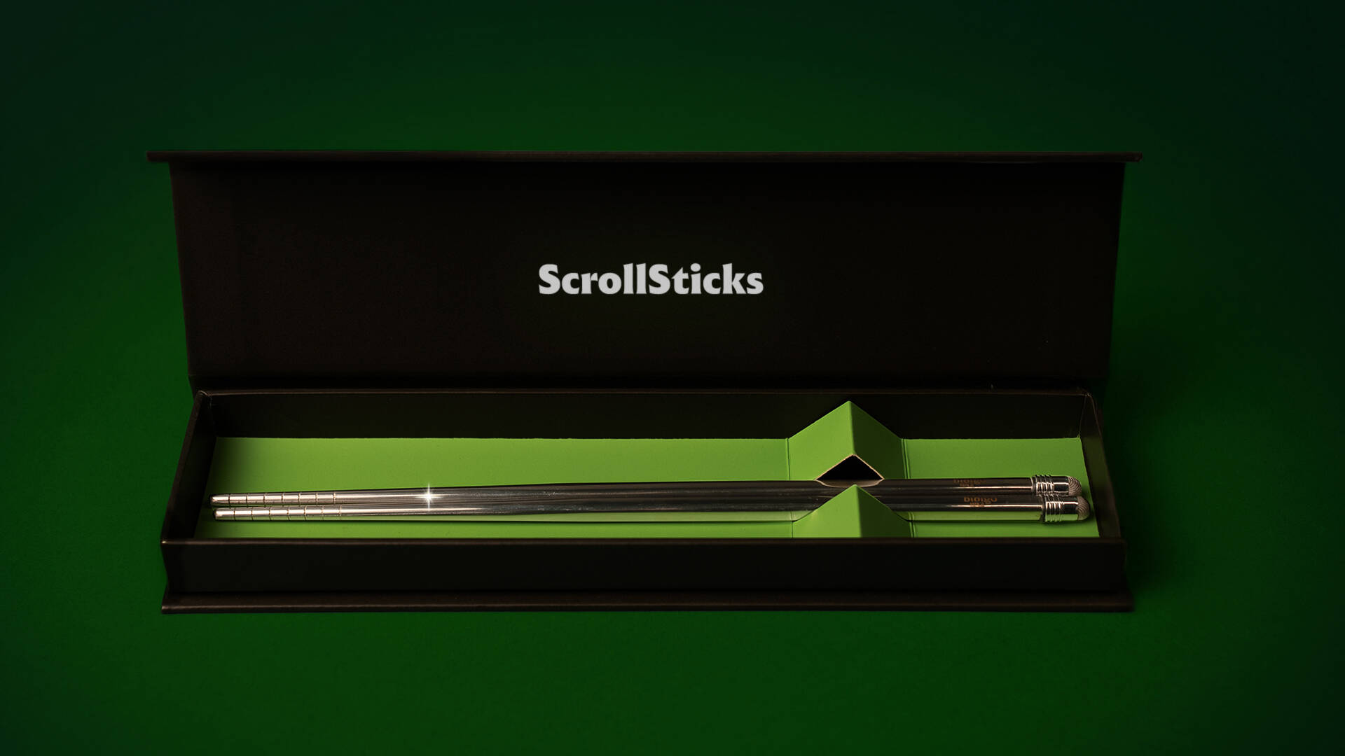 Les ScrollSticks reprennent la forme des baguettes métalliques coréennes… avec une surprise au bout. D’un côté : l’extrémité classique pour attraper dumplings et gyozas. De l’autre : une pointe tactile compatible avec les écrans de smartphone.