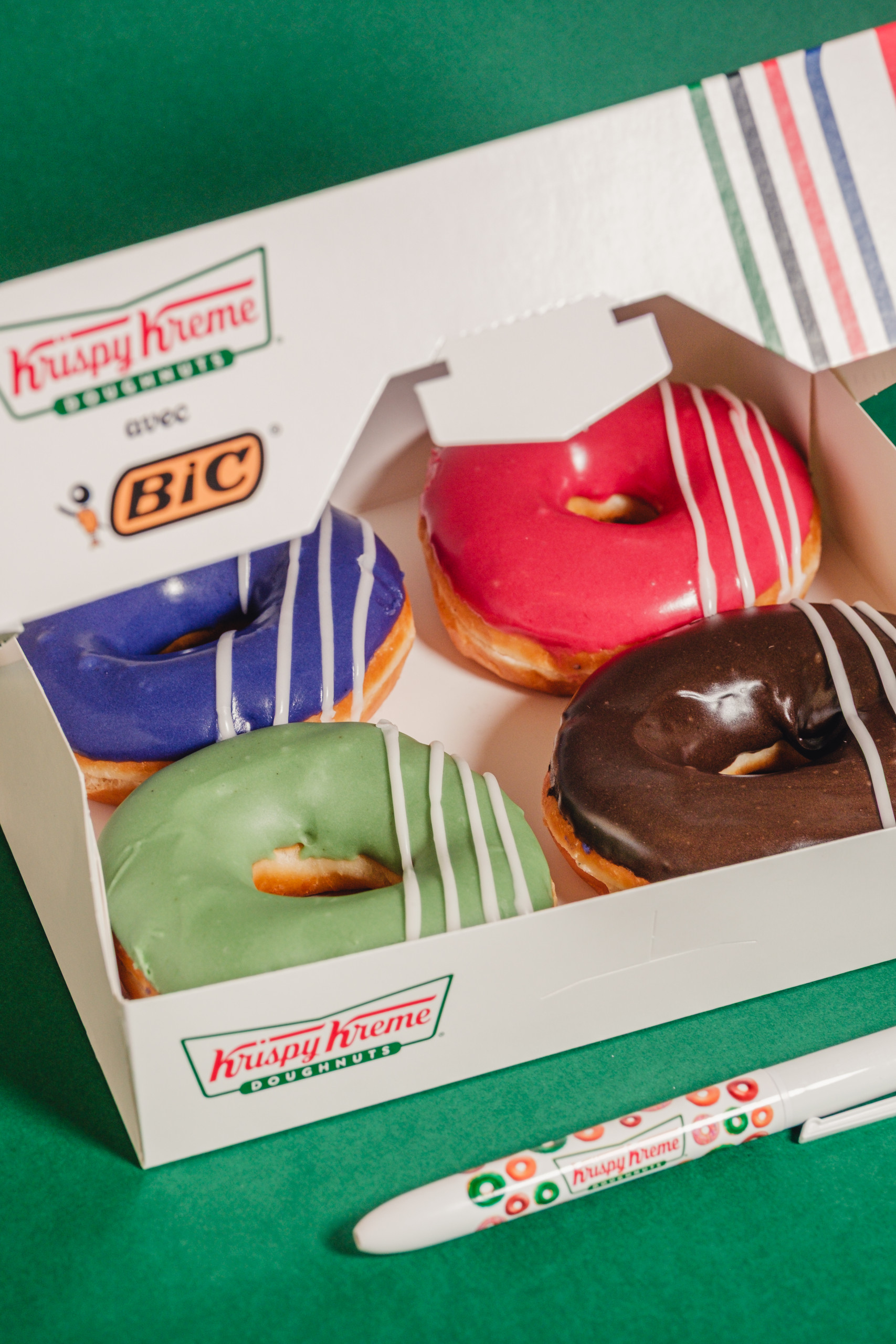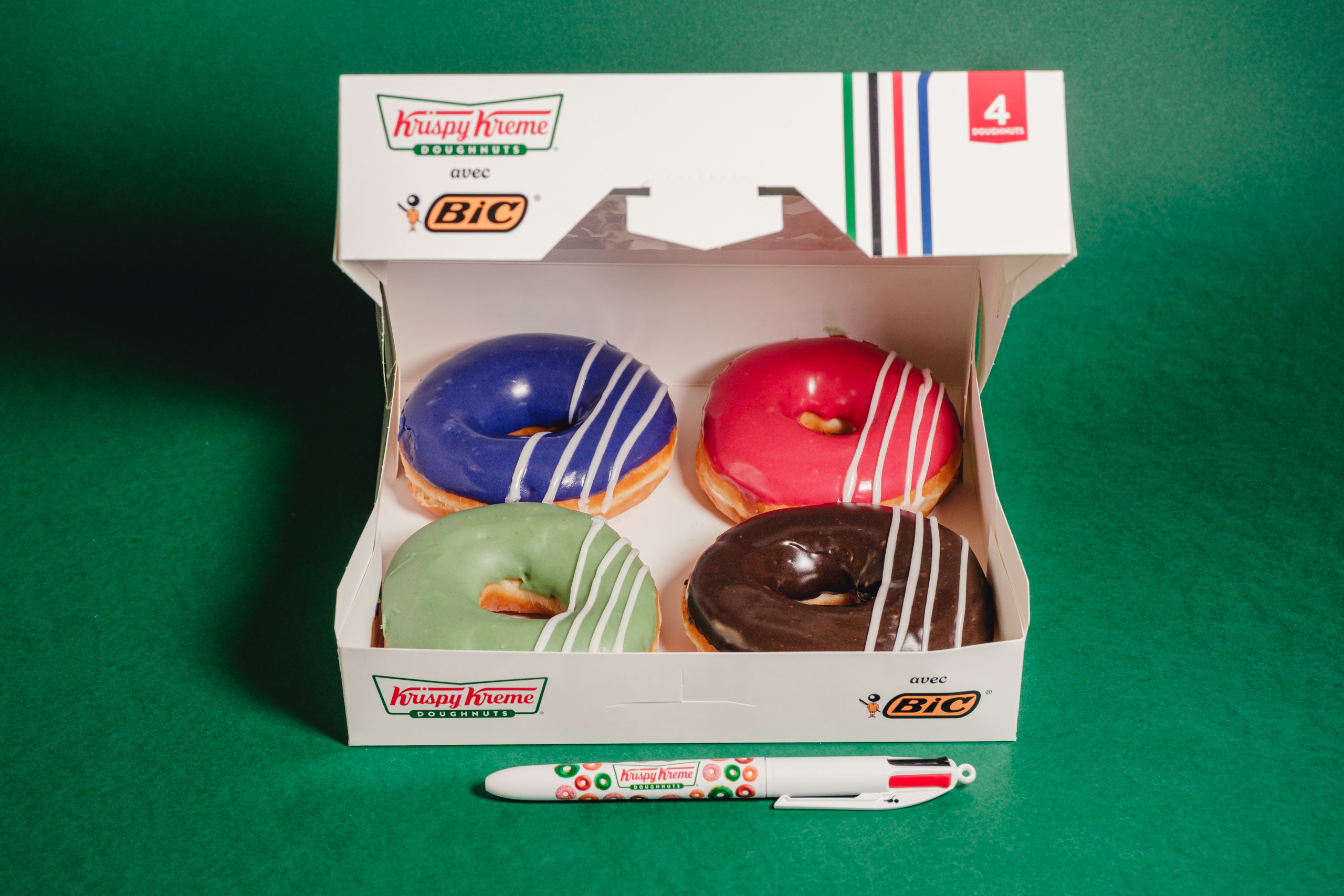 Au cœur de cette collaboration, on retrouve le célèbre stylo BIC 4 Couleurs, revisité sous une forme inédite. Pour l’occasion, Krispy Kreme propose une boîte exclusive de quatre donuts, directement inspirée des teintes emblématiques du stylo.