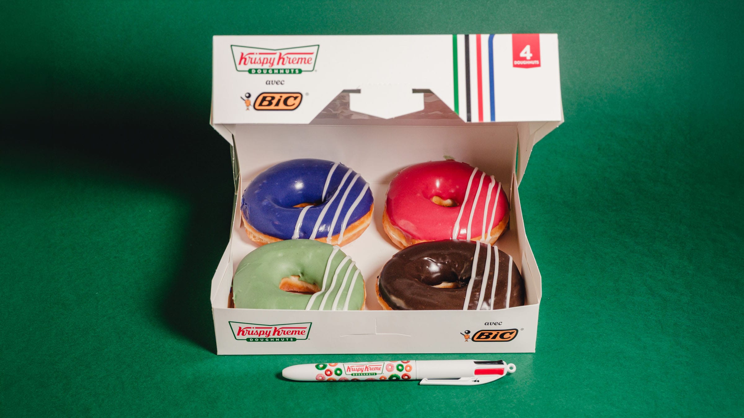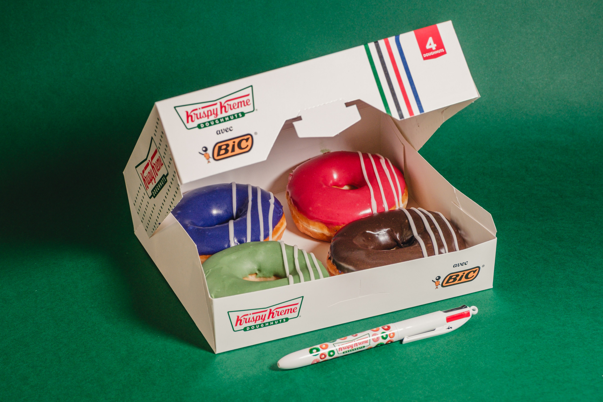 • BIC et Krispy Kreme lancent une collaboration qui détourne le stylo 4 couleurs en box de 4 donuts assortis, pensée comme un kit de révision pour étudiants.