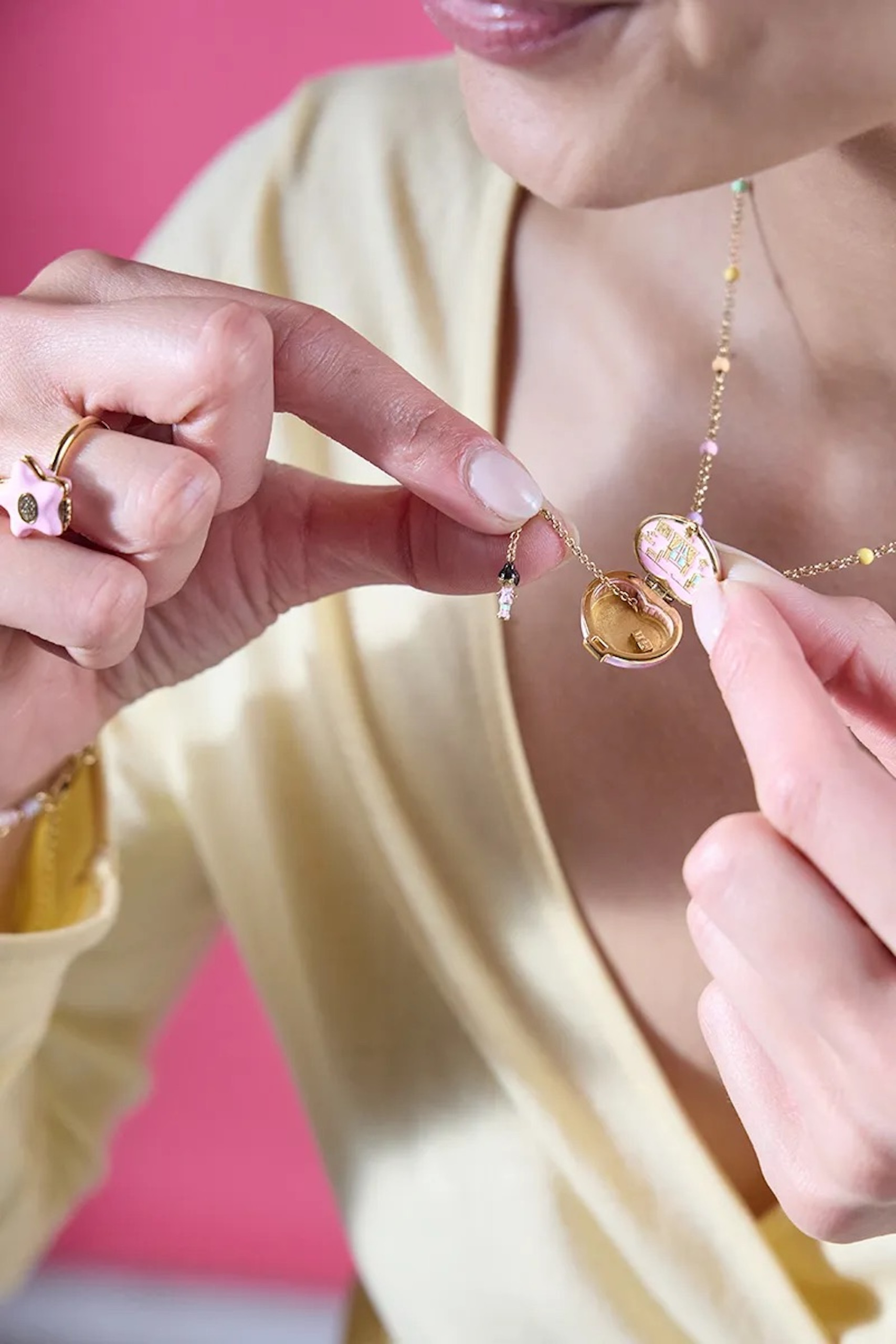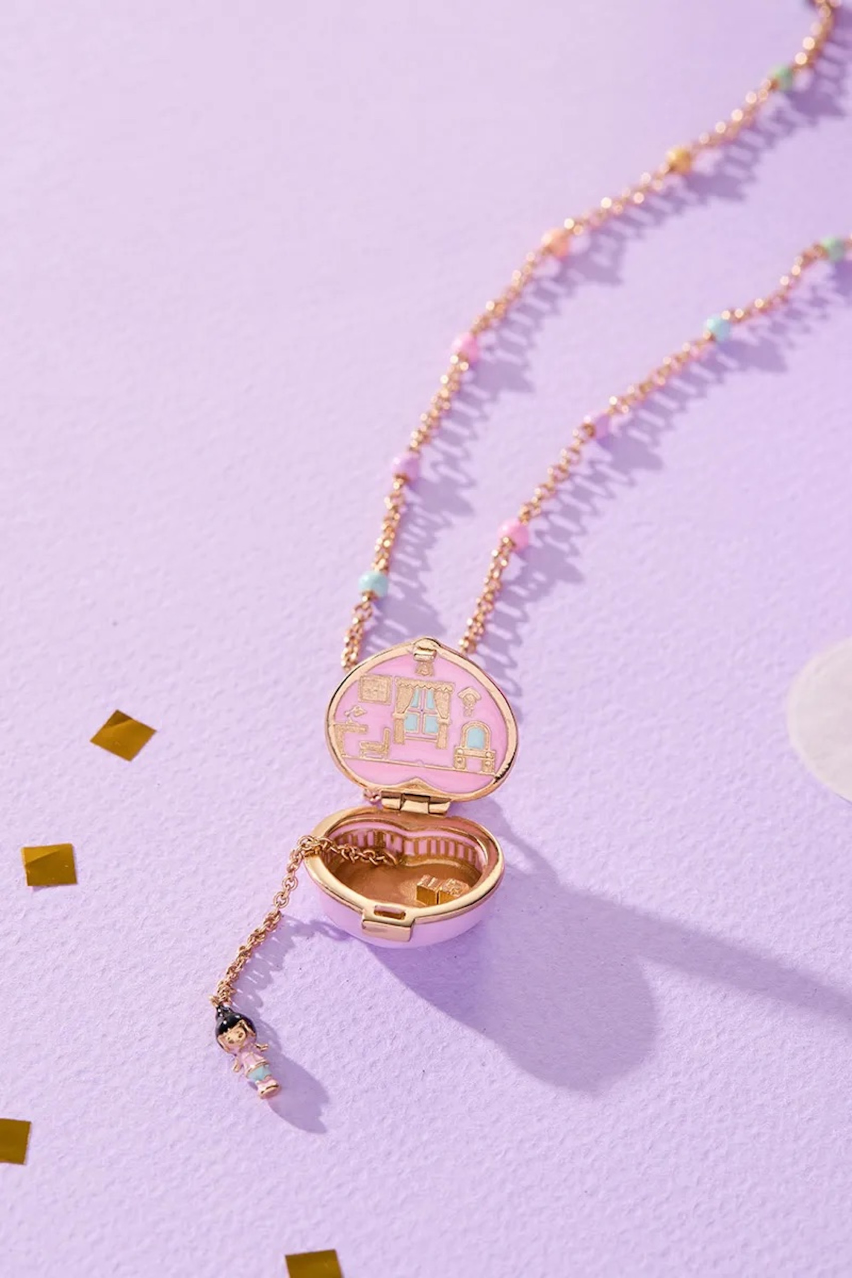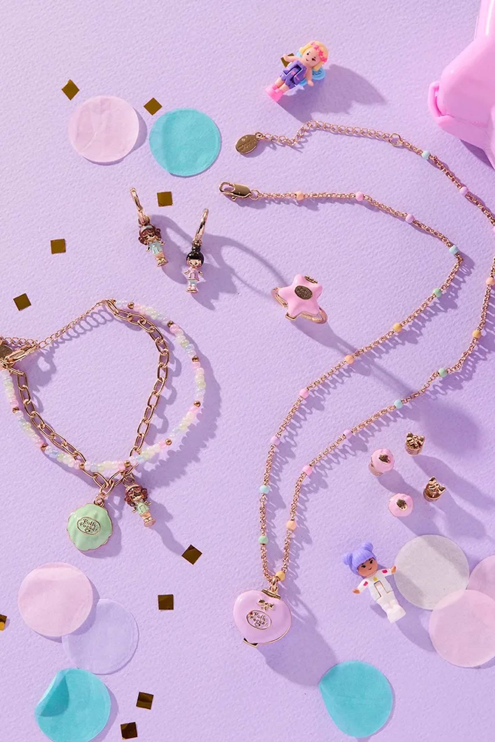 La pièce qui capte le plus l’attention est le collier House Locket, qui reprend l’idée même de Polly Pocket : un objet qui s’ouvre pour révéler une mini-silhouette, comme une scène cachée. À ses côtés, une bague locket joue la carte du clin d’œil avec un message dissimulé à l’intérieur, pendant qu’un bracelet et des boucles d’oreilles complètent l’ensemble avec des charms et des références directes à la poupée.