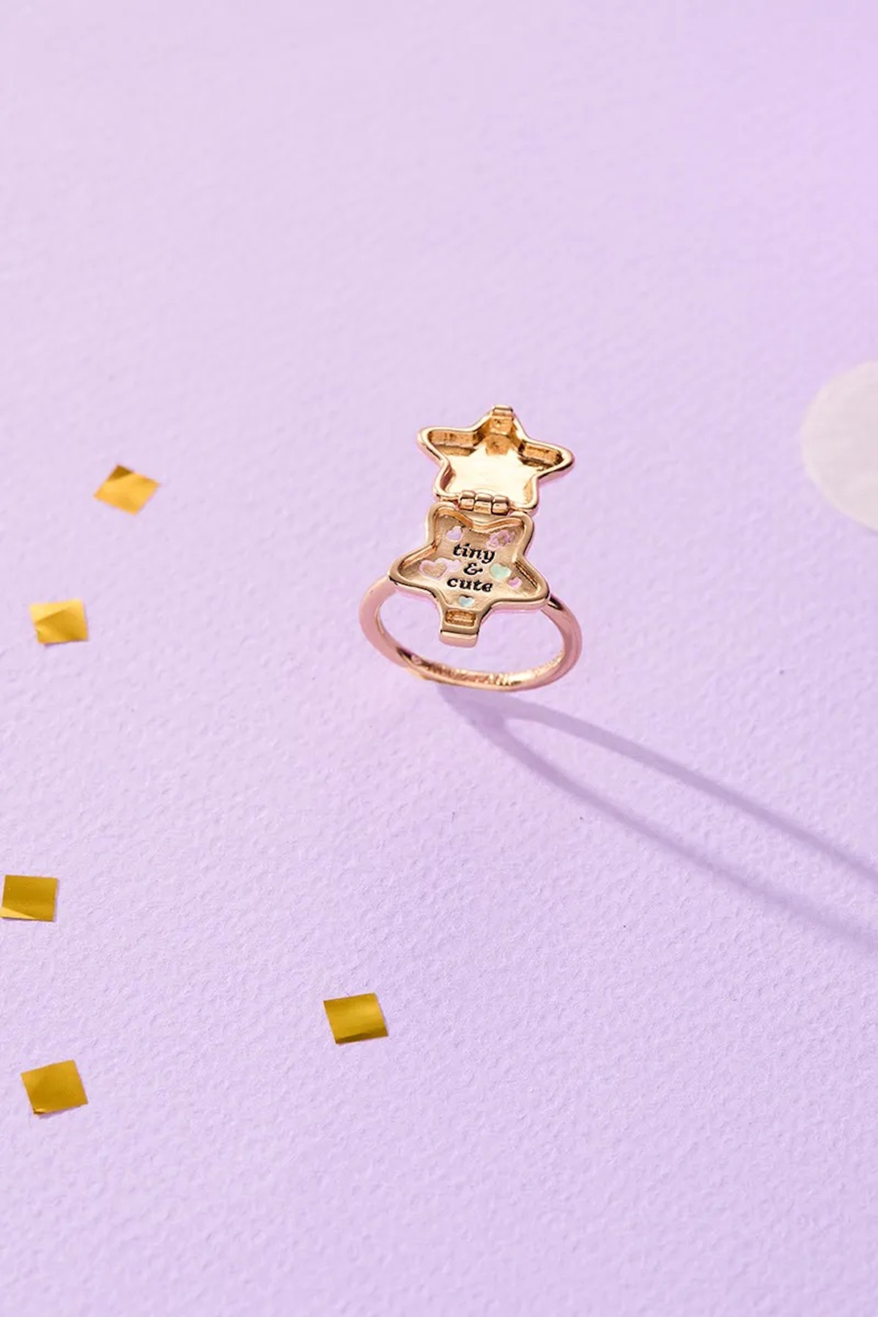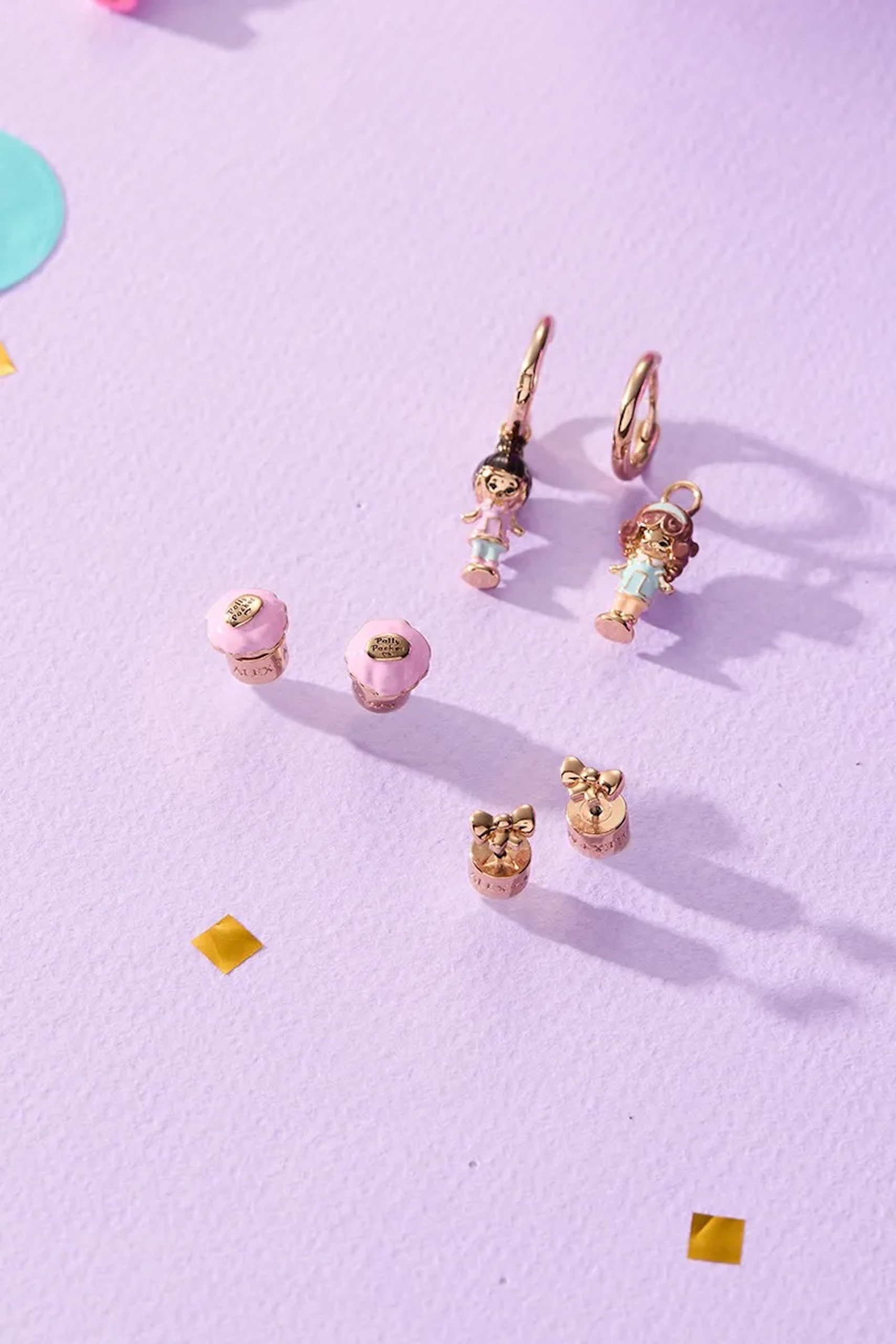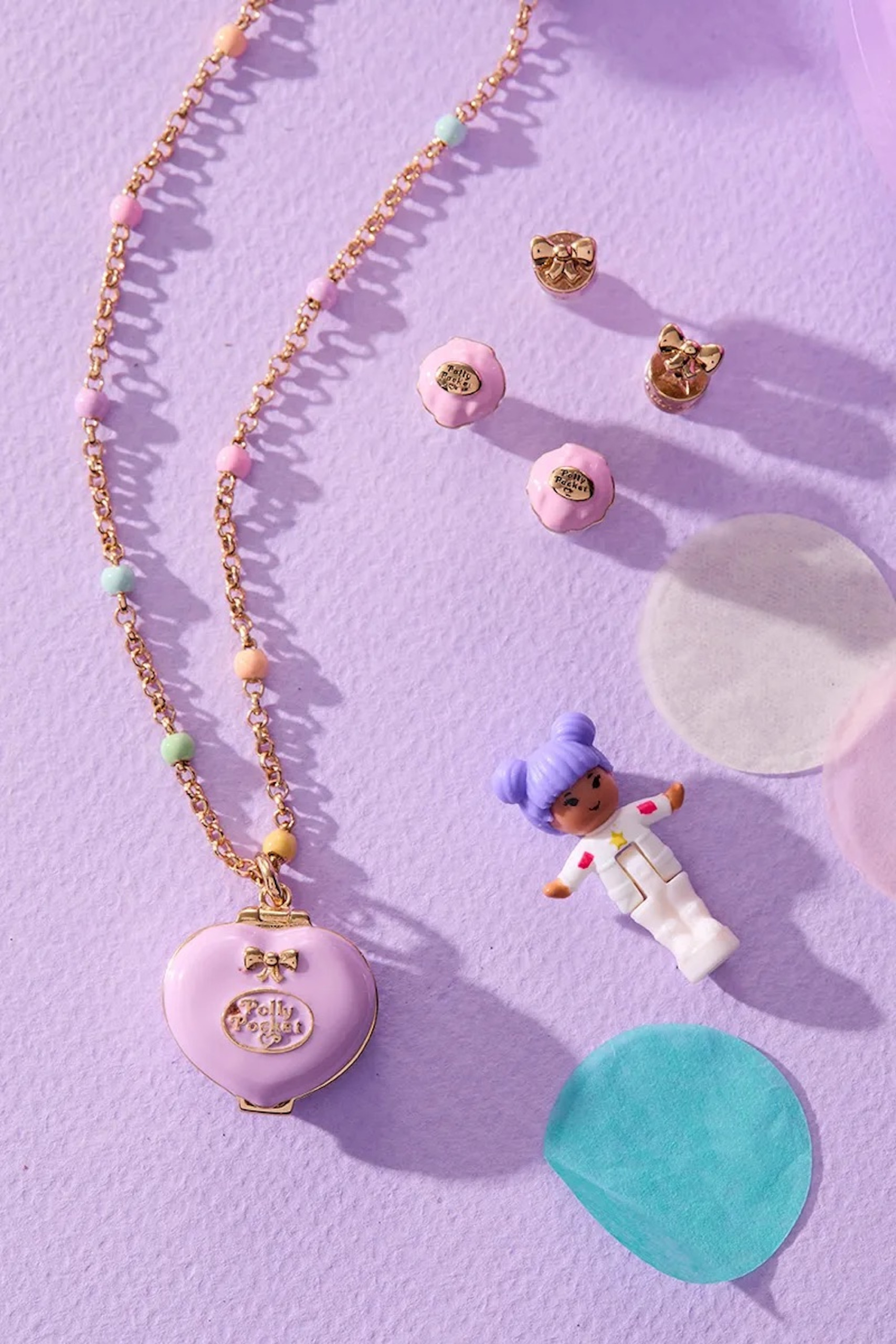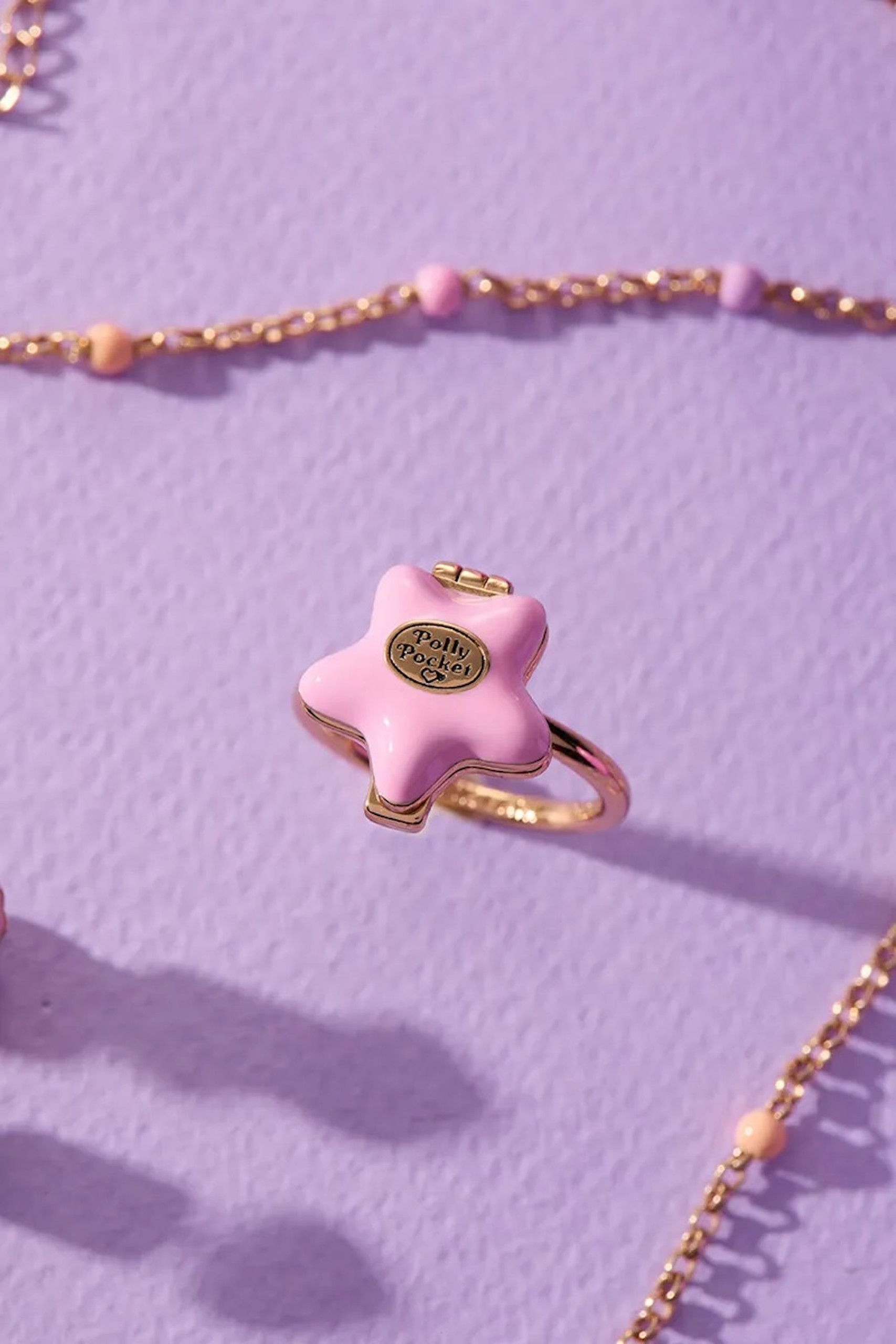 La collection s’appuie sur trois motifs emblématiques associés à l’univers Polly Pocket : le cœur, l’étoile et le coquillage. Des formes immédiatement identifiables pour celles et ceux qui ont connu ces petits coffrets, ici retravaillées dans une esthétique plus “bijou”, entre pastel, doré et détails émaillés.