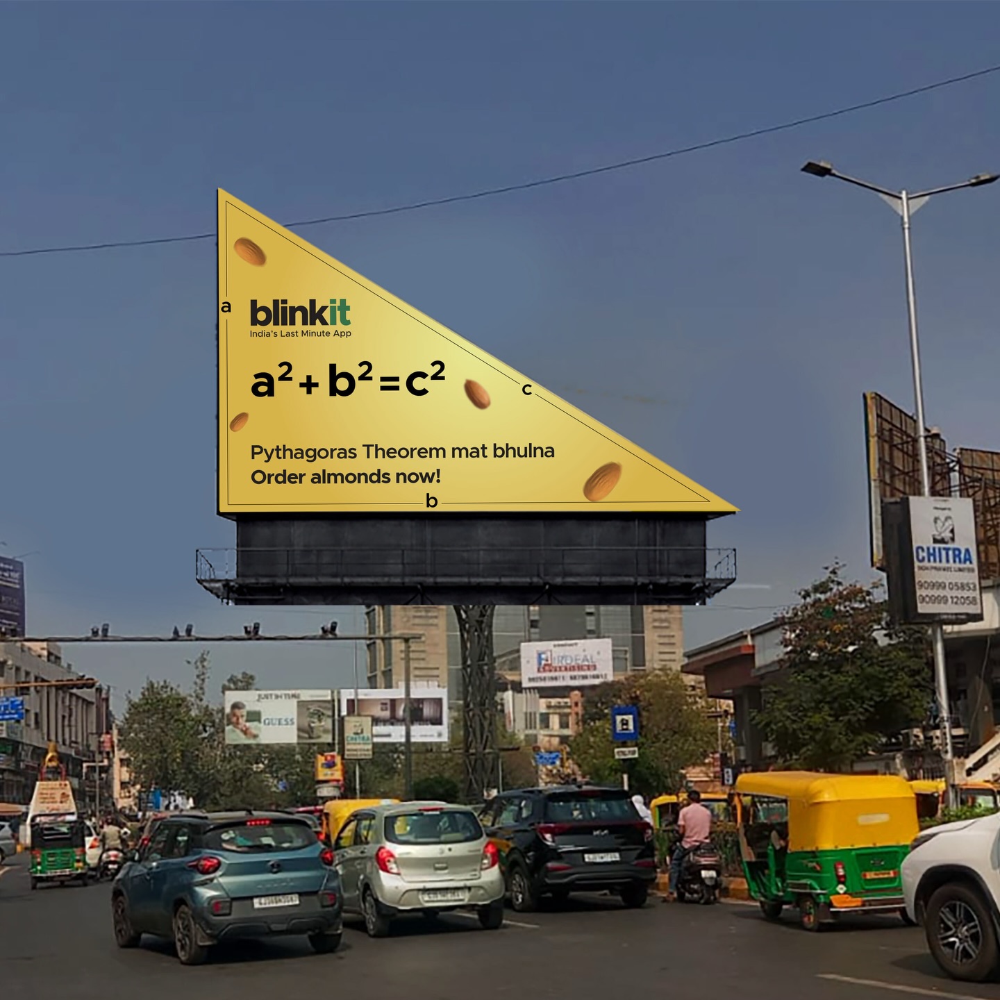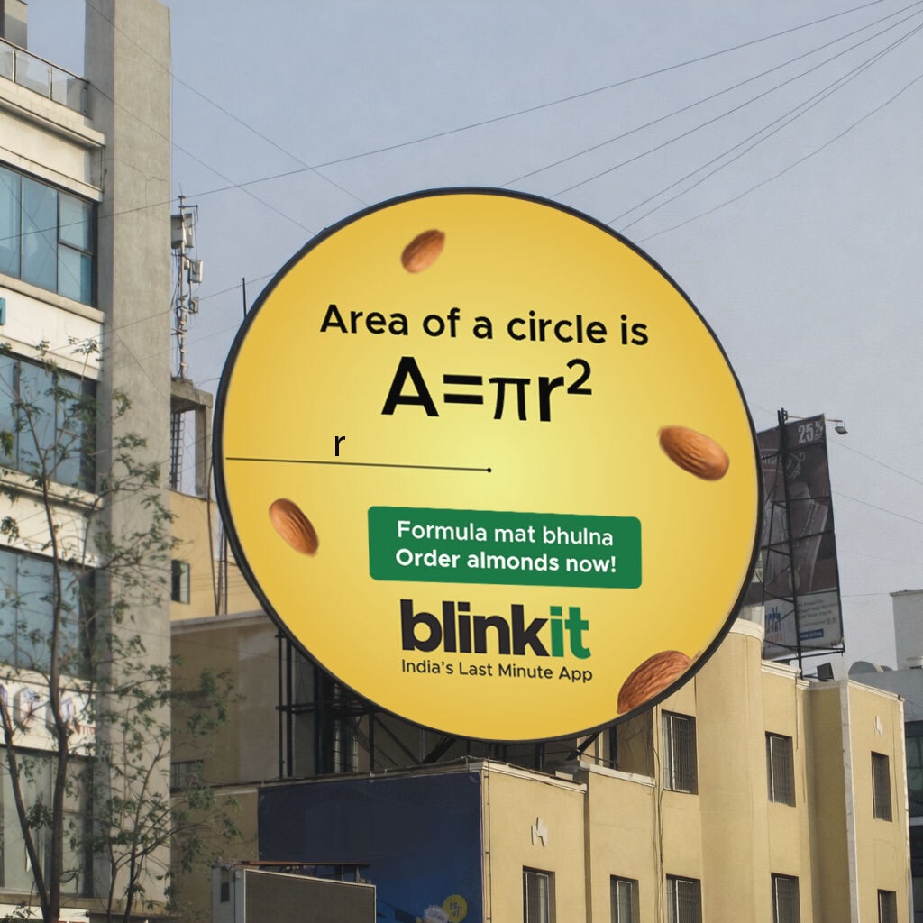 Plutôt que de diffuser un message publicitaire classique, Blinkit a choisi d’utiliser des éléments familiers aux étudiants. Les panneaux reprennent ainsi des formules bien connues comme le théorème de Pythagore ou la formule de l’aire d’un cercle.