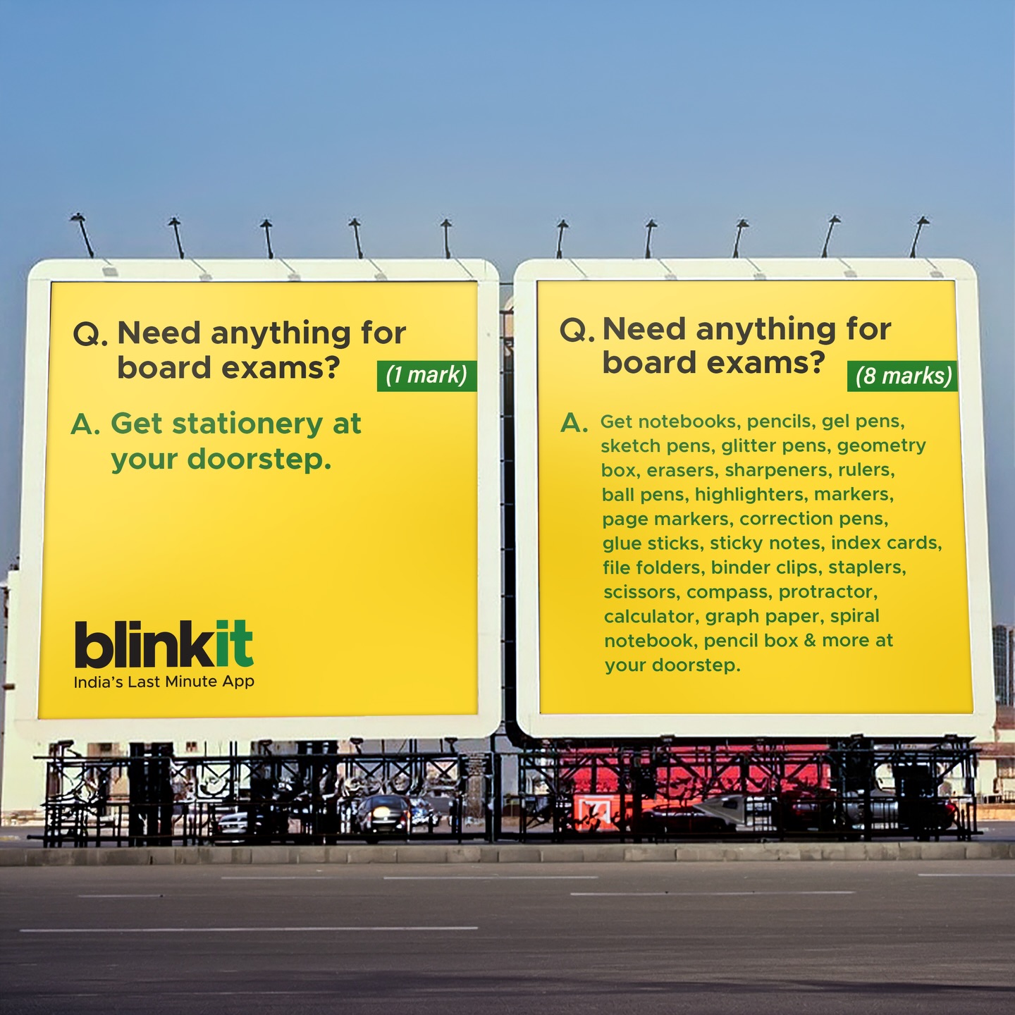 - L’opération joue sur le timing des examens pour rappeler que Blinkit peut livrer rapidement tout le nécessaire pour réviser à la dernière minute.