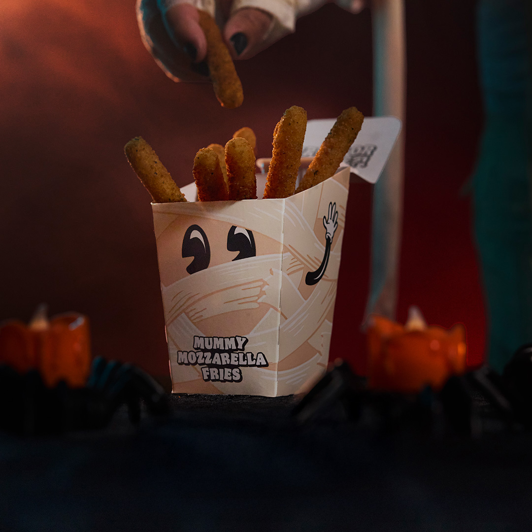 Le clou du spectacle ? Le Jack-O-Lantern Whopper, une version revisitée du mythique burger, servi dans un pain orange flamboyant saupoudré de graines de sésame noires. À ses côtés, les Vampire Nuggets en forme de crocs et de chauves-souris sont proposés dans une petite boîte cercueil. Les amateurs de fromage fondant ne sont pas oubliés avec les Mummy Mozzarella Fries, des bâtonnets croustillants “enveloppés” comme des momies et accompagnés d’une sauce marinara.