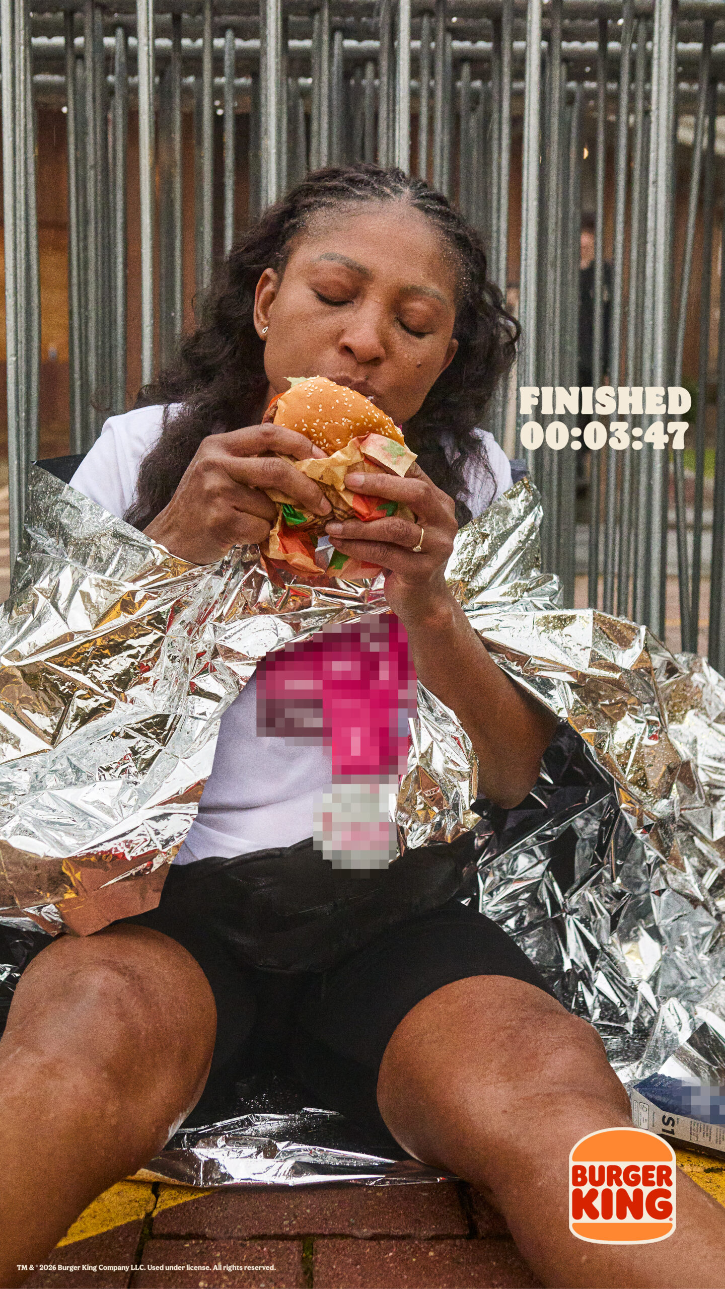 Pour illustrer cette idée, Burger King met en scène de vrais coureurs. Photographiés juste après la course, ils apparaissent médailles autour du cou, encore enveloppés dans leur couverture de survie. Tous dégustent un Whopper, capturant ce moment de bascule entre fatigue et plaisir.