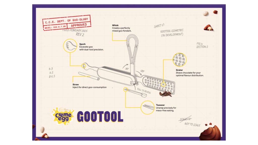 - Cadbury lance le GooTool, un gadget multi-outils pour manger ses Creme Eggs de différentes façons, avec cuillère, râpe, paille ou fouet.
