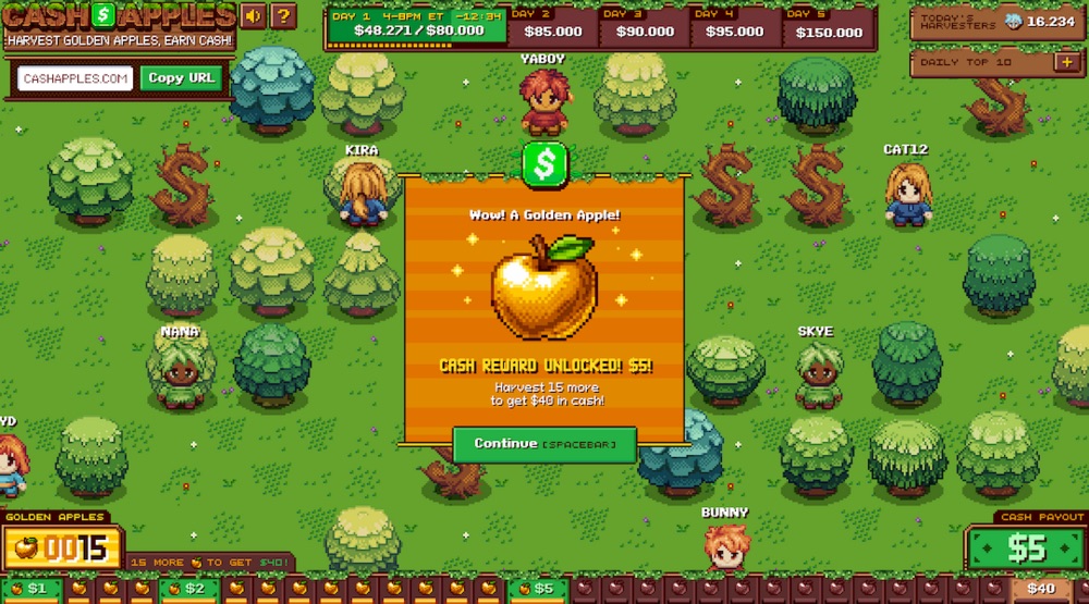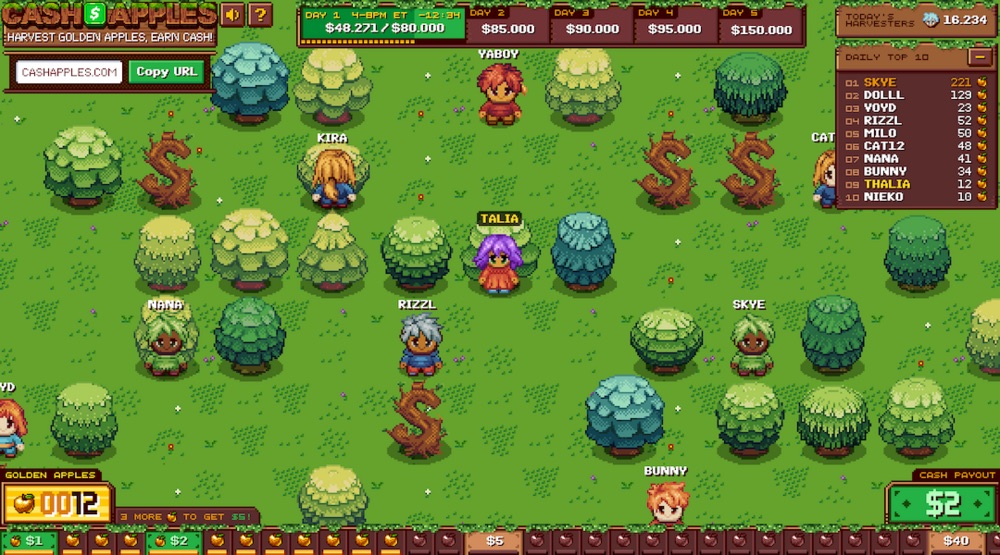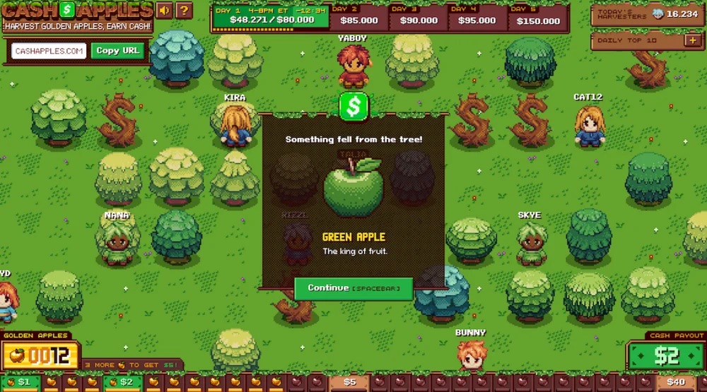 Cash Apples est un jeu accessible directement depuis un navigateur web. Après s’être connecté avec son compte Cash App, le joueur choisit un personnage puis explore un verger en pixel art où il peut cliquer sur différents arbres pour les secouer.