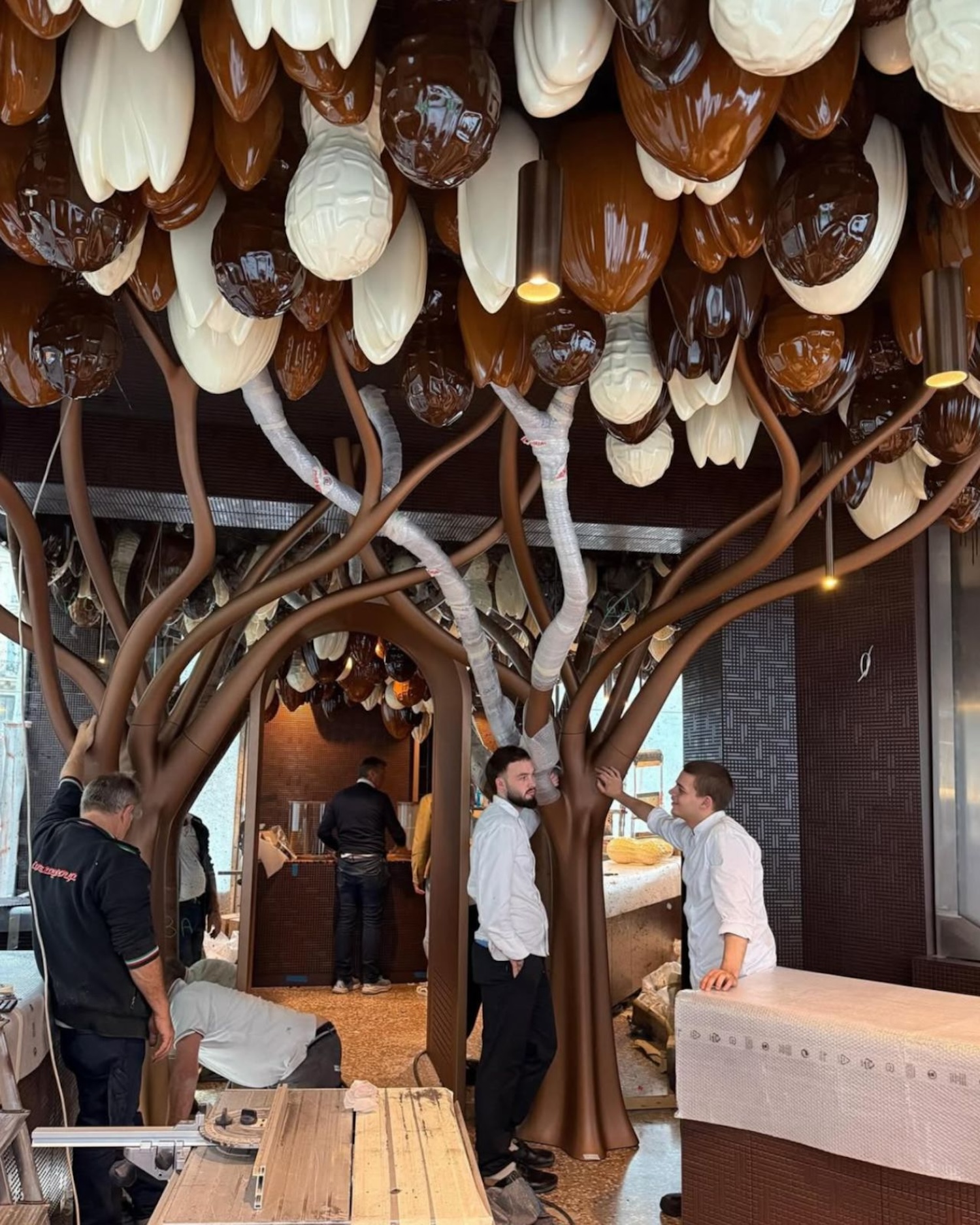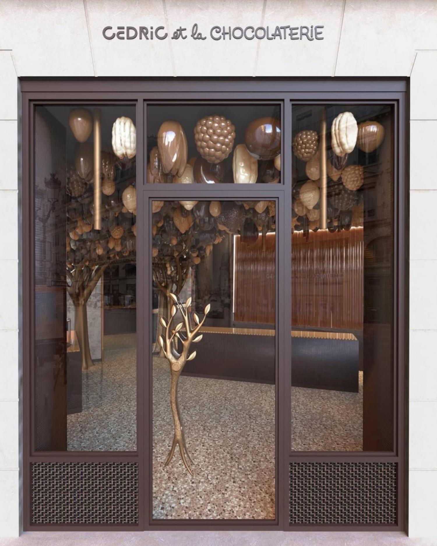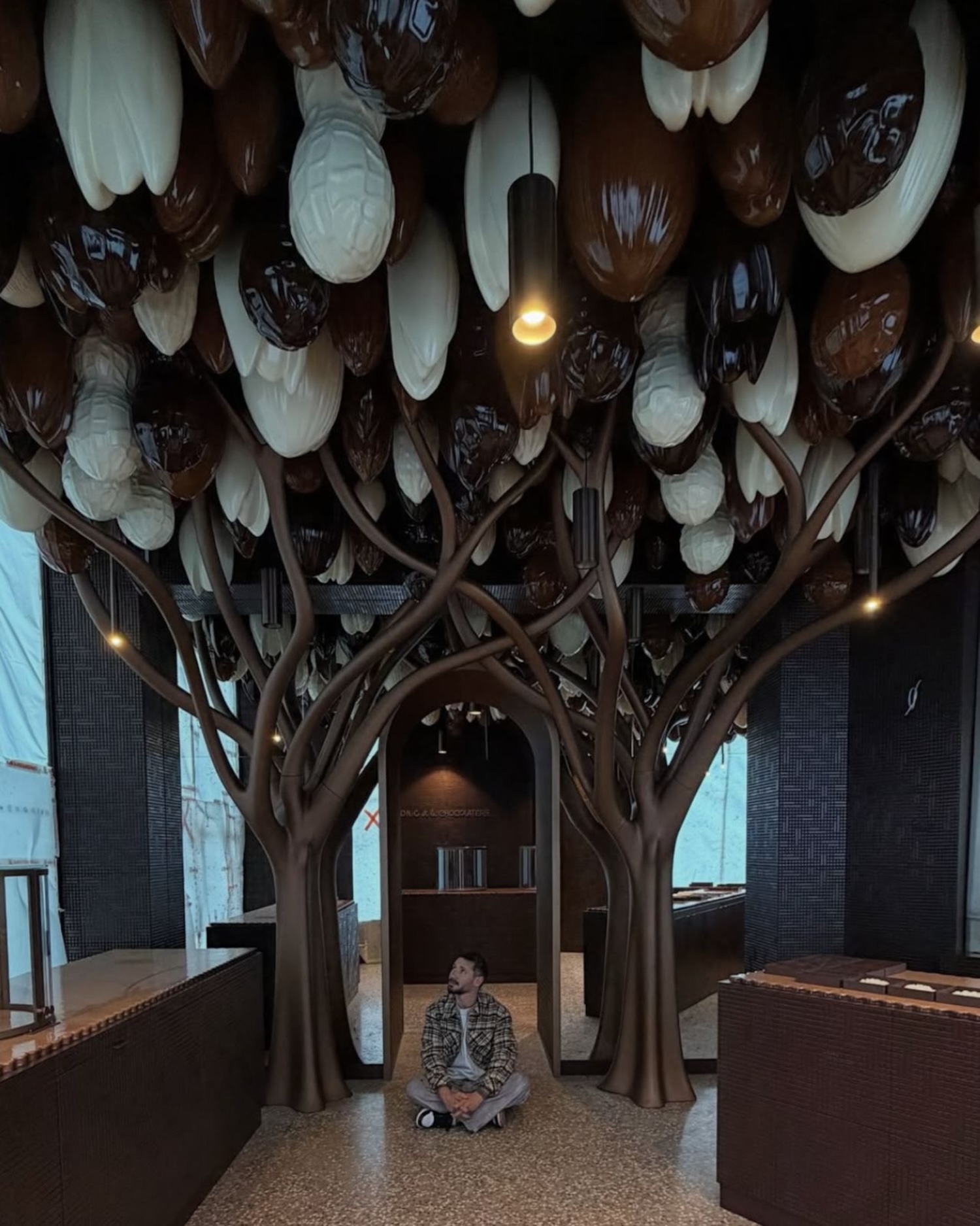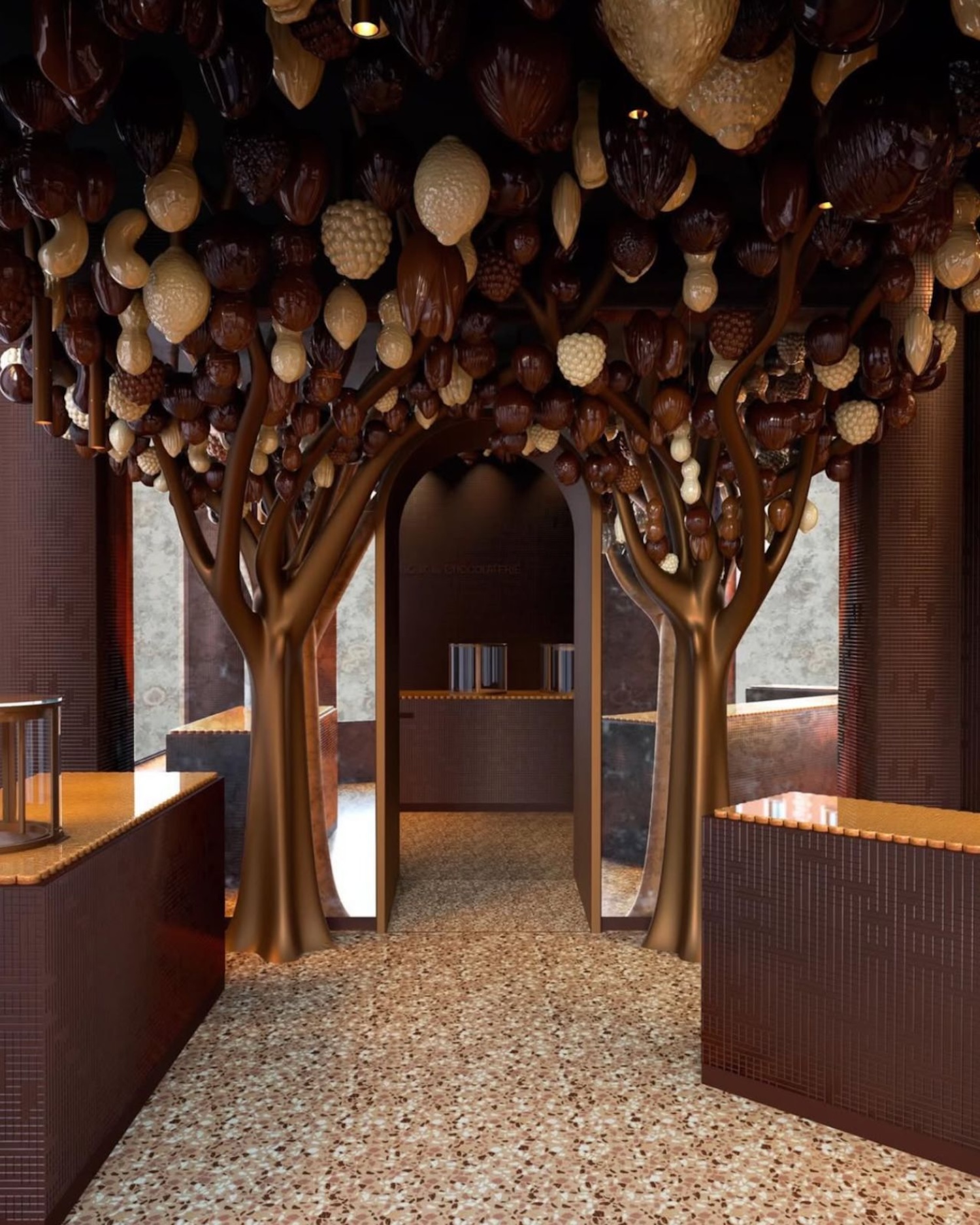 Annoncée sur Instagram, la chocolaterie dévoile un univers visuel inspiré de Charlie et la chocolaterie. Les premières images révèlent un décor féérique : arbres en chocolat, cabosses suspendues et petits beurres géants trônant sur les comptoirs. Une scénographie immersive qui annonce un lieu où le cacao devient spectacle et où chaque détail participe à la magie.