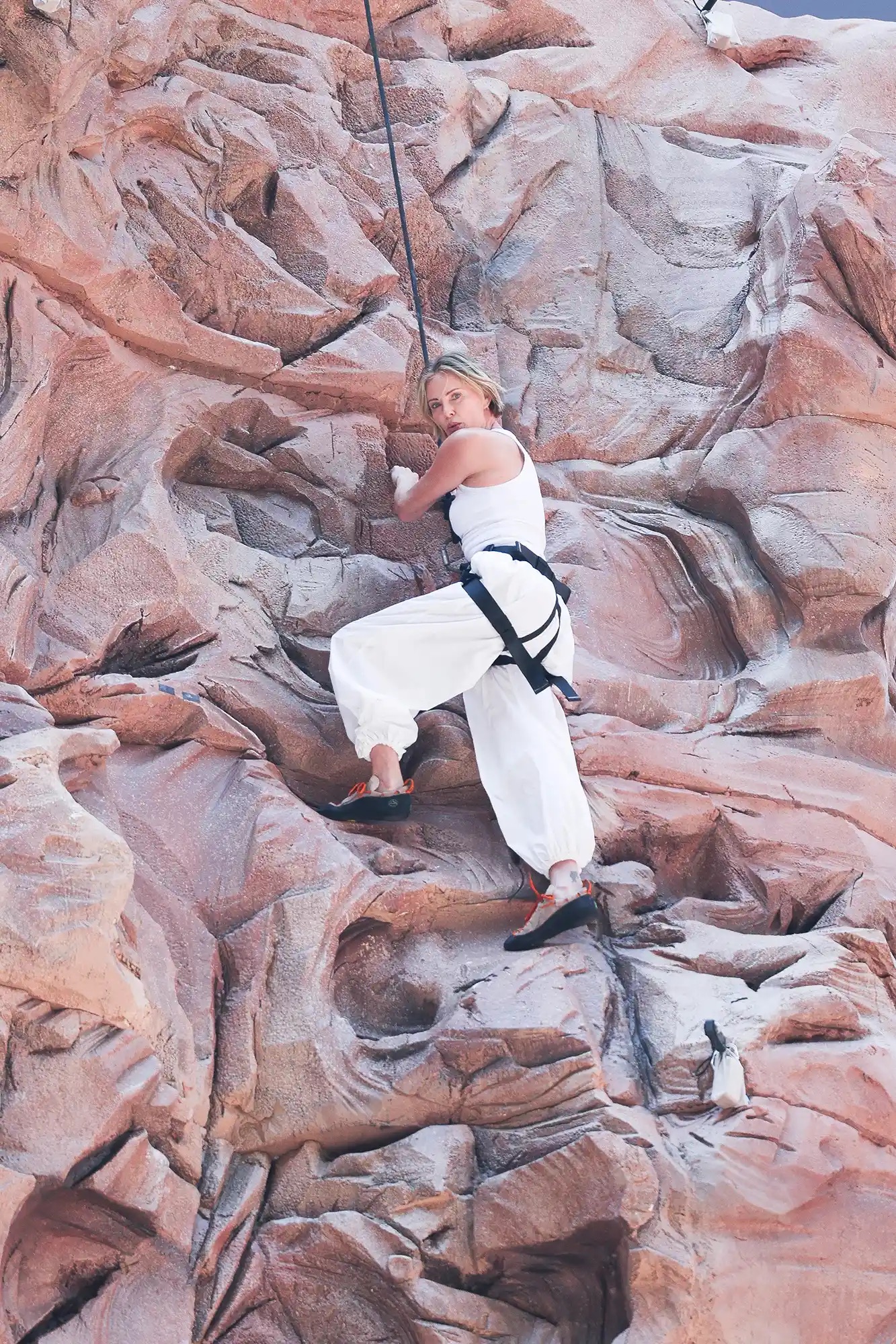 L’actrice s’est d’ailleurs entraînée pendant plusieurs semaines à l’escalade pour préparer ce rôle. En reproduisant ce geste en conditions réelles, la campagne prolonge l’univers du film dans la vie réelle.
