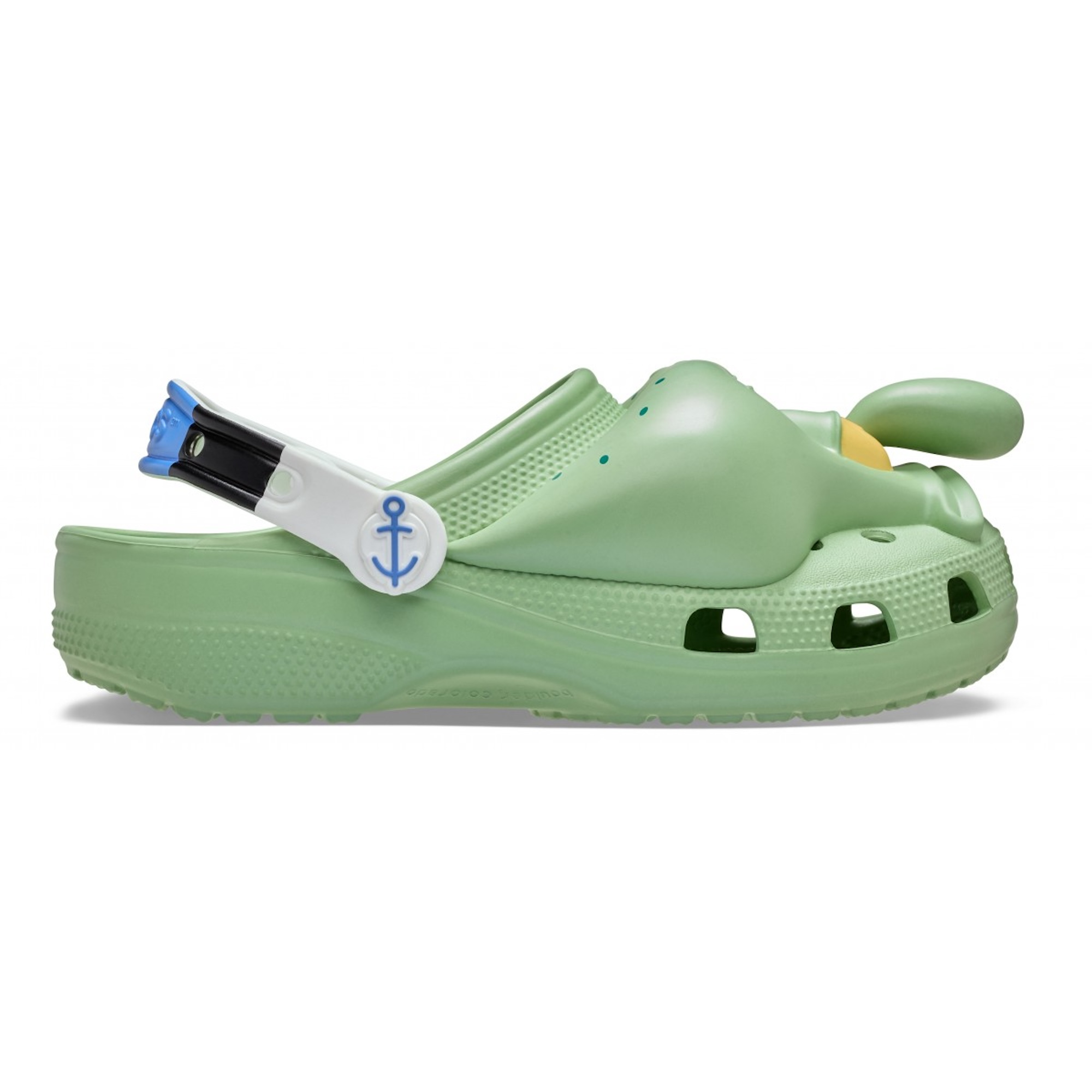 Le sabot reprend l’intégralité du visage de Carlo Tentacule en relief, avec son long nez proéminent et son regard à moitié fermé, sculptés directement sur l’avant de la chaussure. Le choix d’un vert pastel marin vient renforcer l’identité du personnage, immédiatement reconnaissable pour les fans de la série.