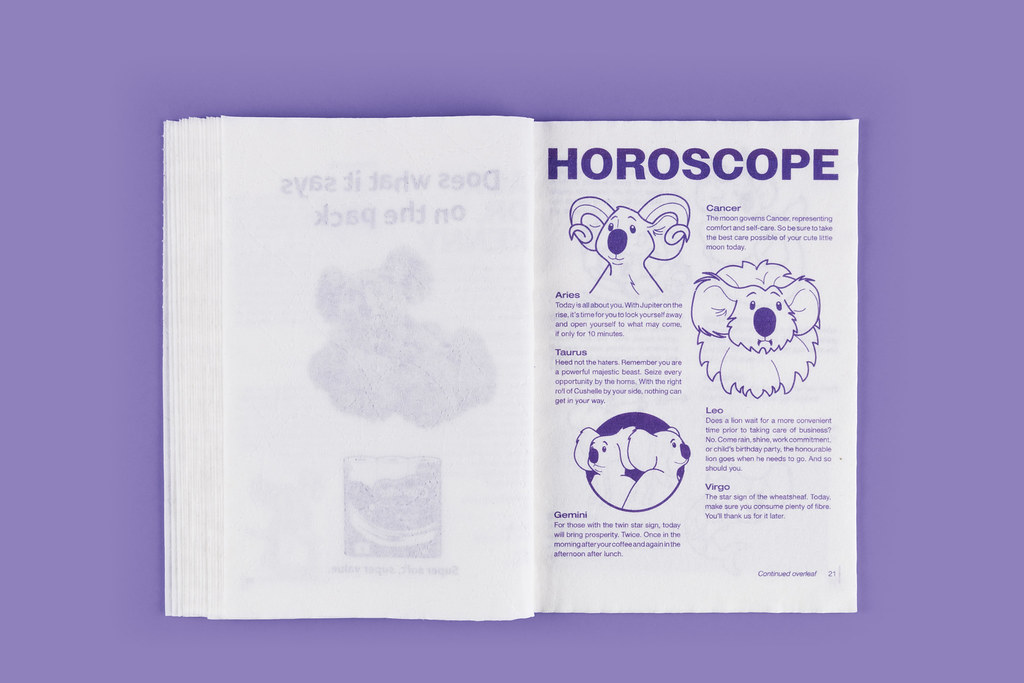 Le contenu joue la carte de l’humour avec des jeux, des horoscopes, des parodies et même un “softword” (version revisitée des mots croisés). Le tout est imprimé avec une encre adaptée, sans danger pour la peau et compatible avec une utilisation classique. Une idée qui détourne avec malice les codes du print pour en faire un objet aussi éphémère que fonctionnel.