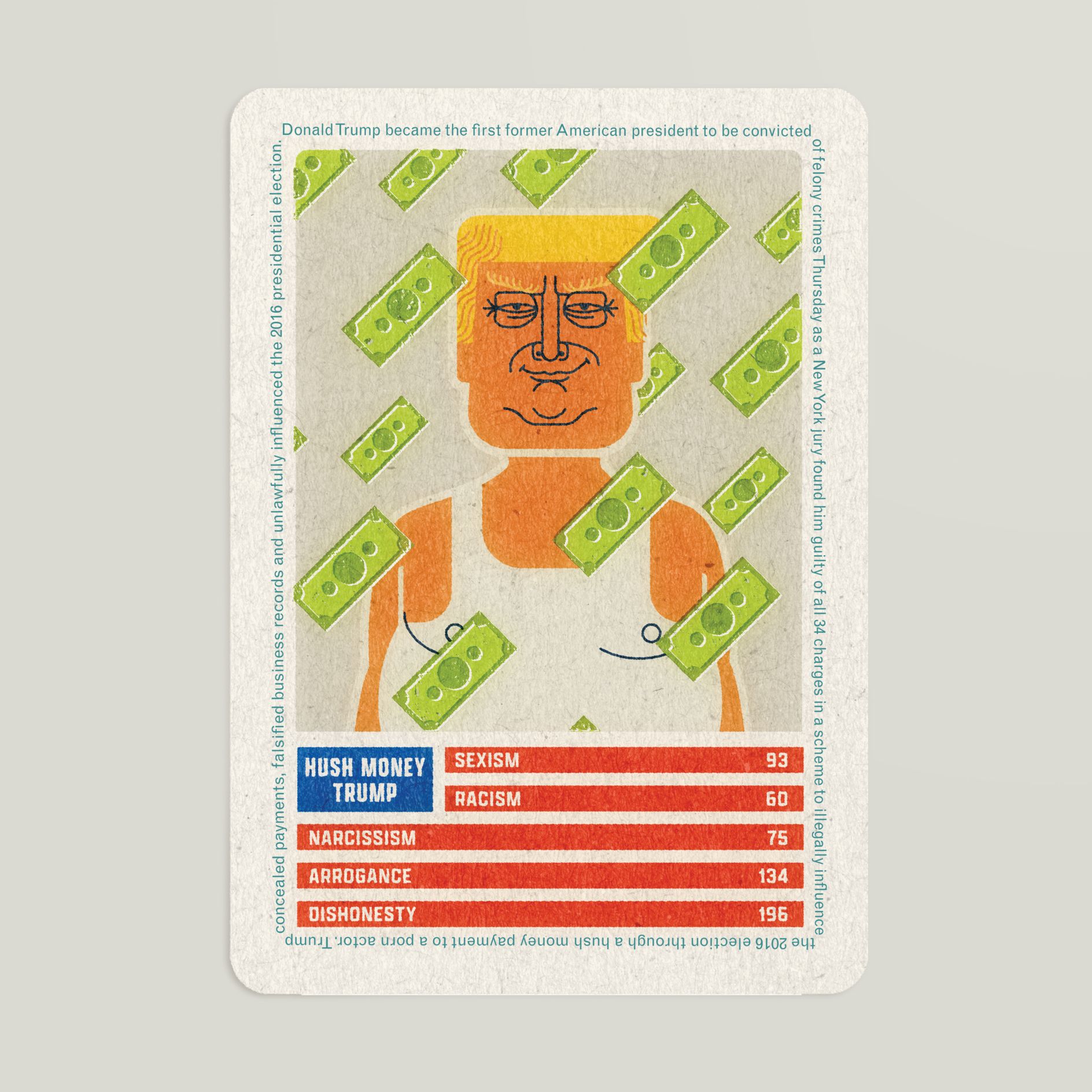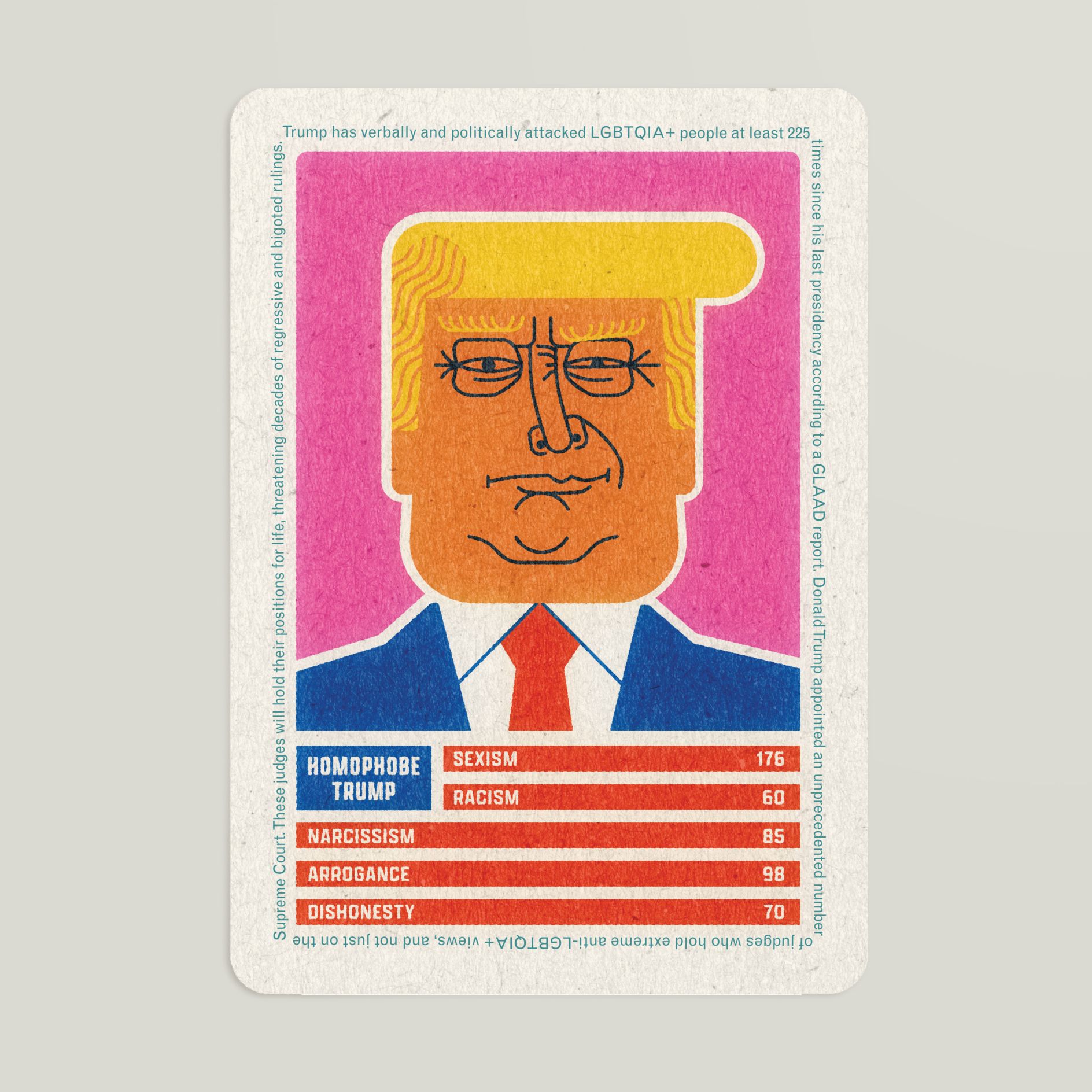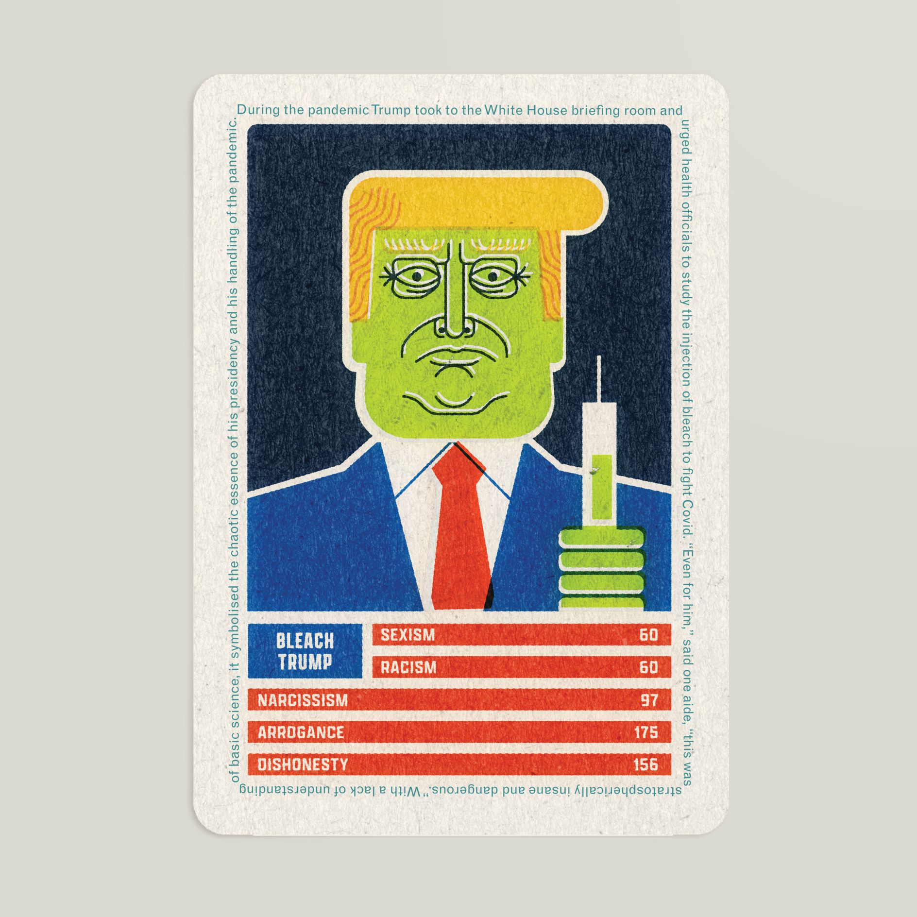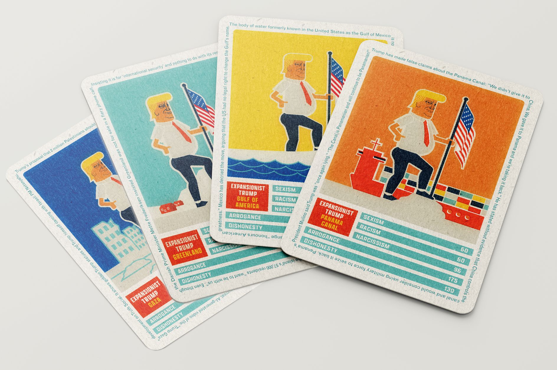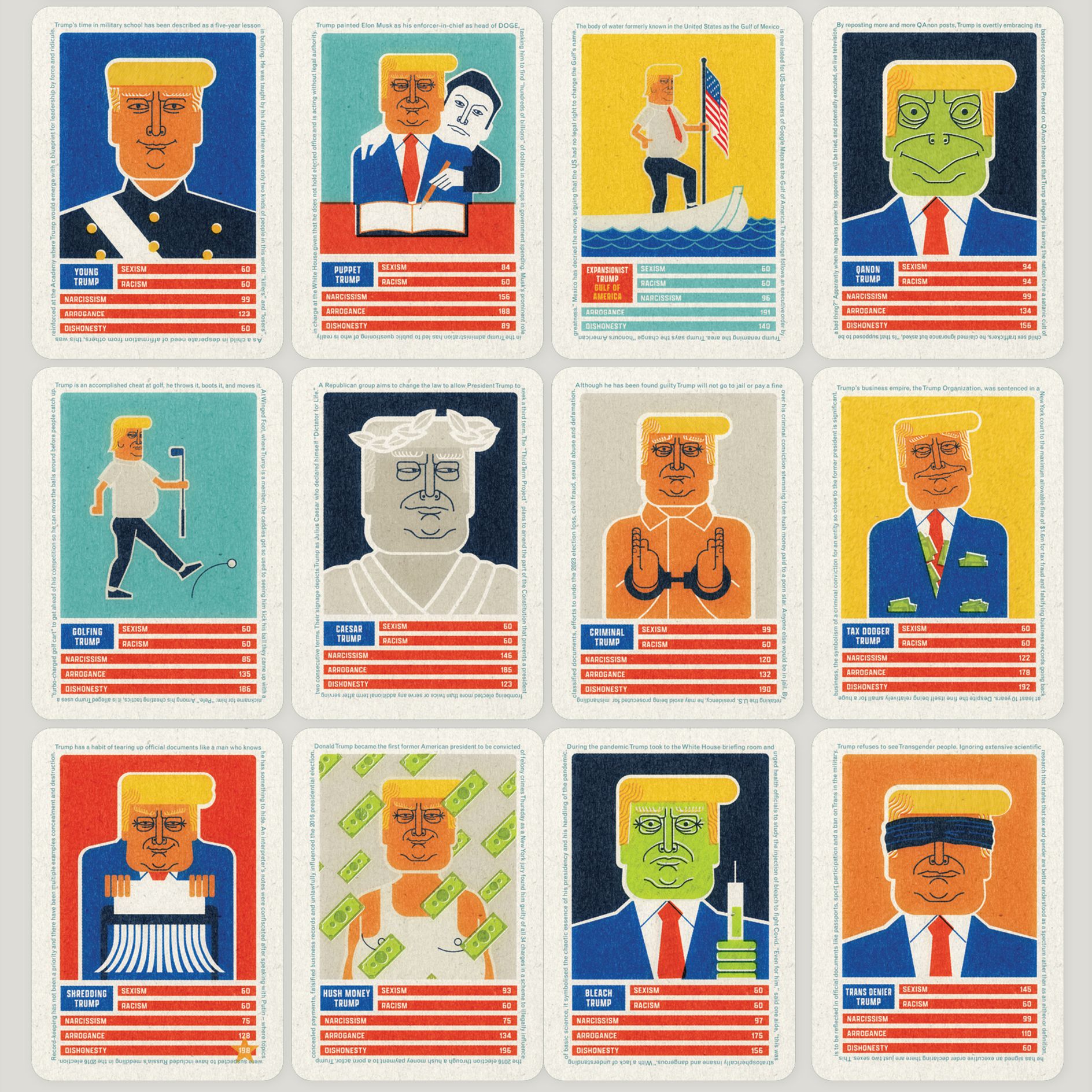 Pensé comme une soupape créative plus que comme un manifeste militant, le projet détourne les codes du célèbre jeu de cartes “Top Trumps” pour proposer une lecture grinçante de la carrière du président américain. Une manière de commenter l’époque sans passer par le débat frontal, mais en invitant plutôt au jeu… et à la discussion.