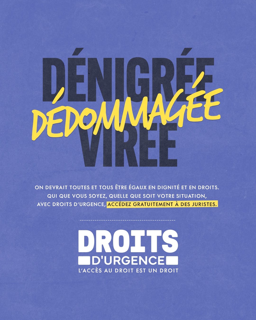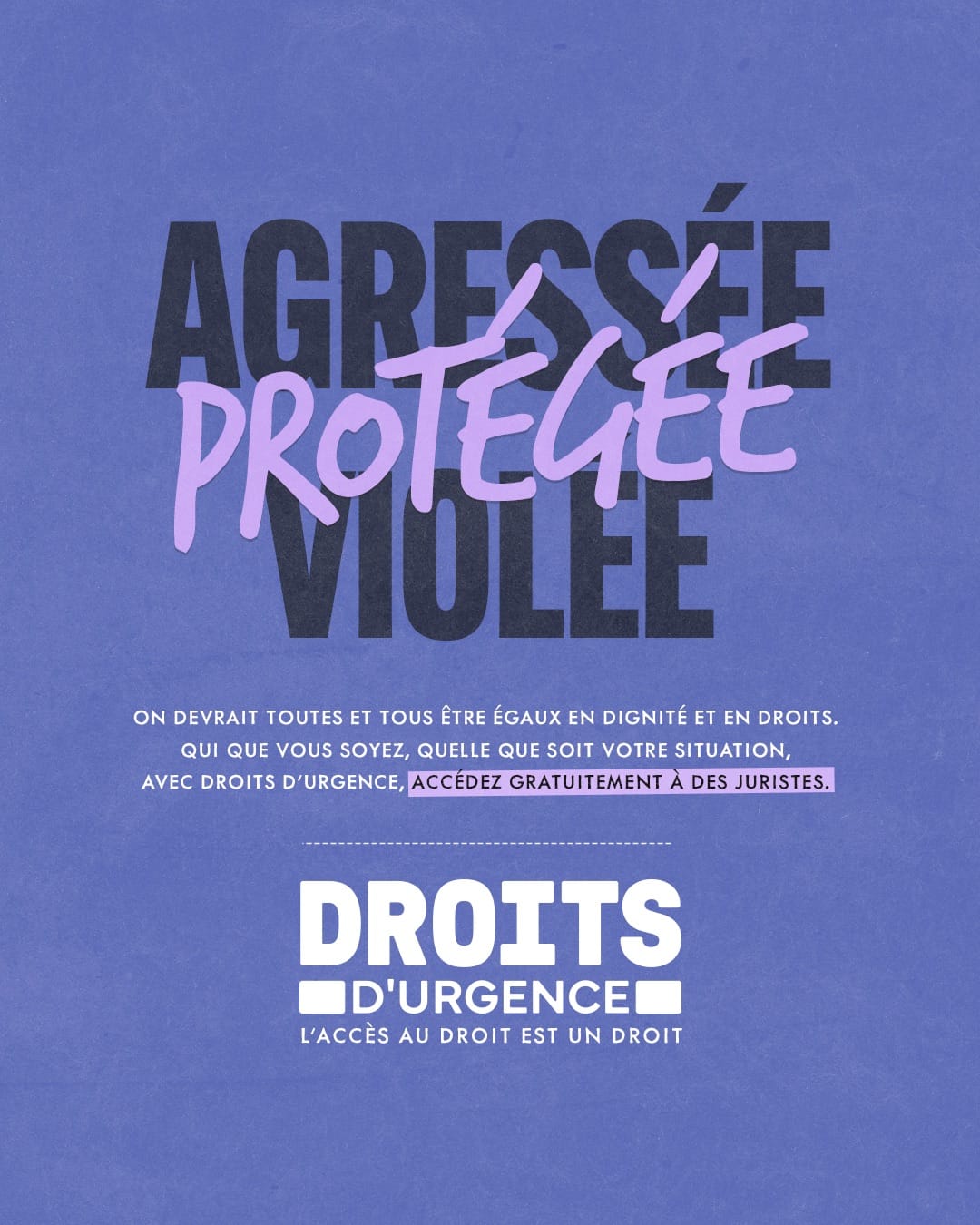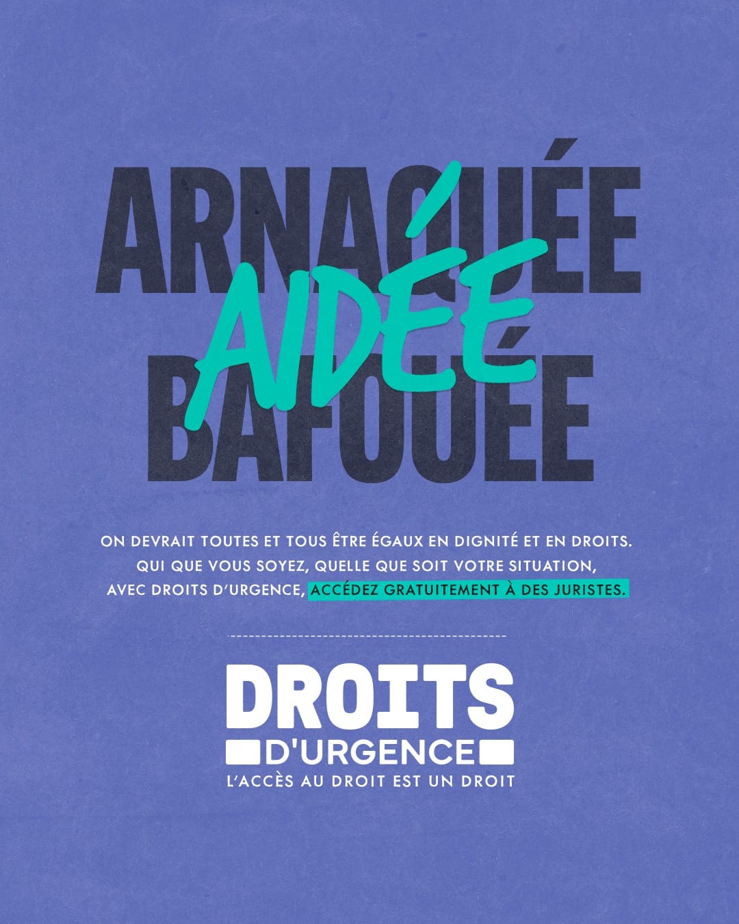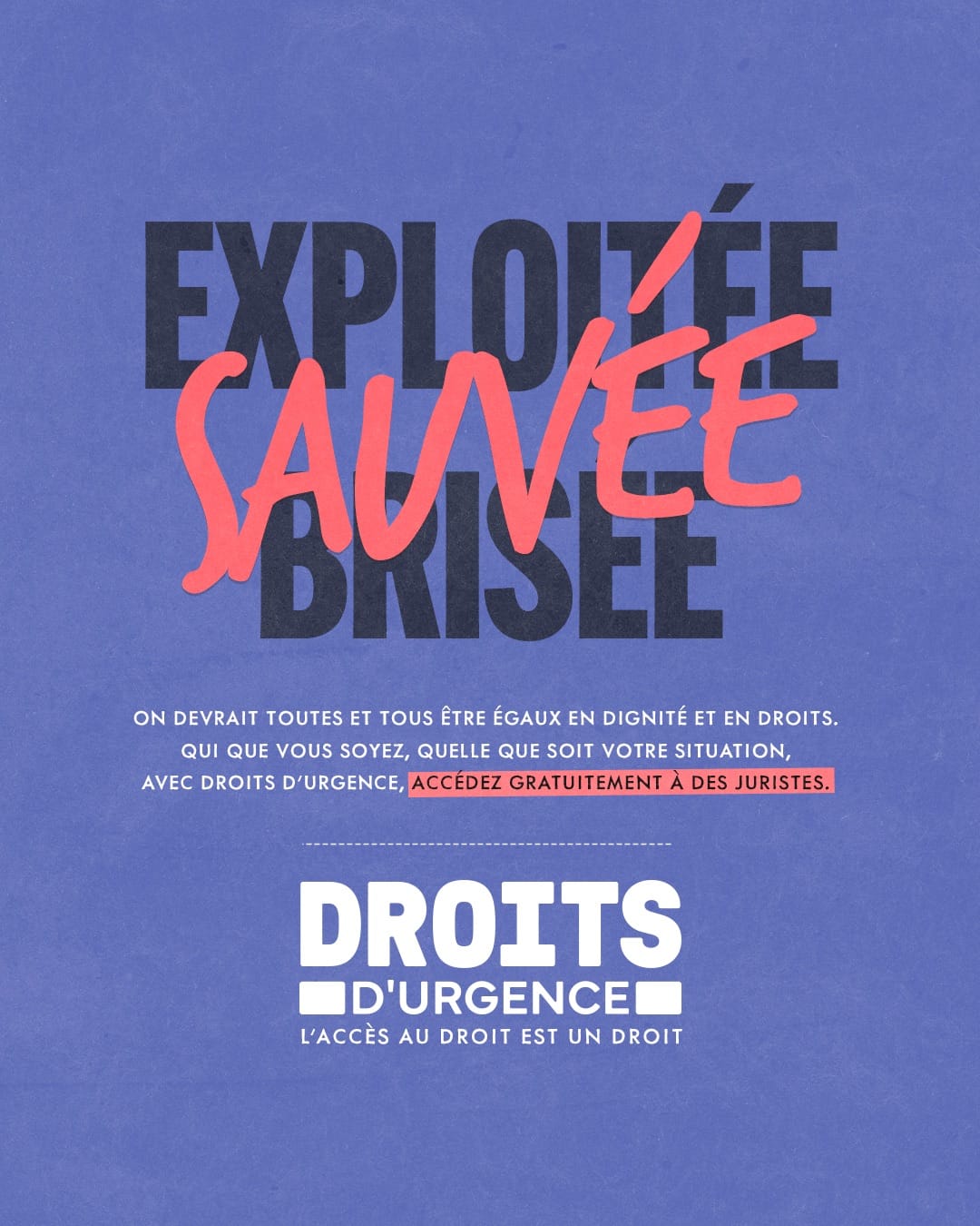 « On devrait toutes et tous être égaux en dignité et en droits. Qui que vous soyez, quelle que soit votre situation, avec Droits d’urgence, accédez gratuitement à des juristes. »