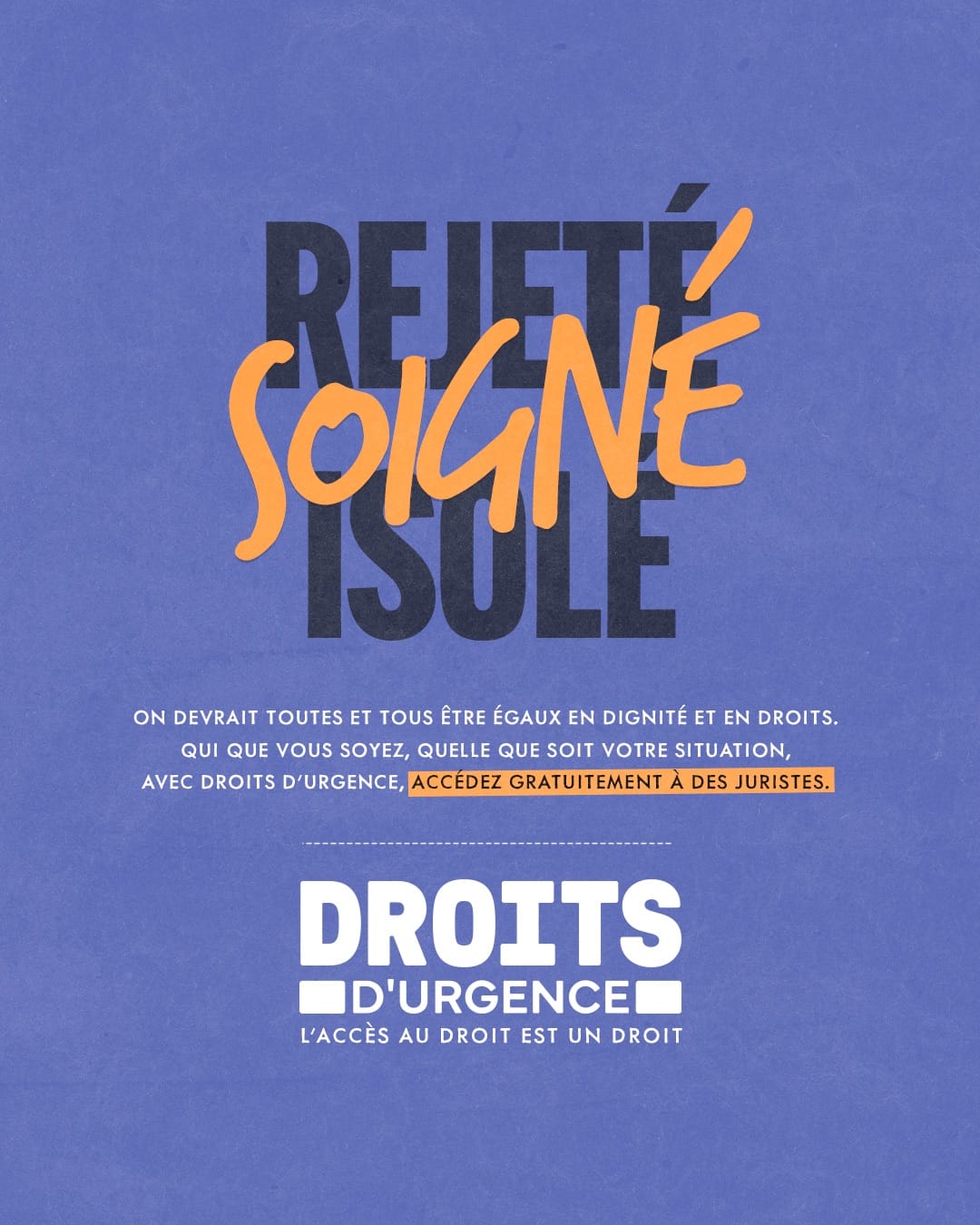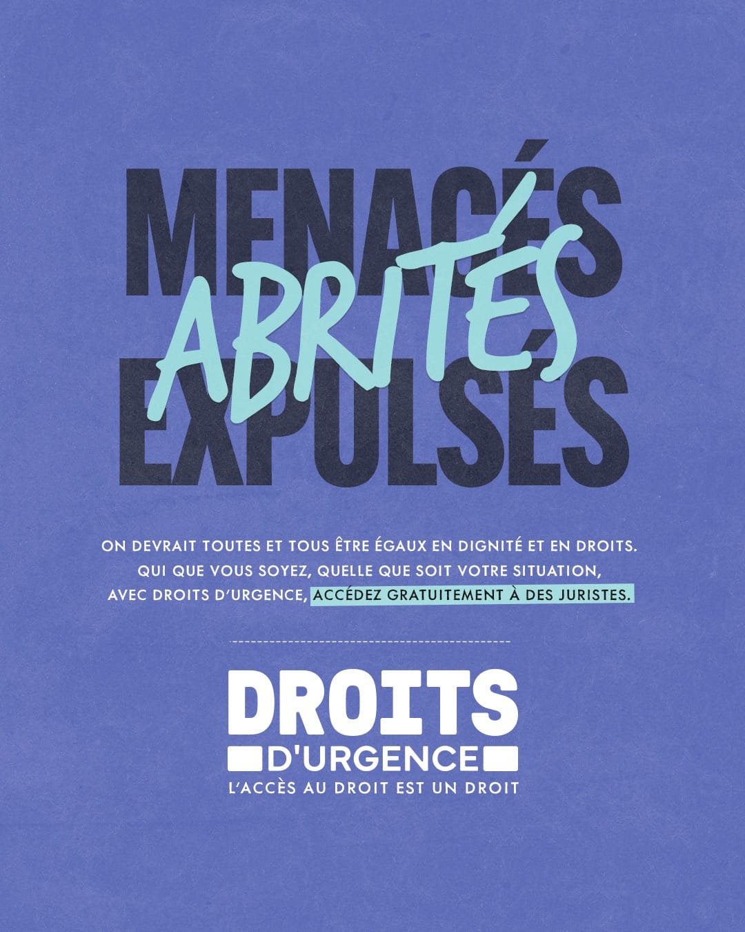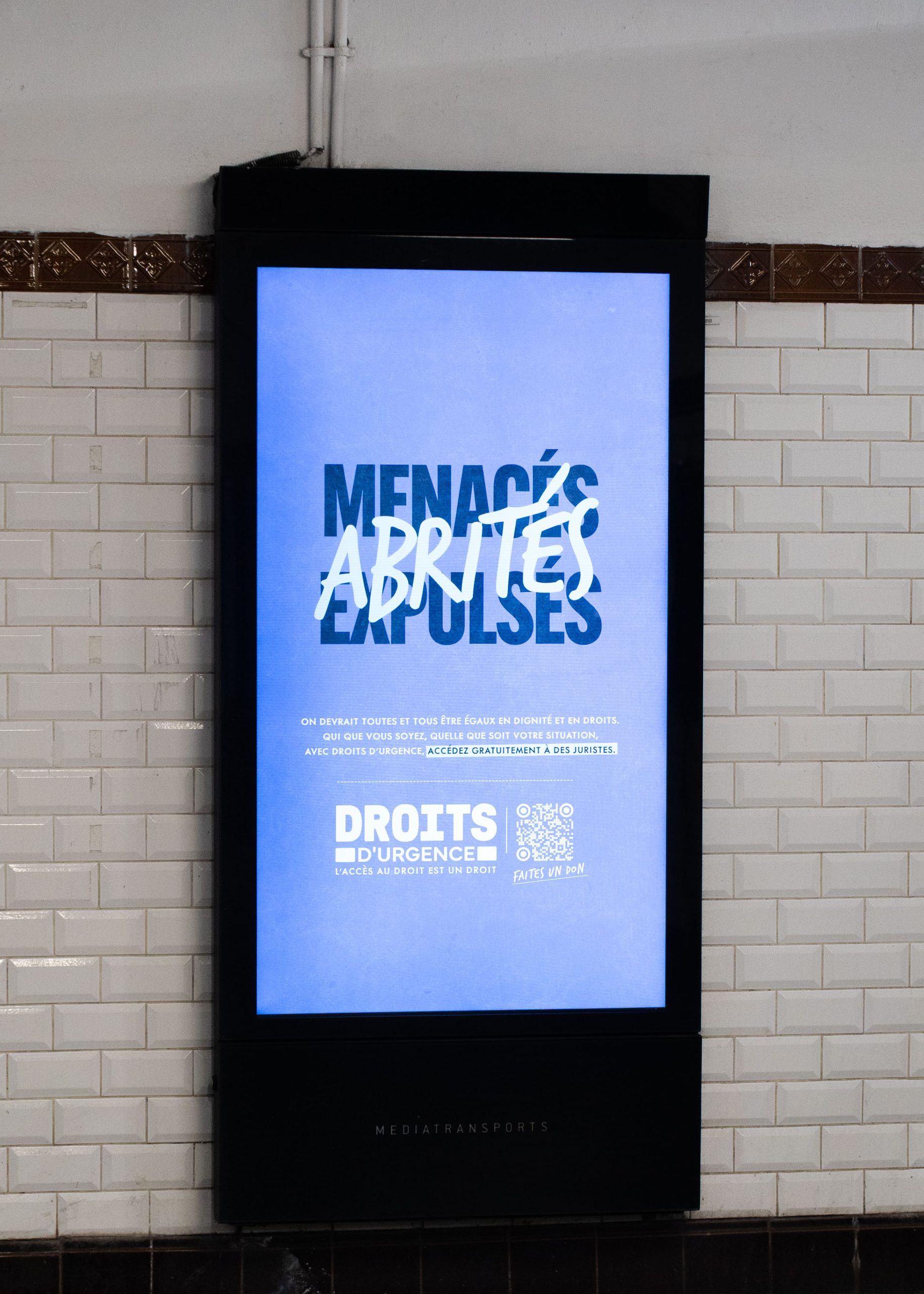 Conçue par l’agence Creapills, la campagne met en scène des affiches où deux mots évoquent une situation d’injustice avant d’être recouverts par un troisième mot qui apporte une réponse, celle de Droits d’urgence. « Menacés, Expulsés… Abrités ». « Agressée, Violée… Protégée ». Ou encore « Rejeté, Isolé… Soigné ».