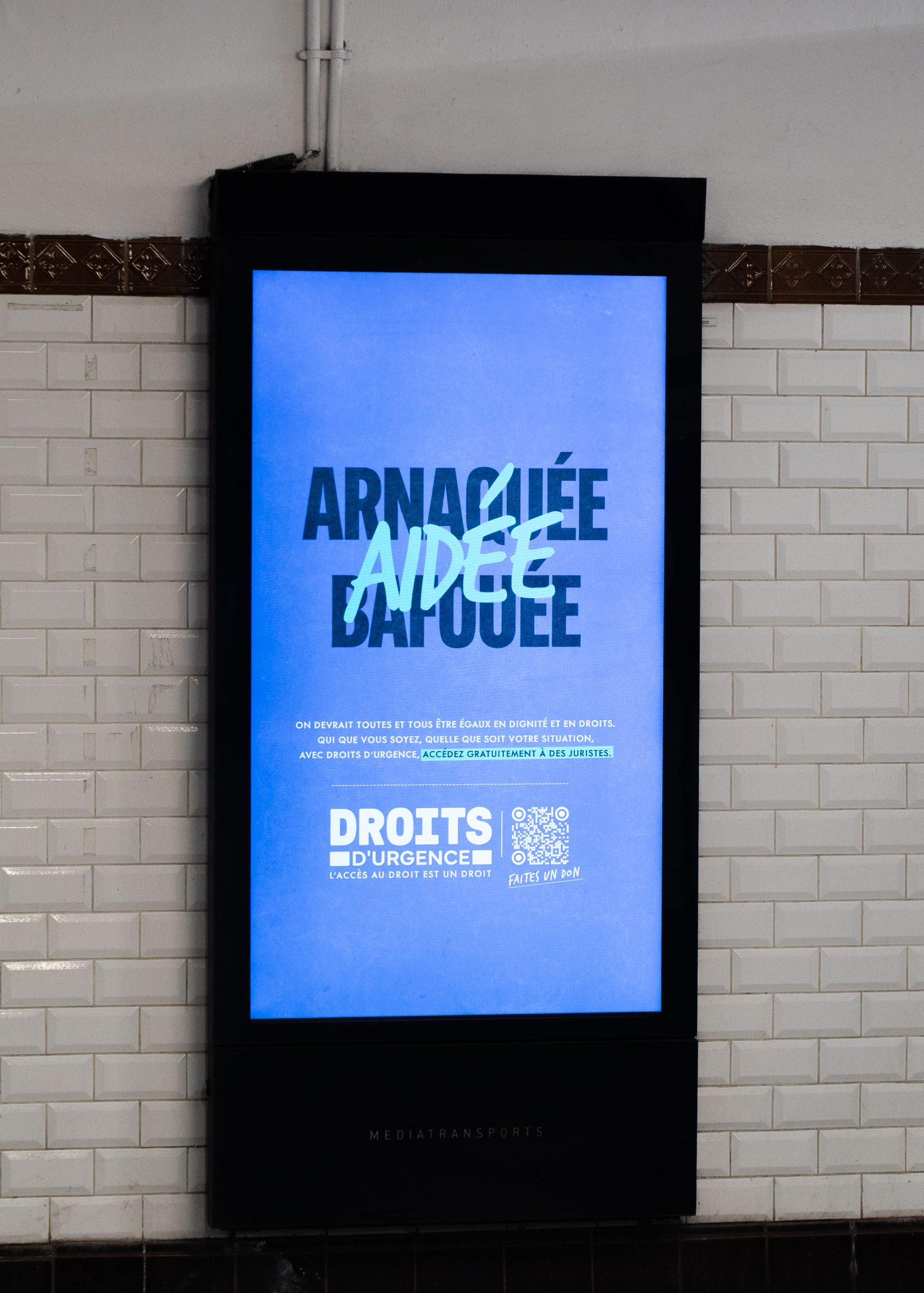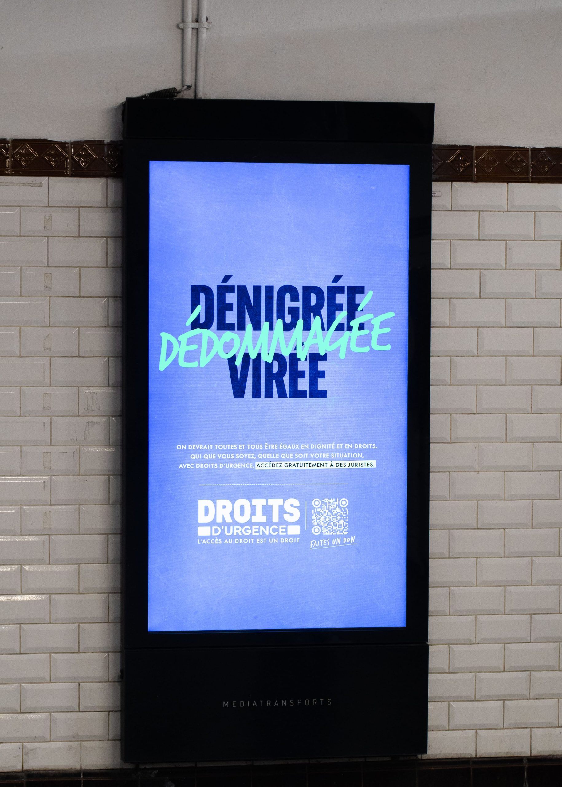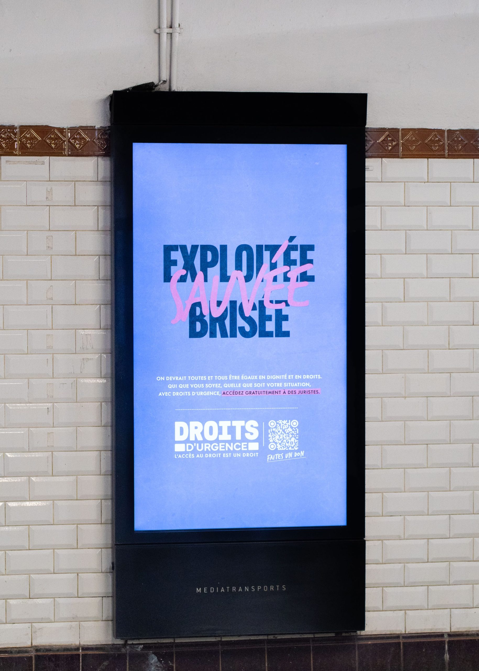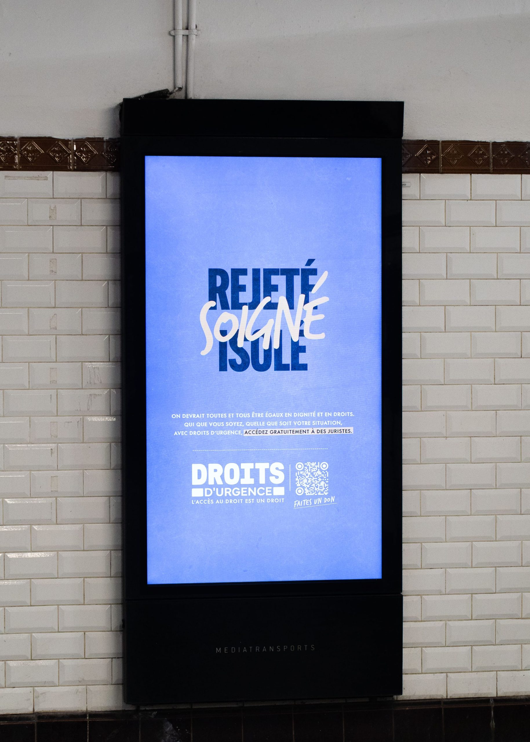 Conçue par l’agence Creapills, la campagne met en scène des affiches où deux mots évoquent une situation d’injustice avant d’être recouverts par un troisième mot qui apporte une réponse, celle de Droits d’urgence. « Menacés, Expulsés… Abrités ». « Agressée, Violée… Protégée ». Ou encore « Rejeté, Isolé… Soigné ».