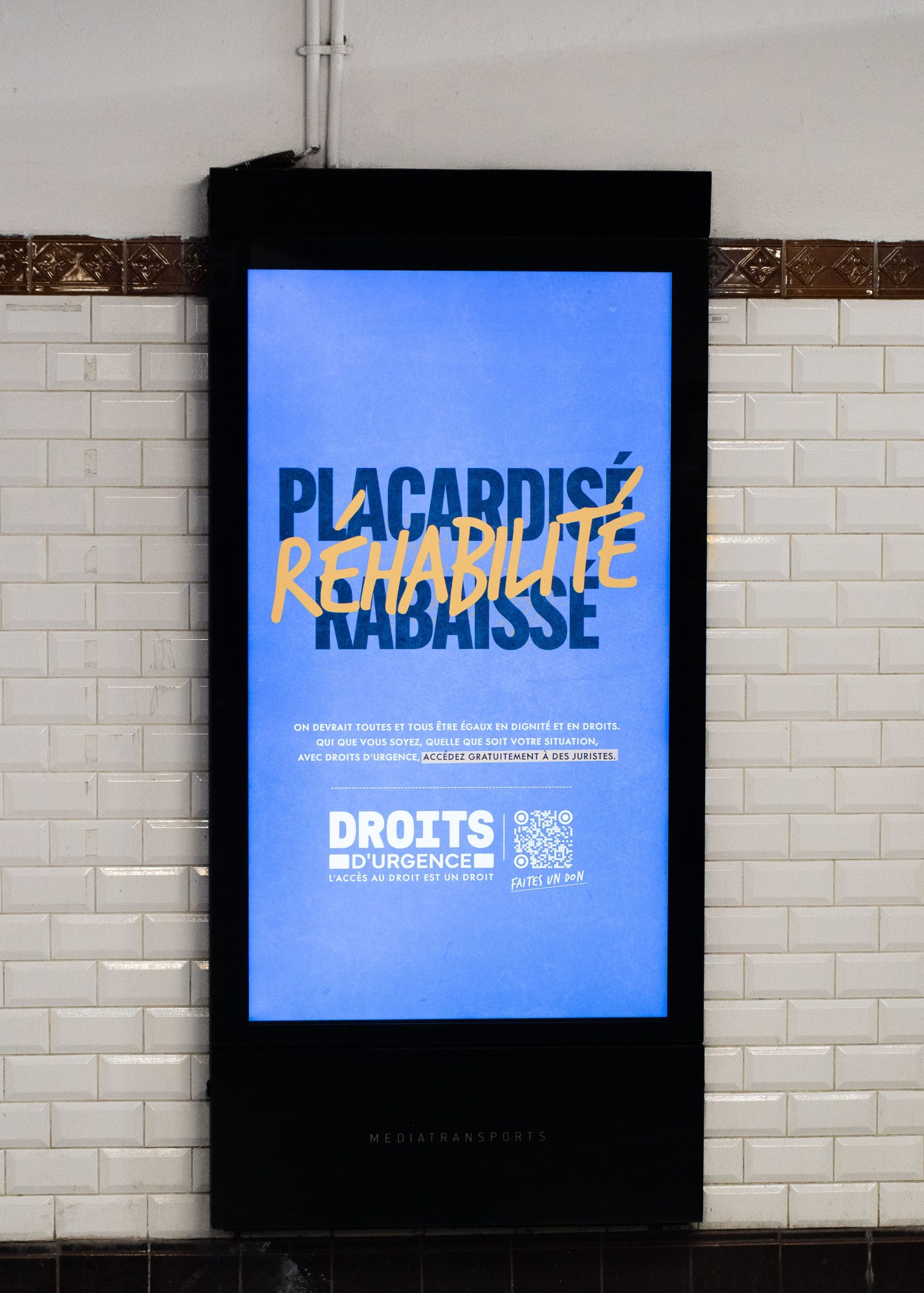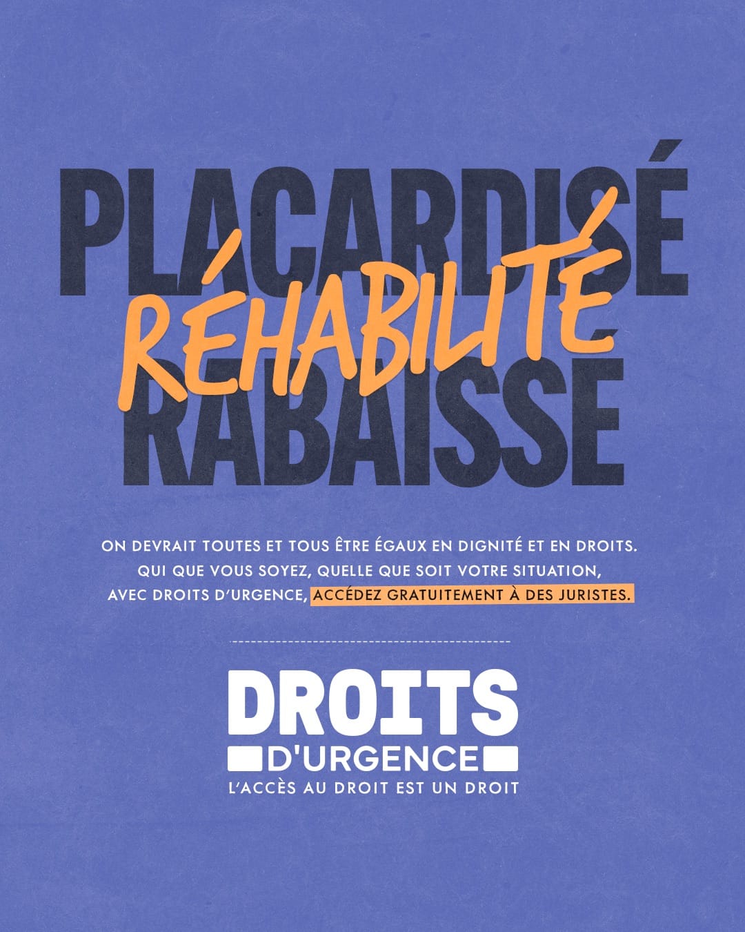 Cette écriture simple et directe traduit parfaitement la philosophie de Droits d’urgence : rendre le droit compréhensible, humain et accessible. Chaque affiche se conclut par une phrase manifeste :