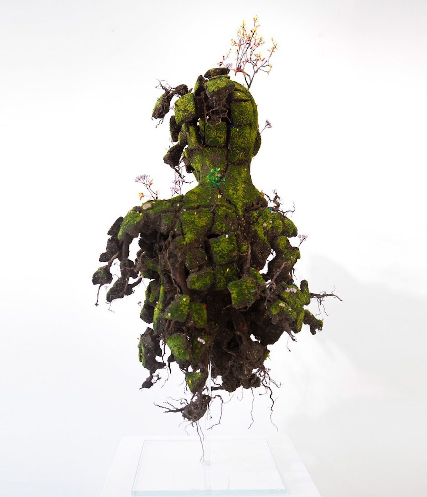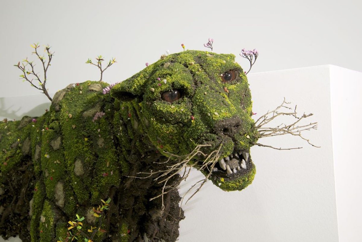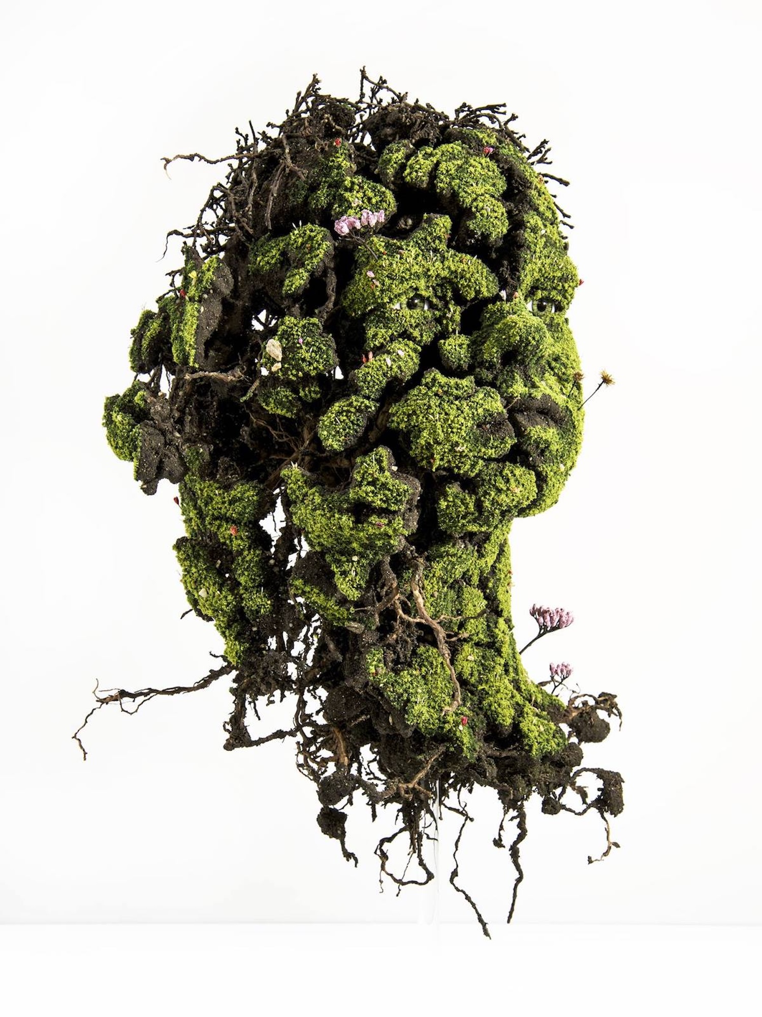 Émeric Chantier compose ses œuvres à partir de matériaux contrastés : mousse, brindilles, résine ou bois, qu’il assemble avec minutie selon des techniques de moulage et de collage. Ce mélange entre le naturel et le manufacturé donne naissance à des créatures hybrides : animaux, visages, ou corps humains semblant surgir d’un monde parallèle.