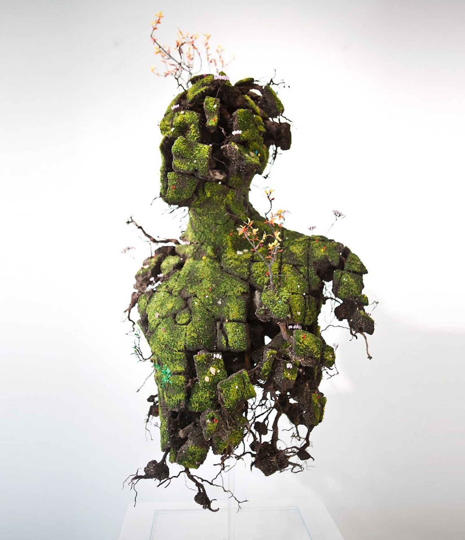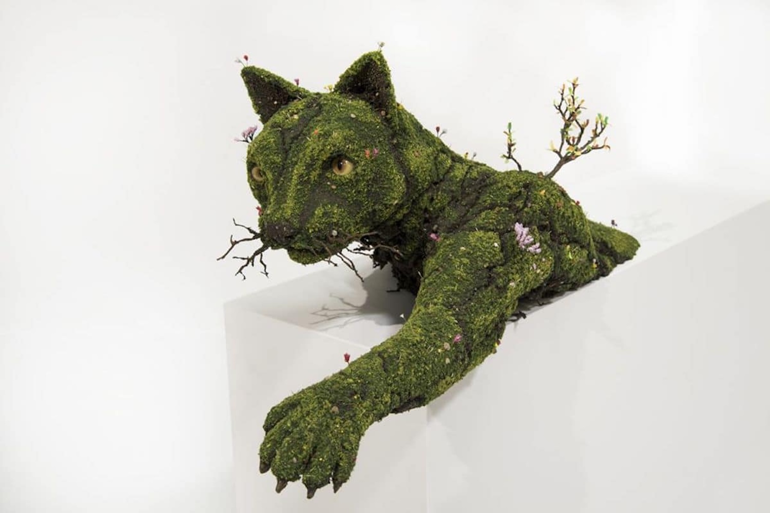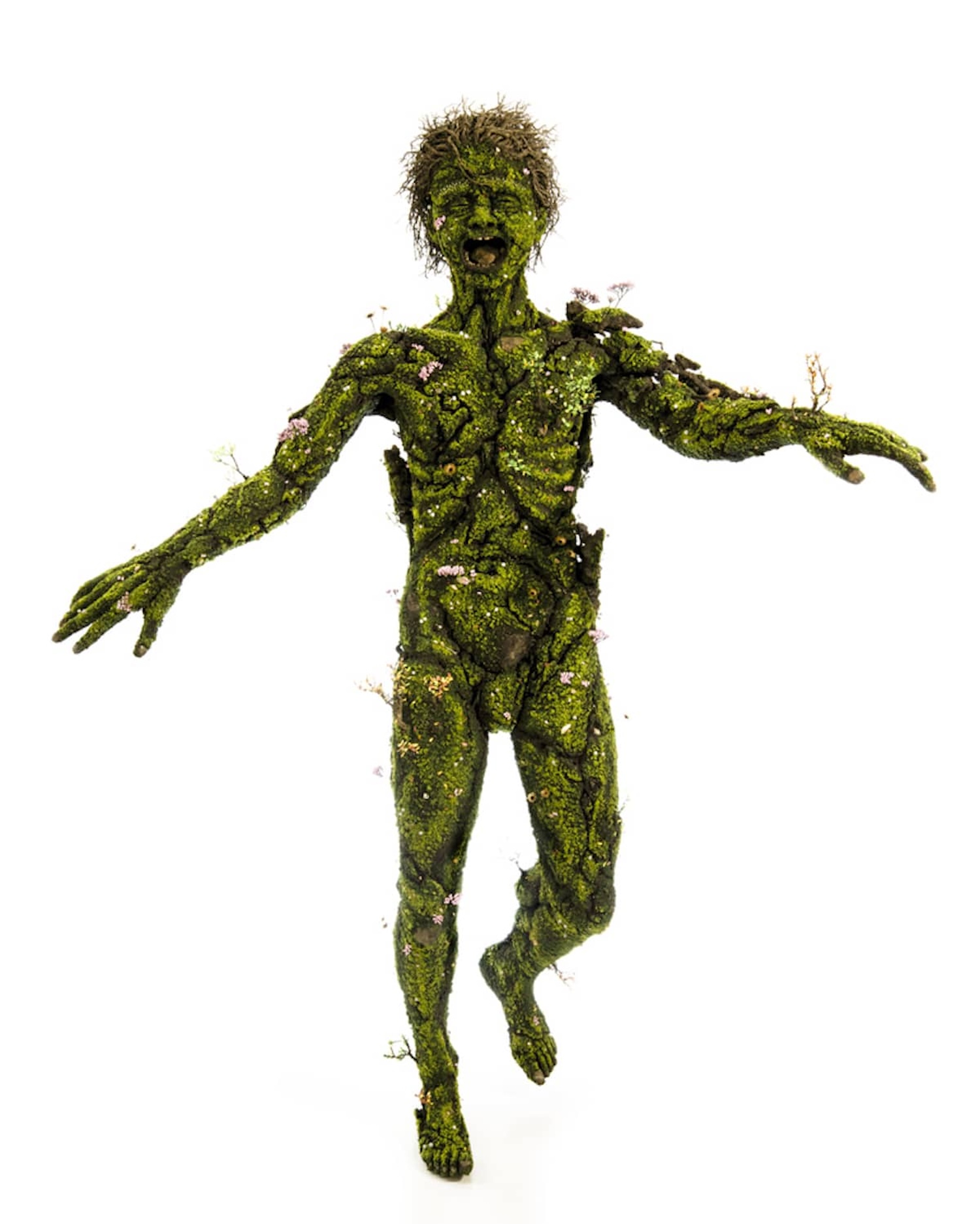Émeric Chantier compose ses œuvres à partir de matériaux contrastés : mousse, brindilles, résine ou bois, qu’il assemble avec minutie selon des techniques de moulage et de collage. Ce mélange entre le naturel et le manufacturé donne naissance à des créatures hybrides : animaux, visages, ou corps humains semblant surgir d’un monde parallèle.