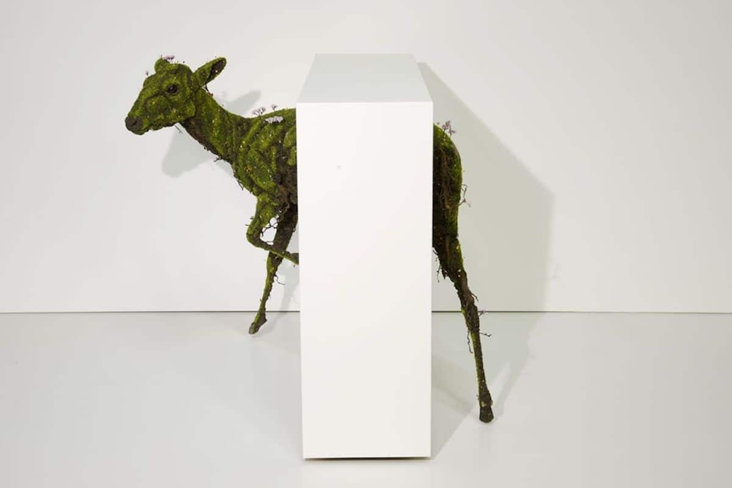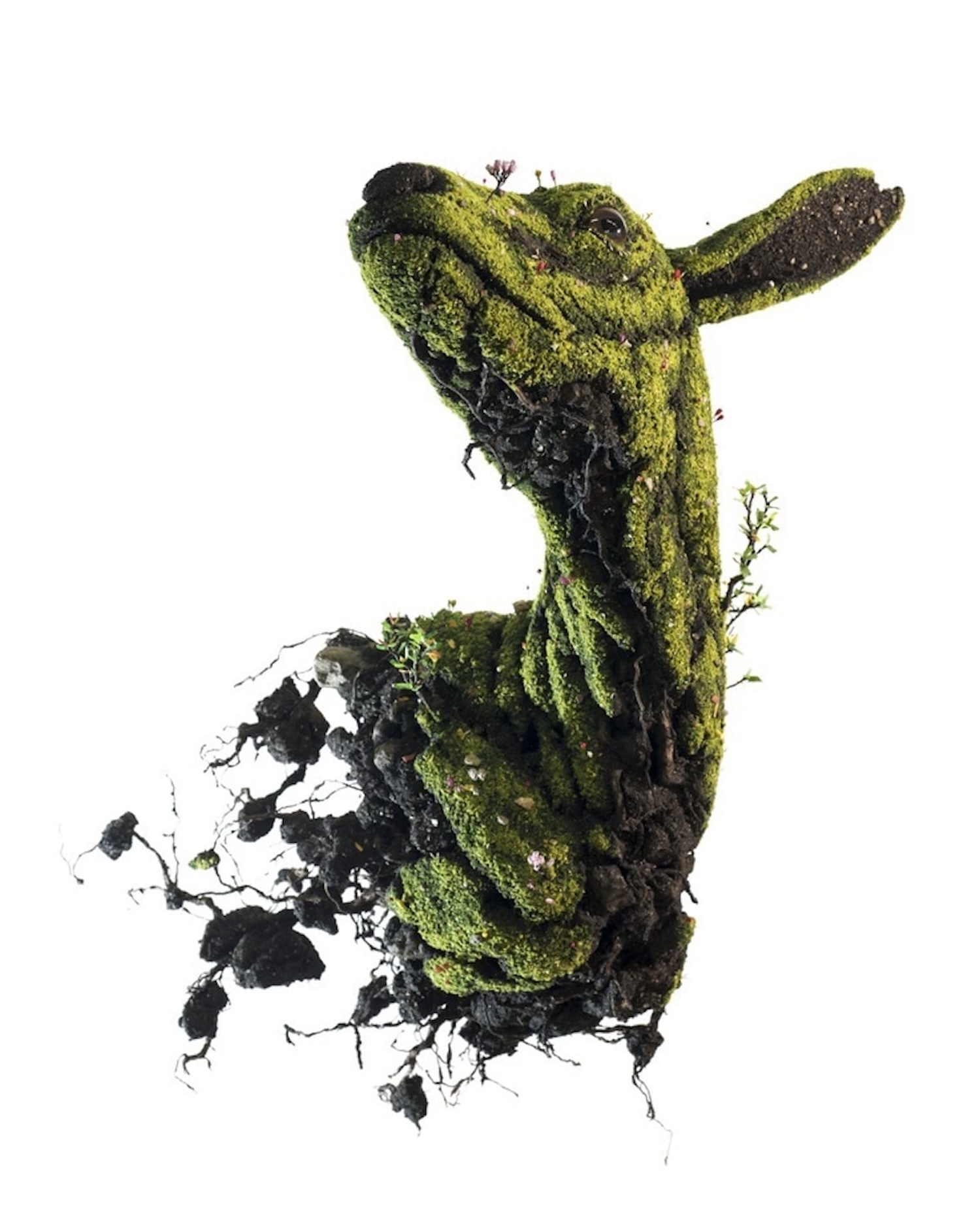 Les sculptures végétales d’Émeric Chantier nous rappellent le travail de l’artiste Debra Bernier et ses œuvres poétiques en bois flotté réalisées en pleine nature.