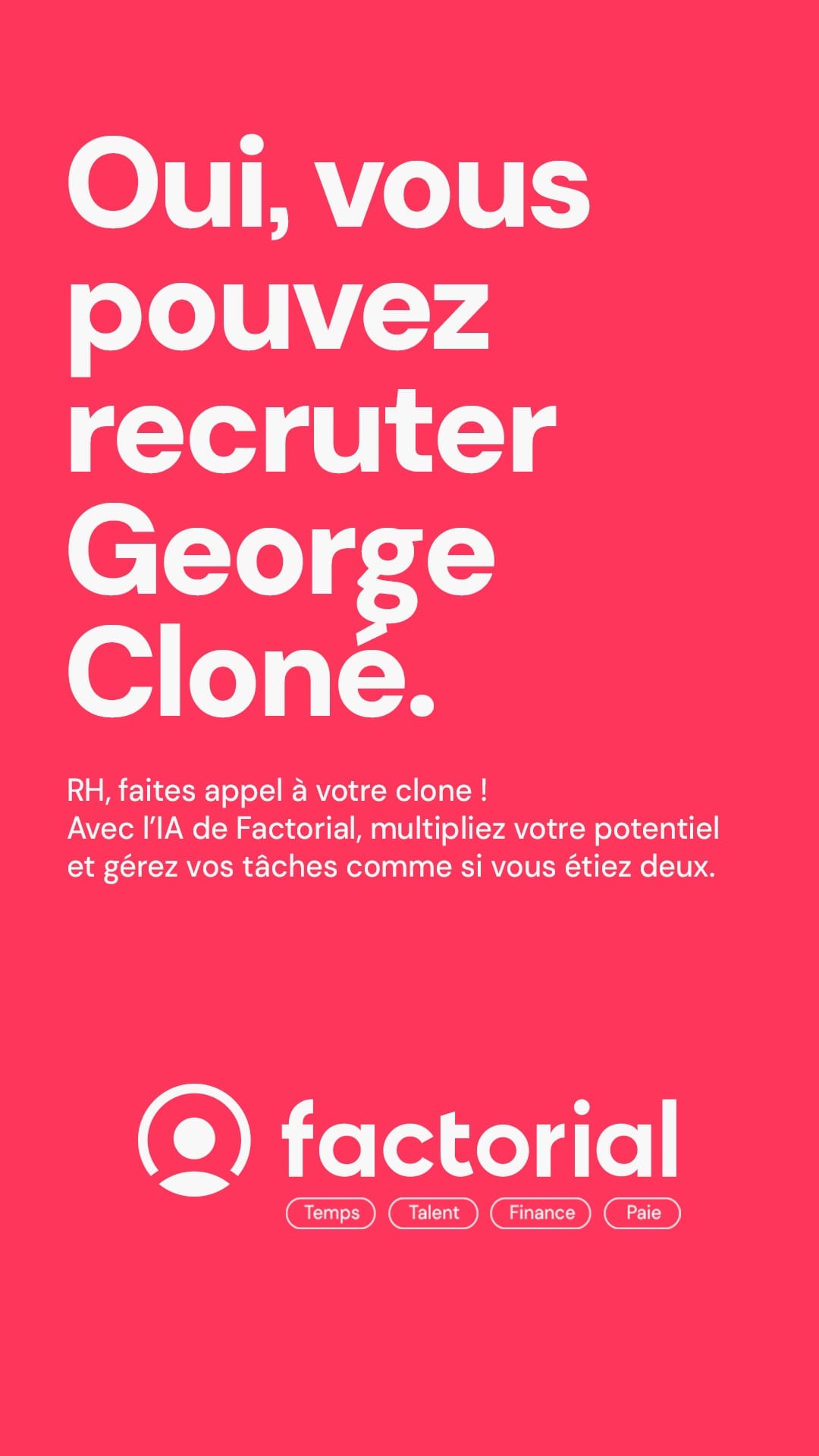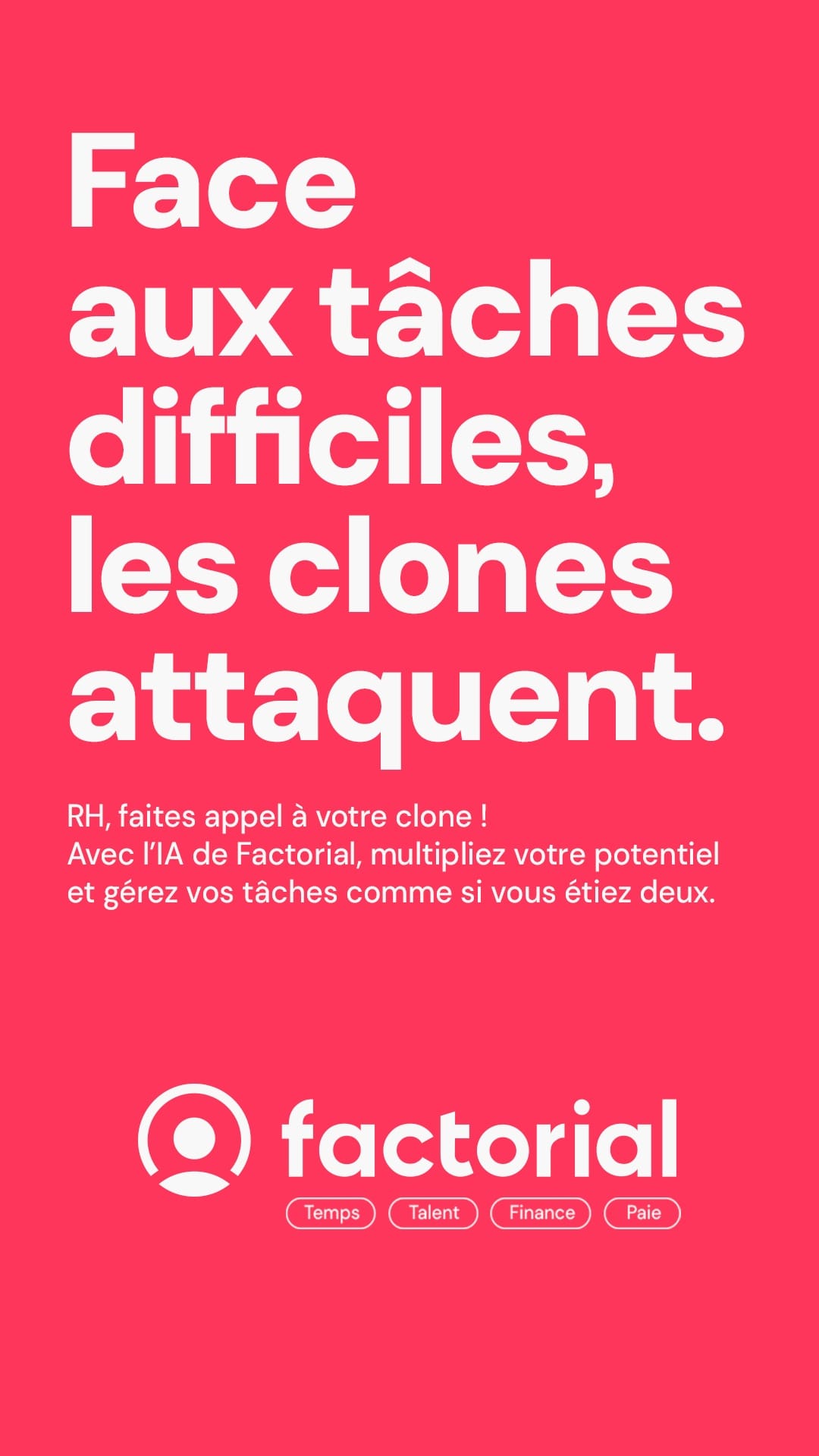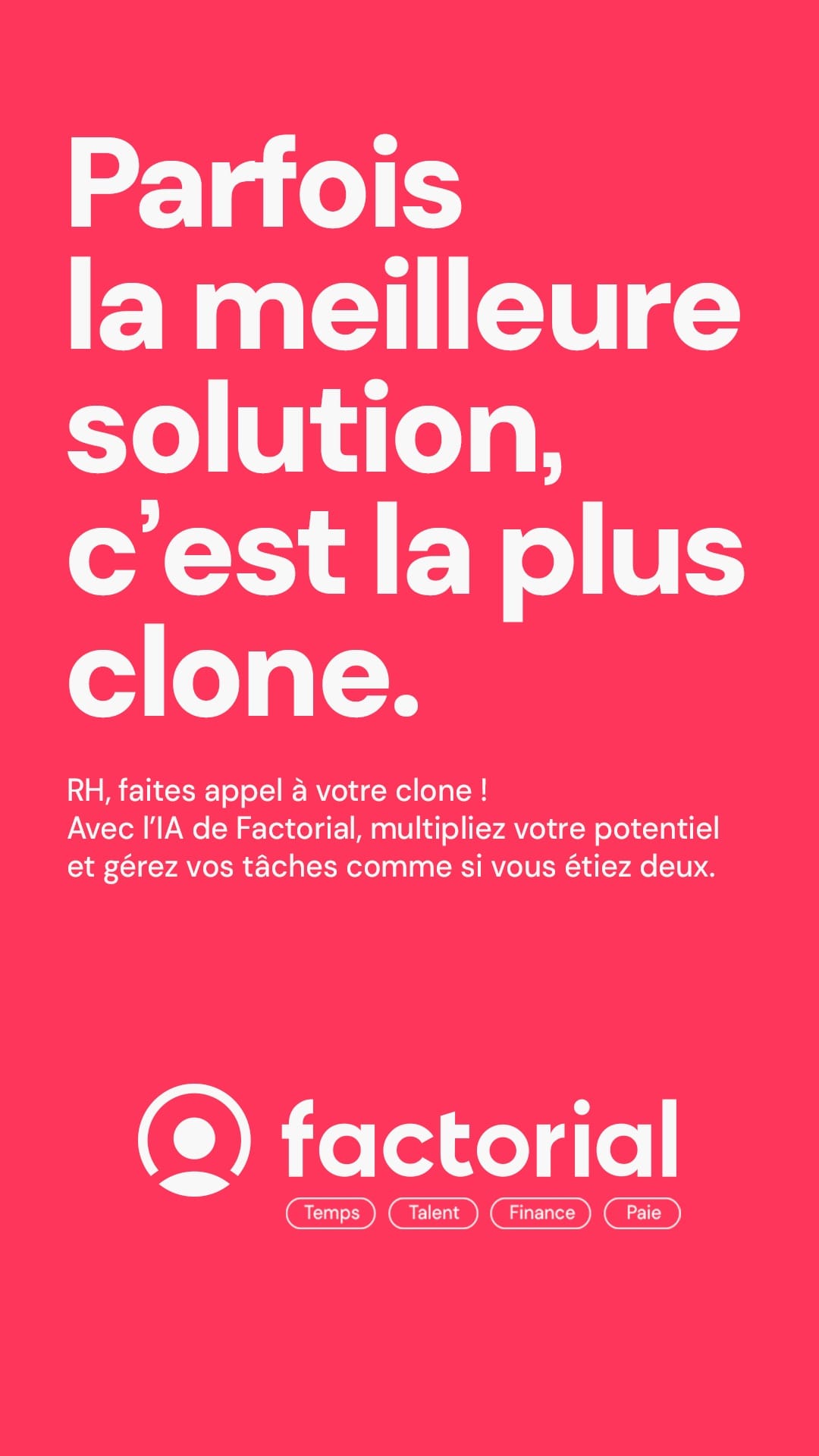 Qui n’a jamais rêvé de pouvoir se dédoubler quand les journées s’accélèrent et que les tâches s’accumulent. Partant de ce fantasme universel, Creapills a poussé jusqu’au bout l’axe créatif imaginé par Factorial autour du clonage. Si l’IA de Factorial est capable d’automatiser, d’anticiper et d’assister à chaque instant, alors elle agit comme un véritable double numérique.