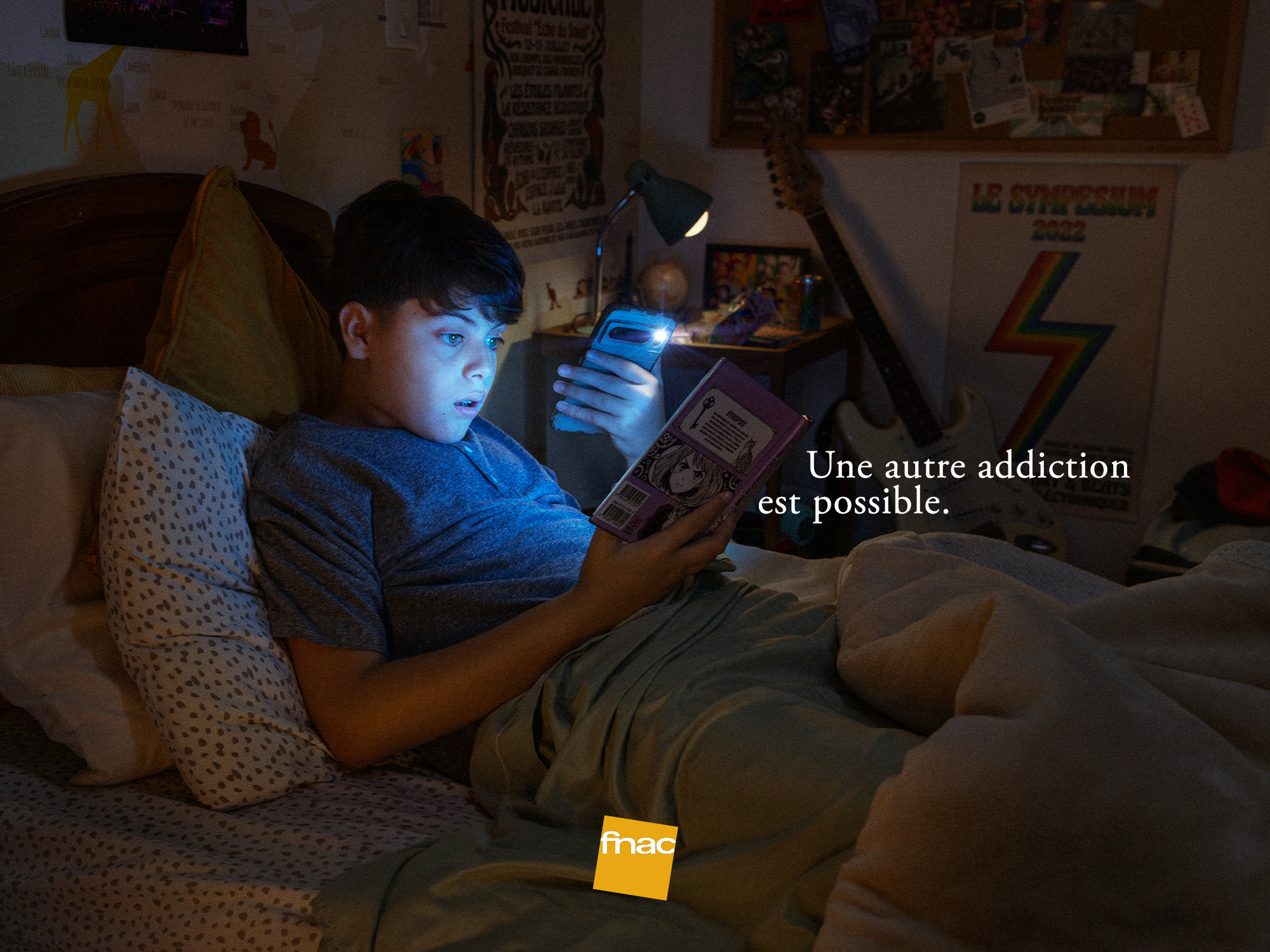 Visuellement, la campagne joue sur un contraste immédiat et familier. On y découvre un enfant allongé dans son lit, éclairé par une lumière bleutée, évoquant instinctivement l’usage d’un smartphone.
