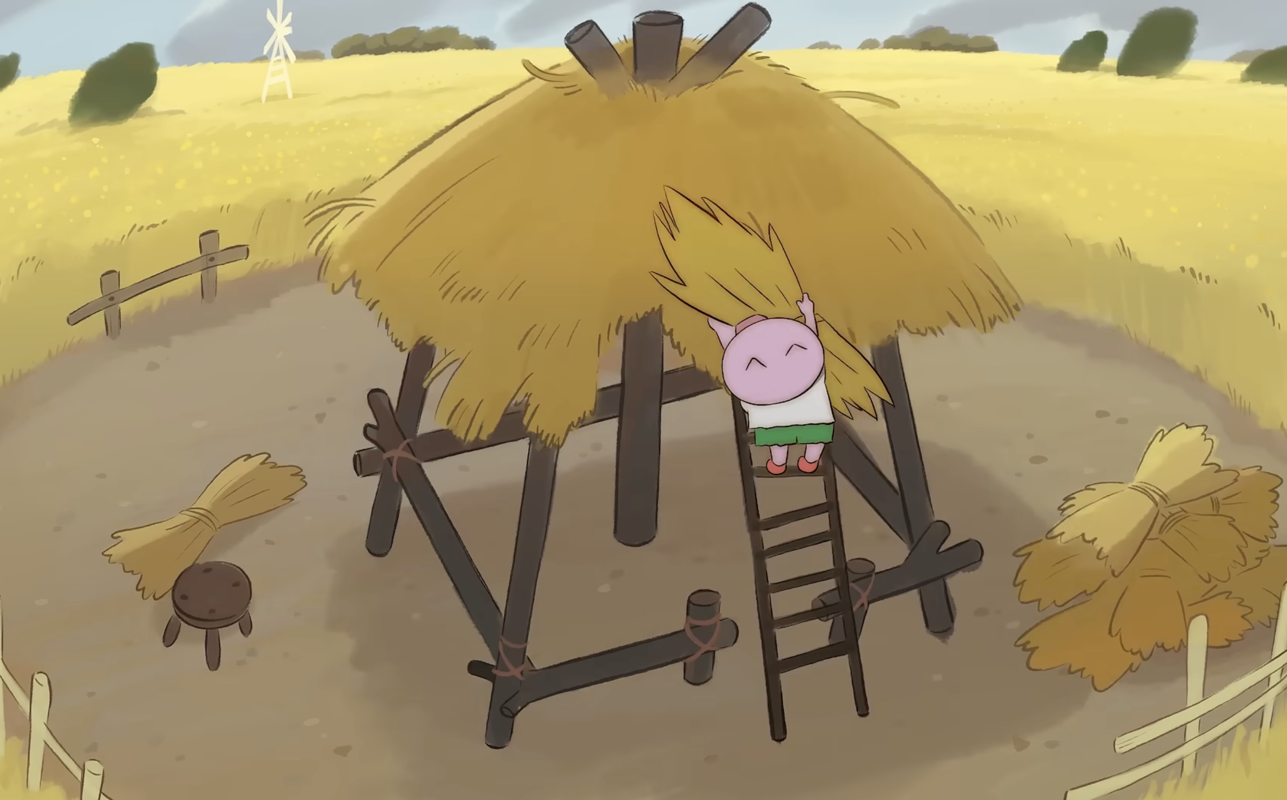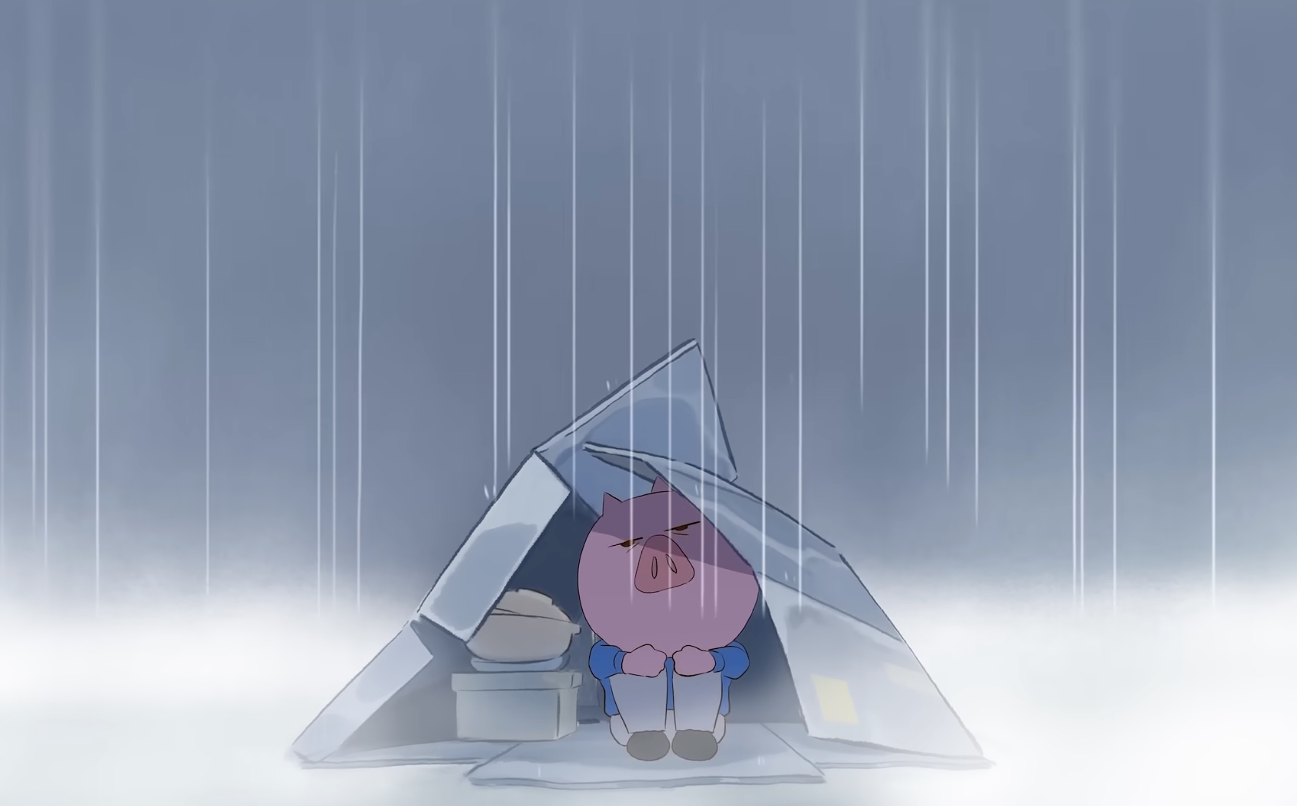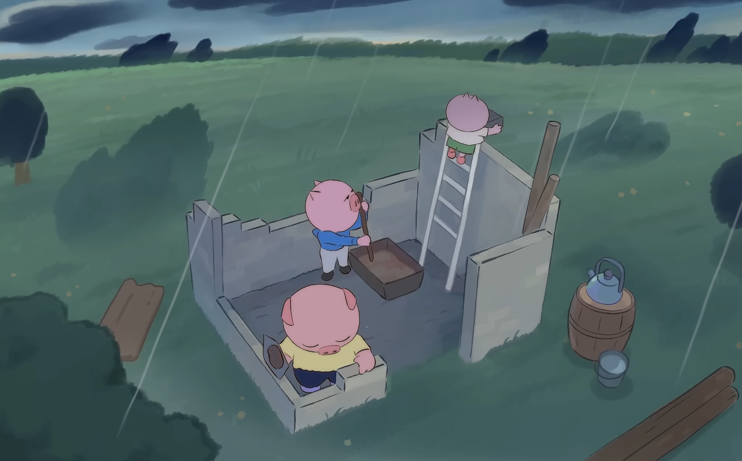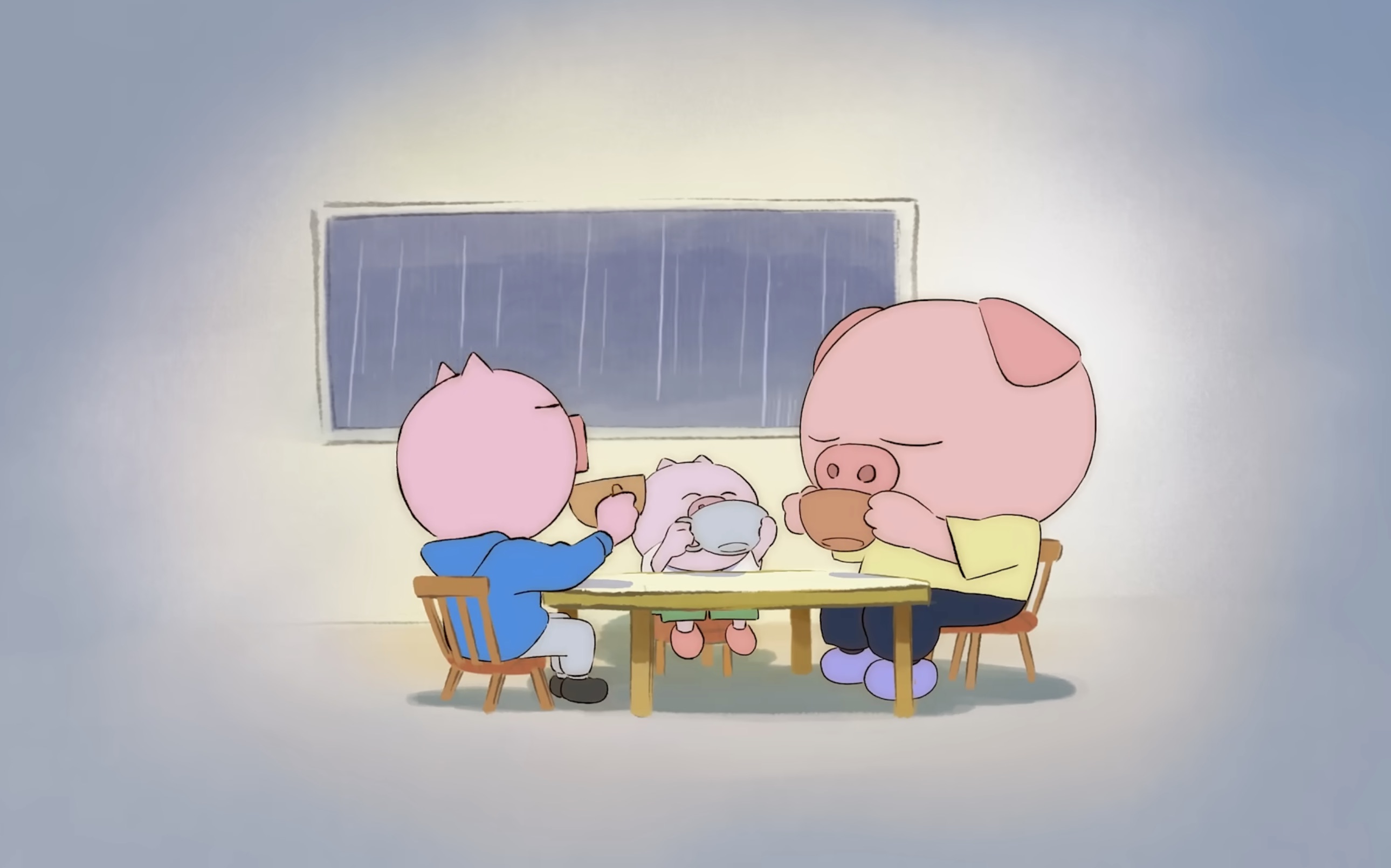 Réalisé par Zheping Xu et Yijia Cao, le film revisite le célèbre récit en l’ancrant dans une réalité contemporaine. Les trois cochons ne chantent plus. Ils subissent. La maison de paille s’envole, celle de carton s’effondre sous la pluie, et le deuxième cochon, presque résigné, semble déjà habitué à voir son abri disparaître.