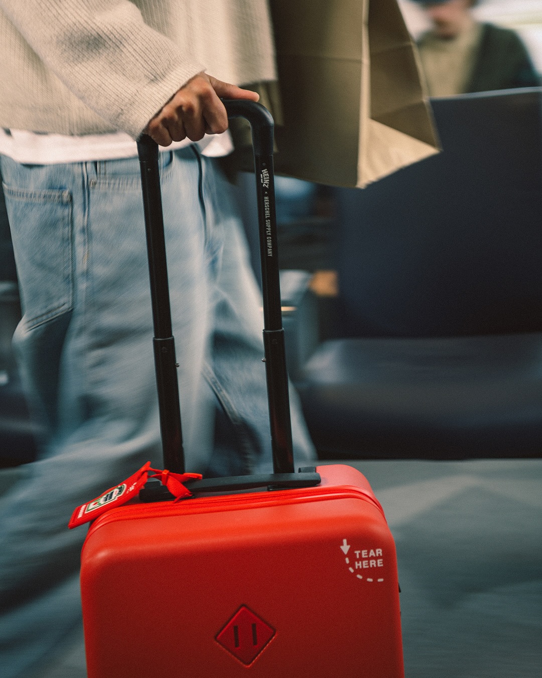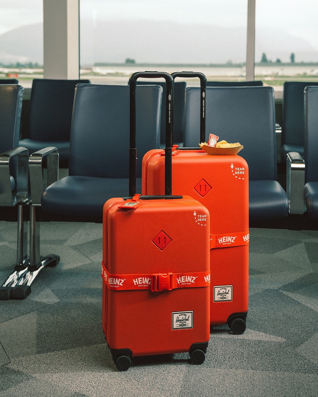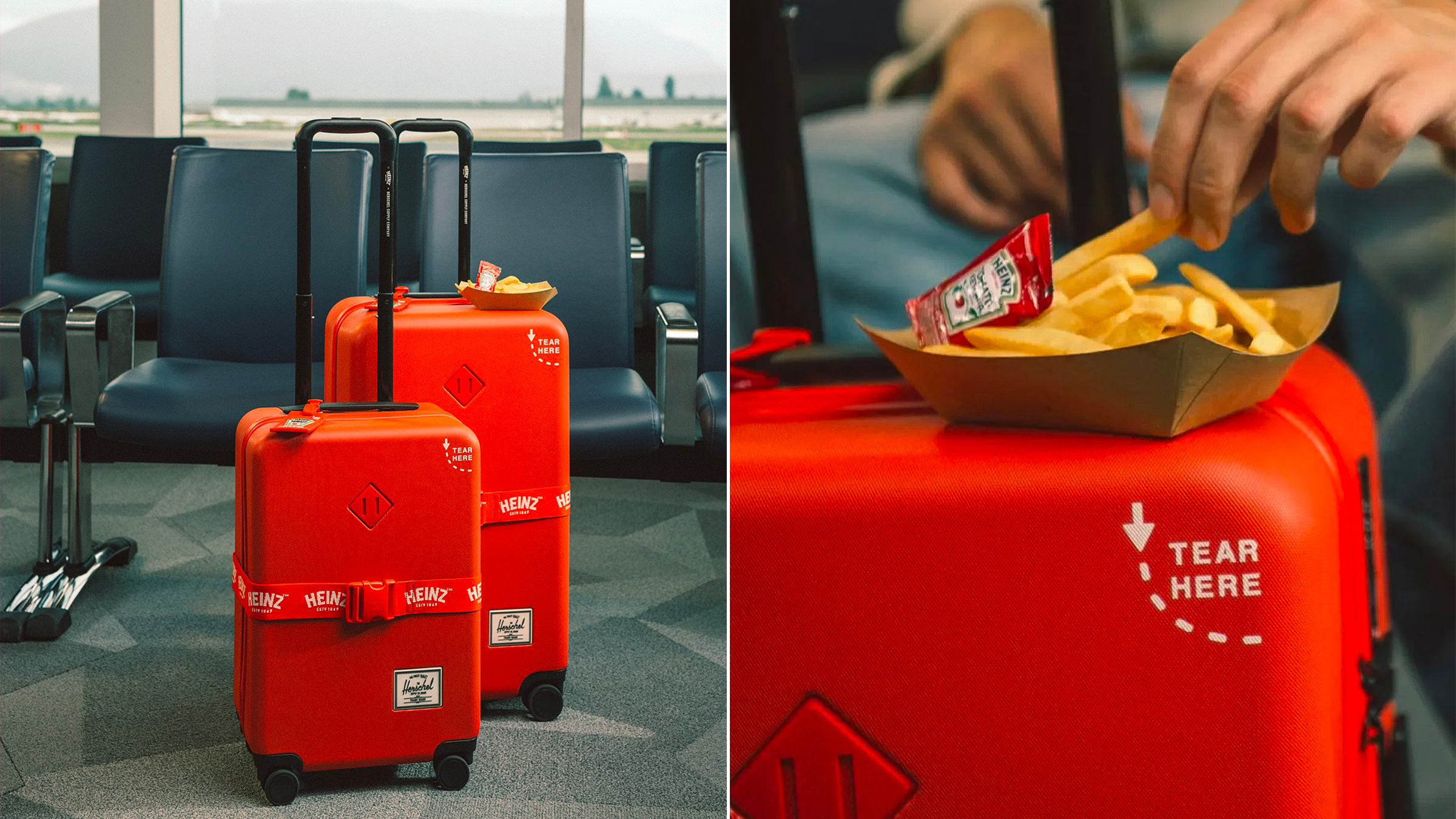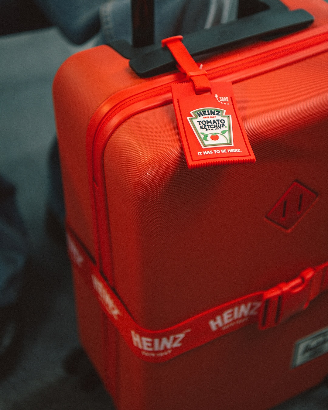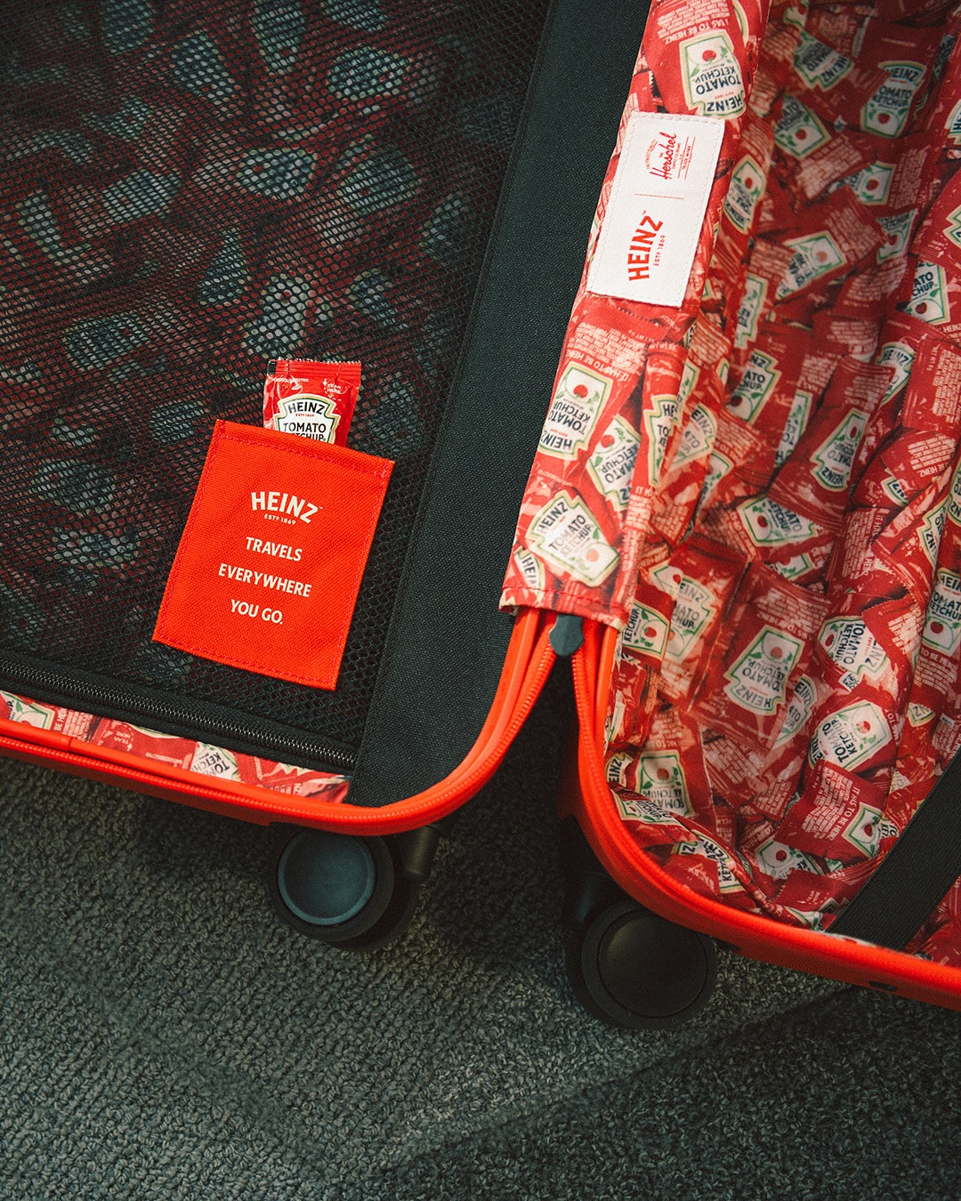 La collaboration s’articule autour de deux pièces phares : la valise rigide Herschel Heritage Medium et la version cabine Large Carry-On. Fabriquées à 70 % en polycarbonate recyclé, elles combinent robustesse et légèreté, tout en révélant un intérieur orné de mini-sachets de ketchup et d’accessoires en forme d’emballage Heinz. Ce soin du détail confère à chaque modèle une personnalité singulière, entre praticité et clin d’œil humoristique.