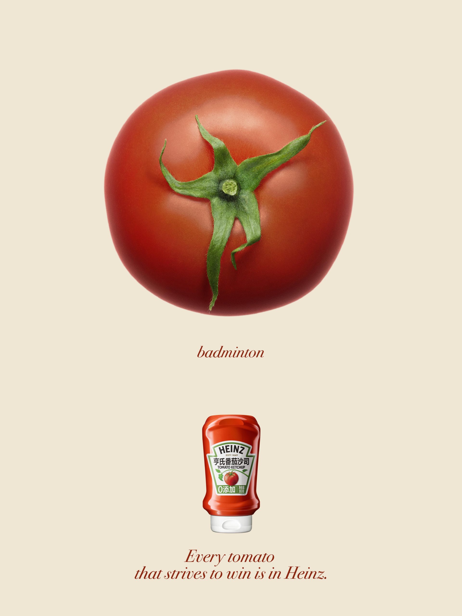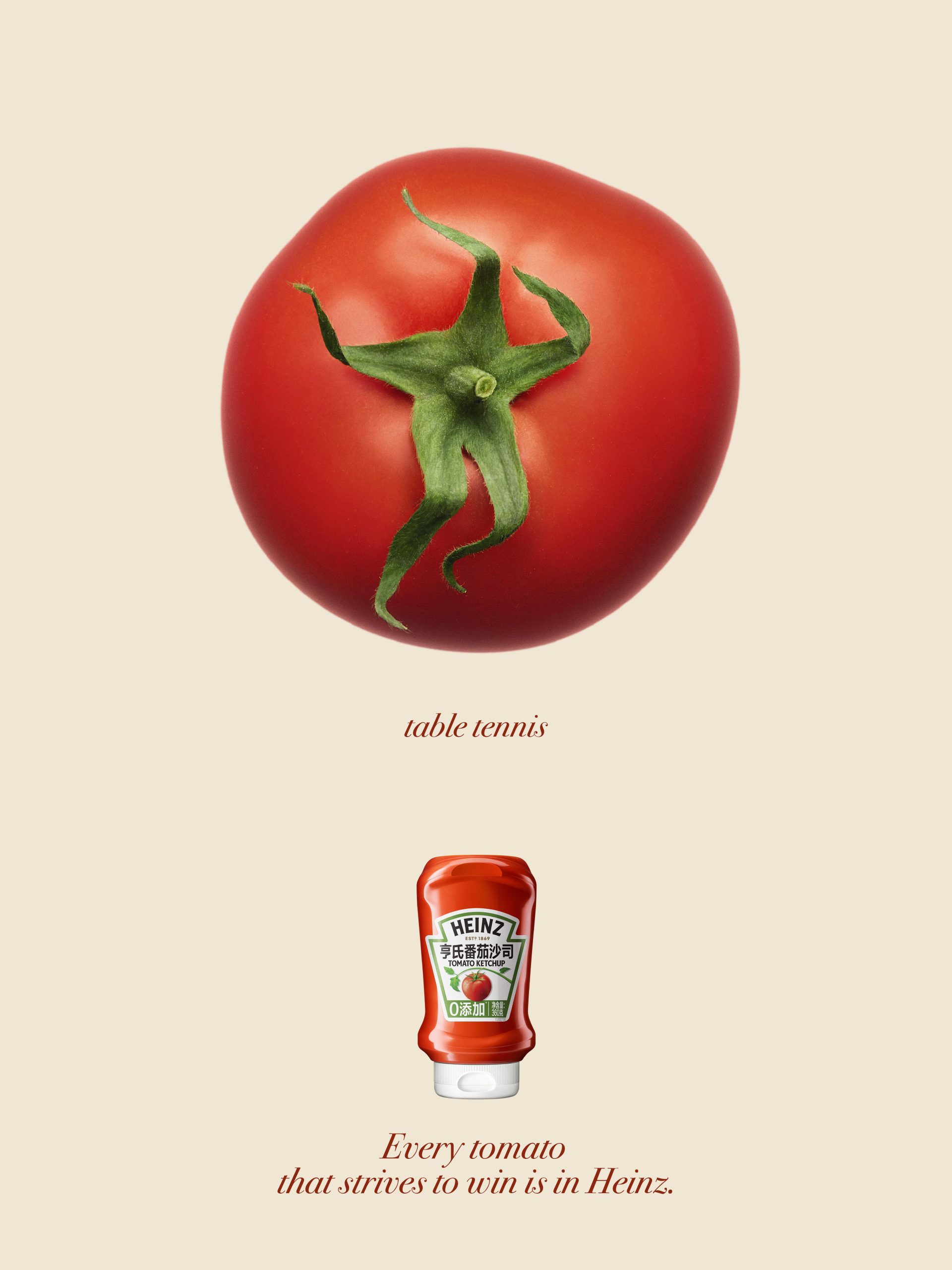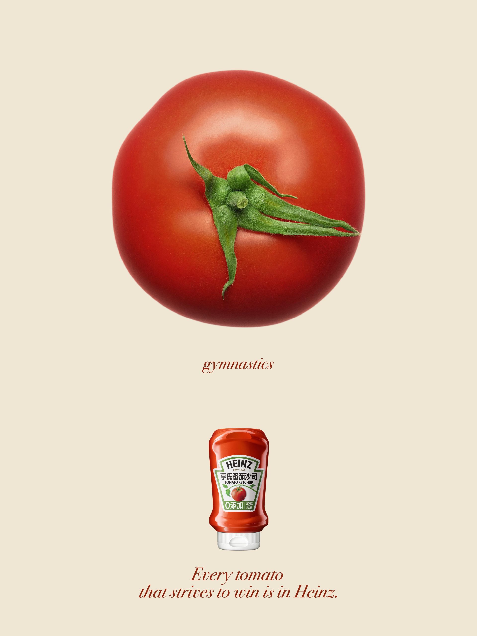 - Heinz détourne ses tomates en 34 athlètes miniatures, transformant les pédoncules verts en sprinteurs, archers ou plongeurs pour célébrer les Jeux nationaux chinois… sans être sponsor officiel.