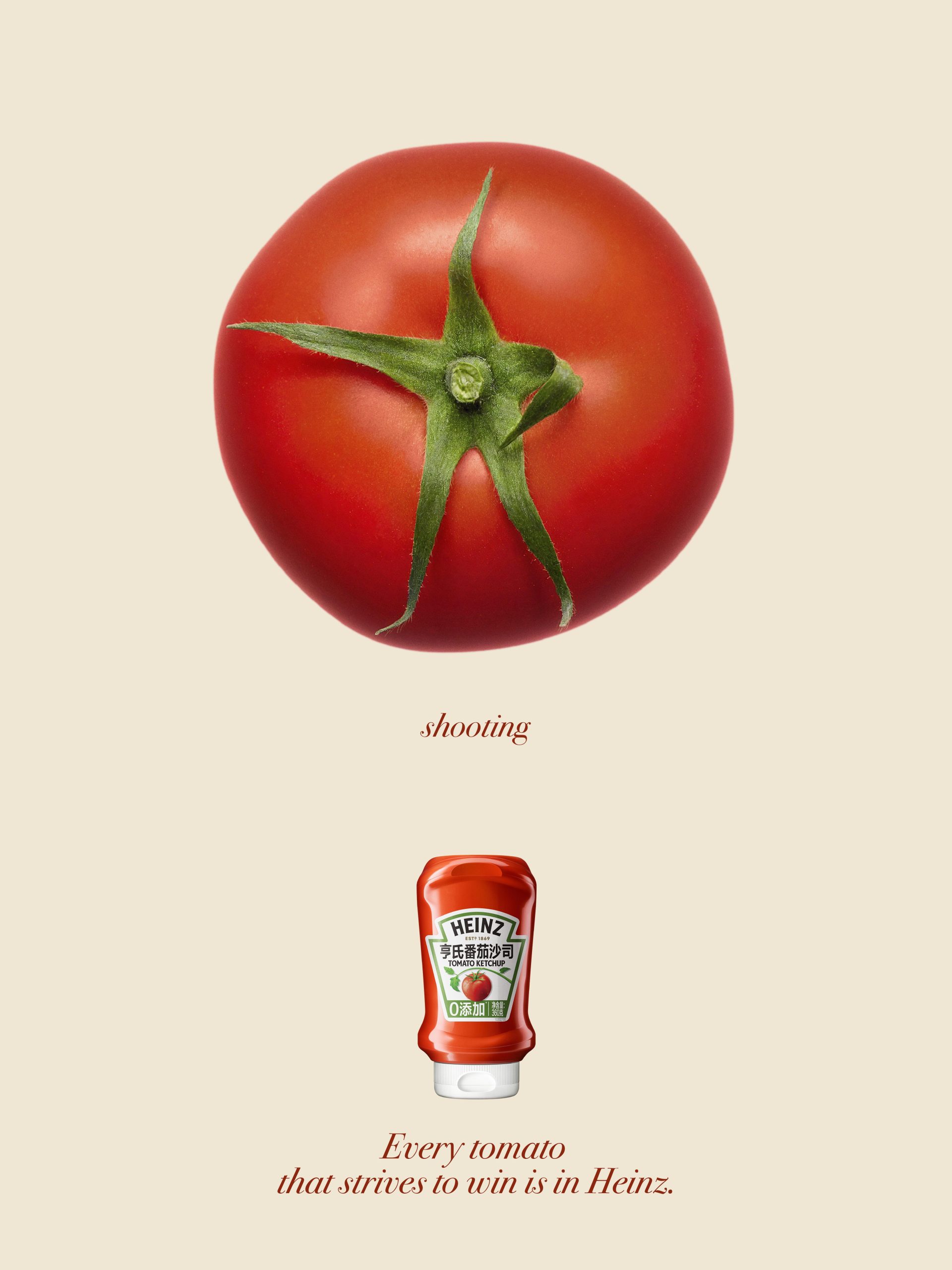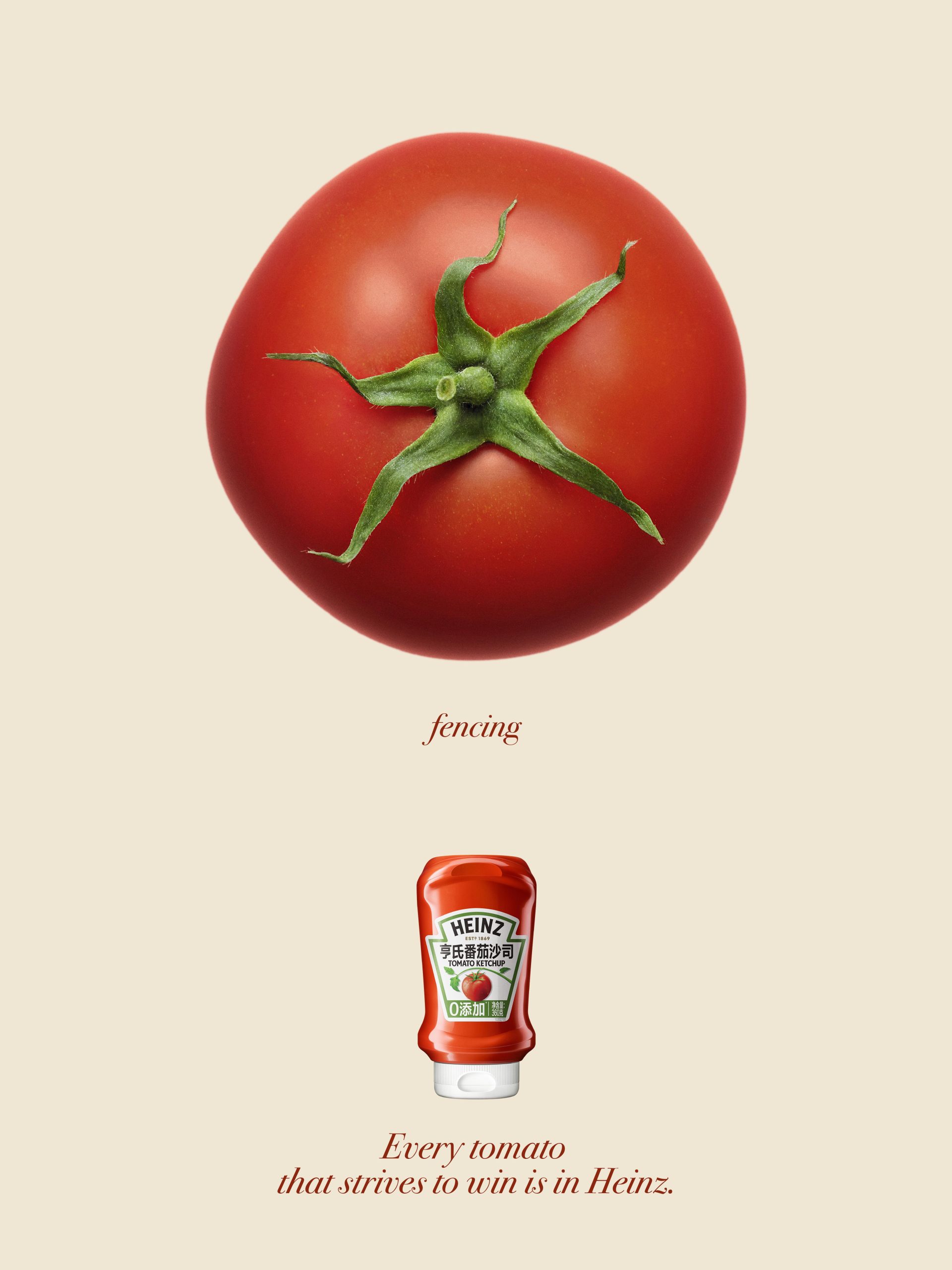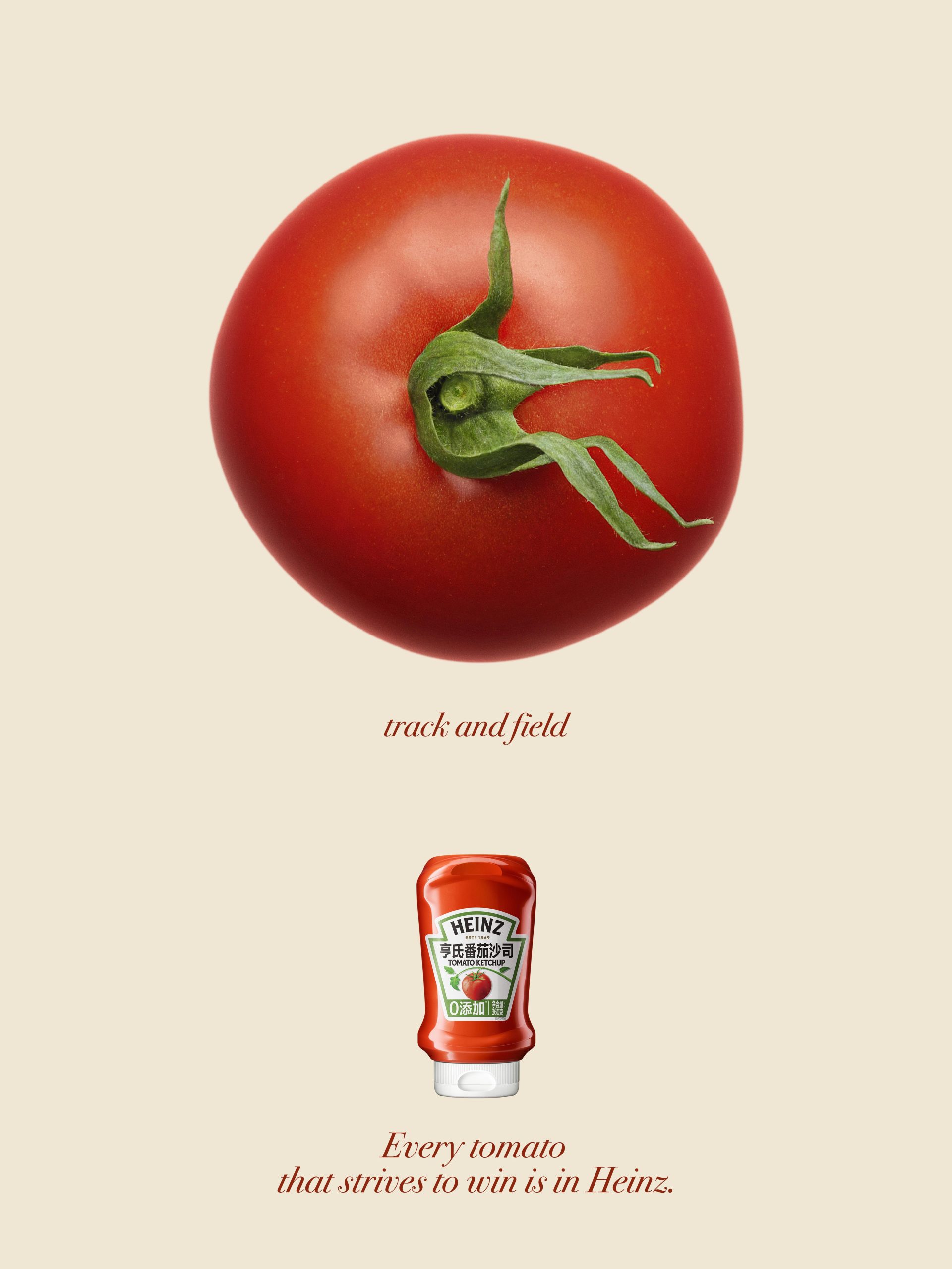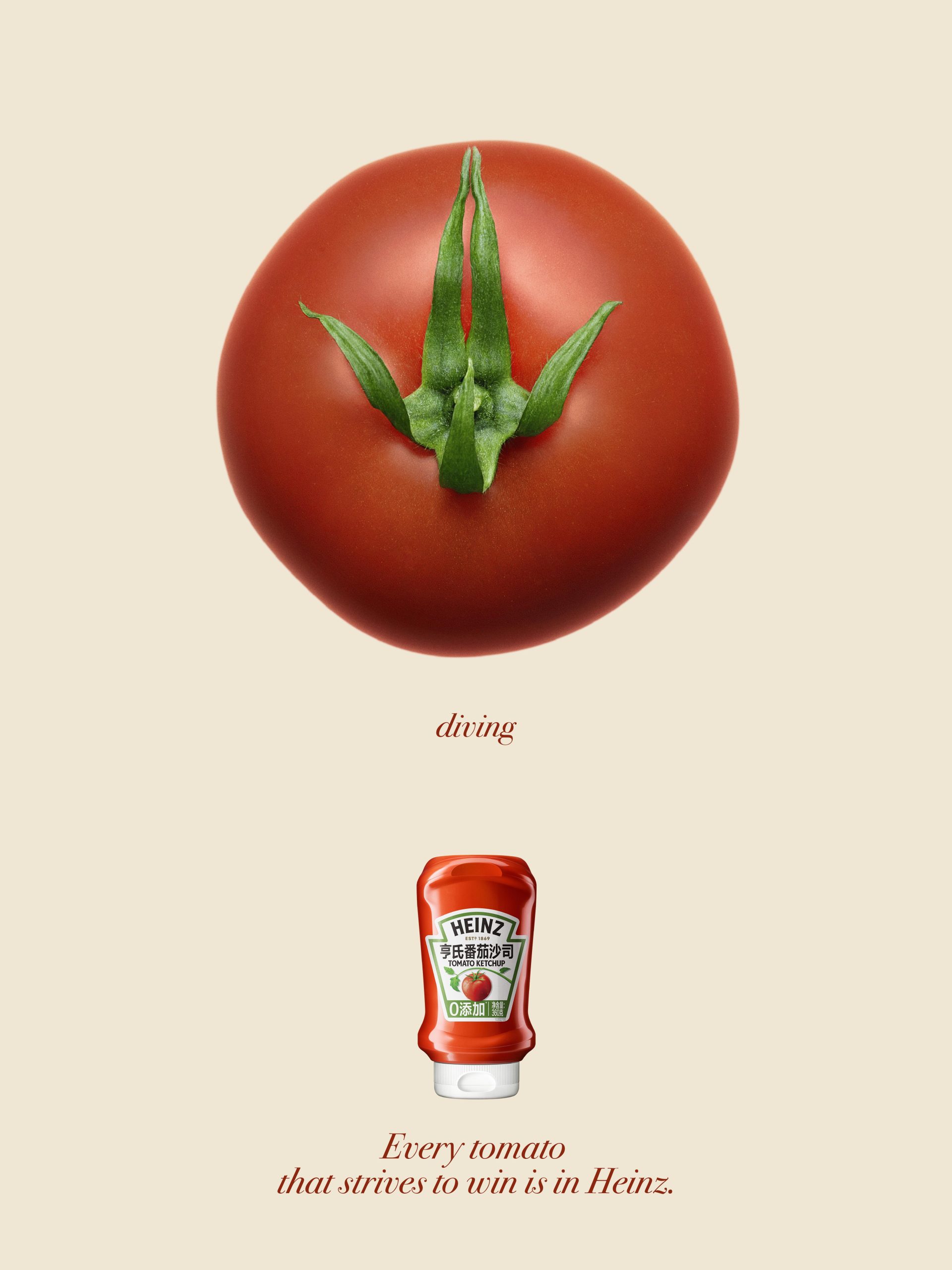 - Heinz détourne ses tomates en 34 athlètes miniatures, transformant les pédoncules verts en sprinteurs, archers ou plongeurs pour célébrer les Jeux nationaux chinois… sans être sponsor officiel.