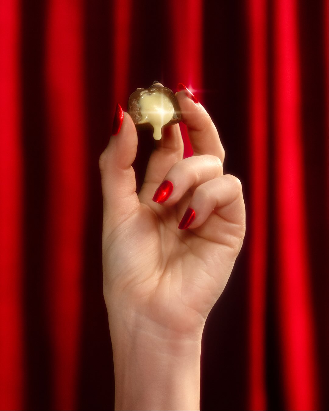Les teasers et films de lancement reprennent les codes des publicités sensuelles de chocolat des années 90. Rideaux rouges, lumière satinée, ralentis ultra dramatiques… sauf qu’au lieu d’une praline, c’est un bouton qui laisse s’échapper de la ganache. Le tout tourné en esthétique rétro volontairement datée pour accentuer le contraste entre glamour et… bouton.