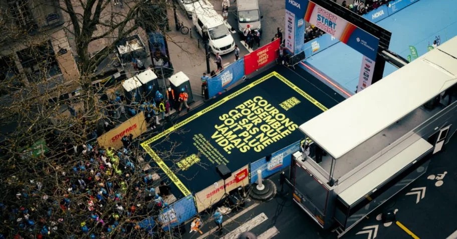 Au-delà du film, HOKA a prolongé son engagement avec des actions sur le terrain. Lors du Semi de Paris, la marque a notamment matérialisé l’absence des runneuses avec un “sas manquant” placé sur la ligne de départ.