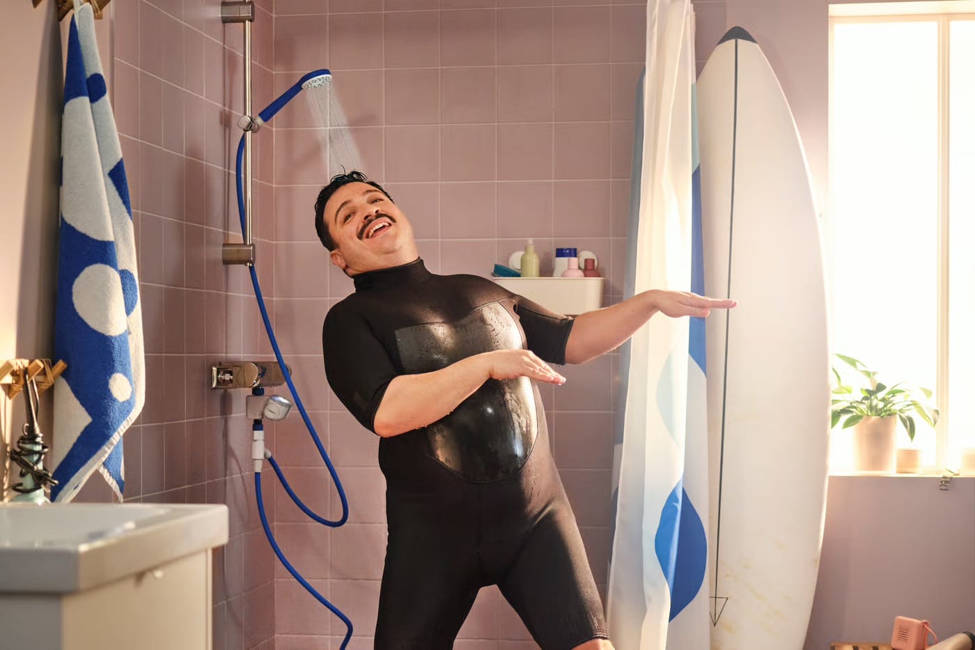 Avec ses teintes bleues, ses textures inspirées des ondulations et ses accessoires ludiques, BERGVATTNET ne présente pas l’économie d’eau comme une contrainte, mais comme un plaisir à intégrer dans son intérieur.