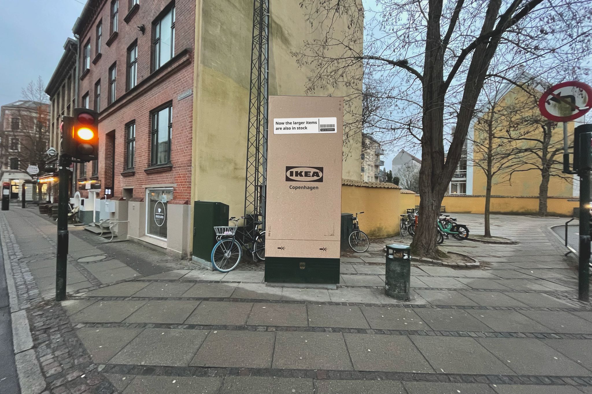 Et c’est exactement ce que la campagne met en scène : des formats gigantesques de ces boîtes sont déployés partout dans Copenhague, comme si la ville venait d’être livrée.