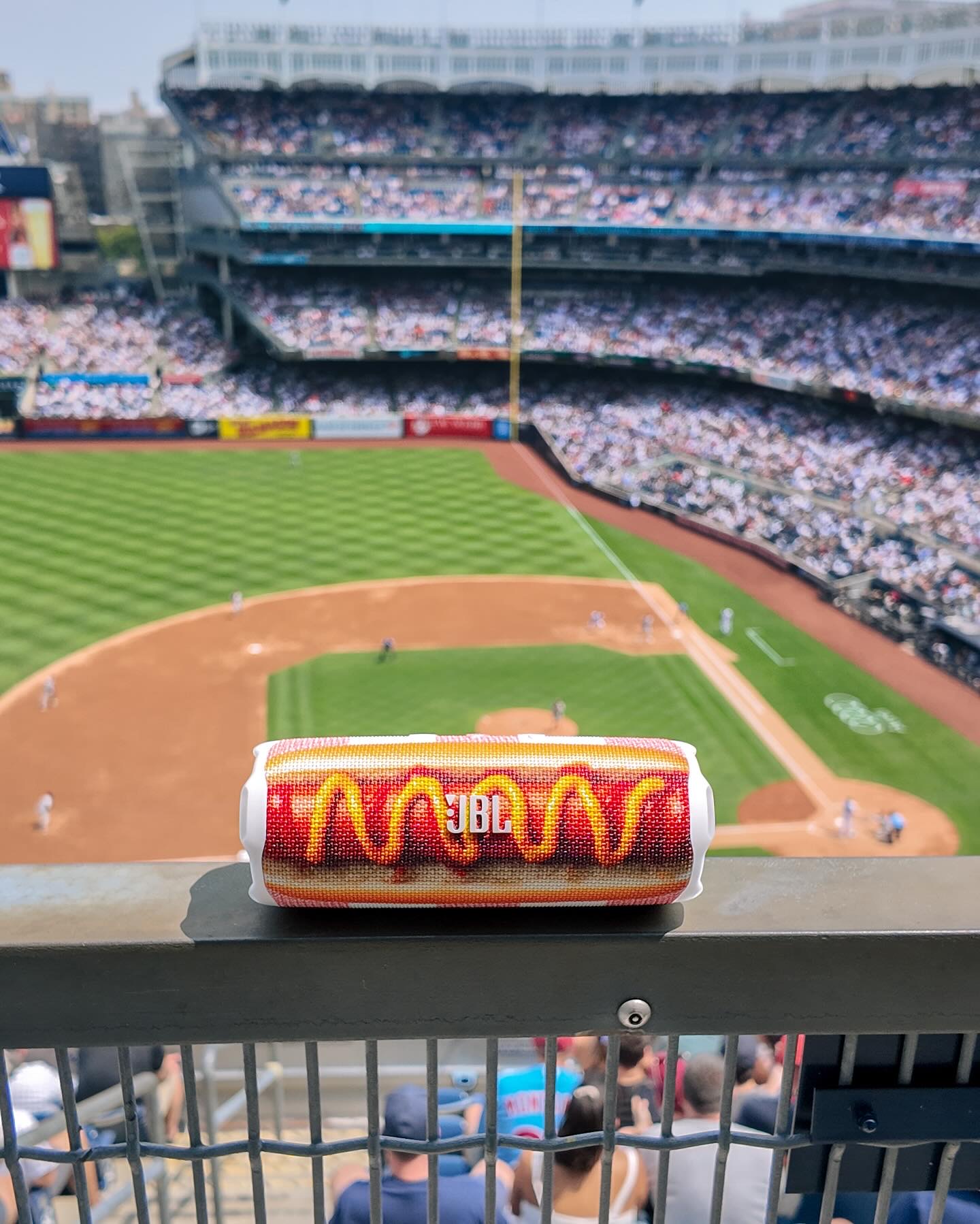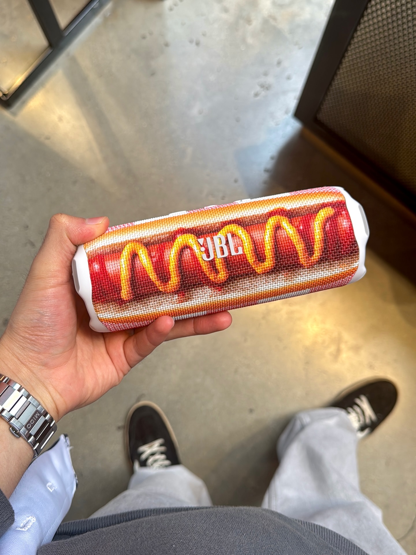 Inspirée par la culture food américaine, cette Flip 7 “Glizzy Edition” détourne avec humour les codes du snack pour en faire une icône lifestyle. En associant un objet technologique à un symbole populaire, JBL joue la carte du contraste : le sérieux de l’audio haut de gamme face à la légèreté du hot-dog. Le résultat ? Une création à la fois absurde, réjouissante et irrésistiblement virale.