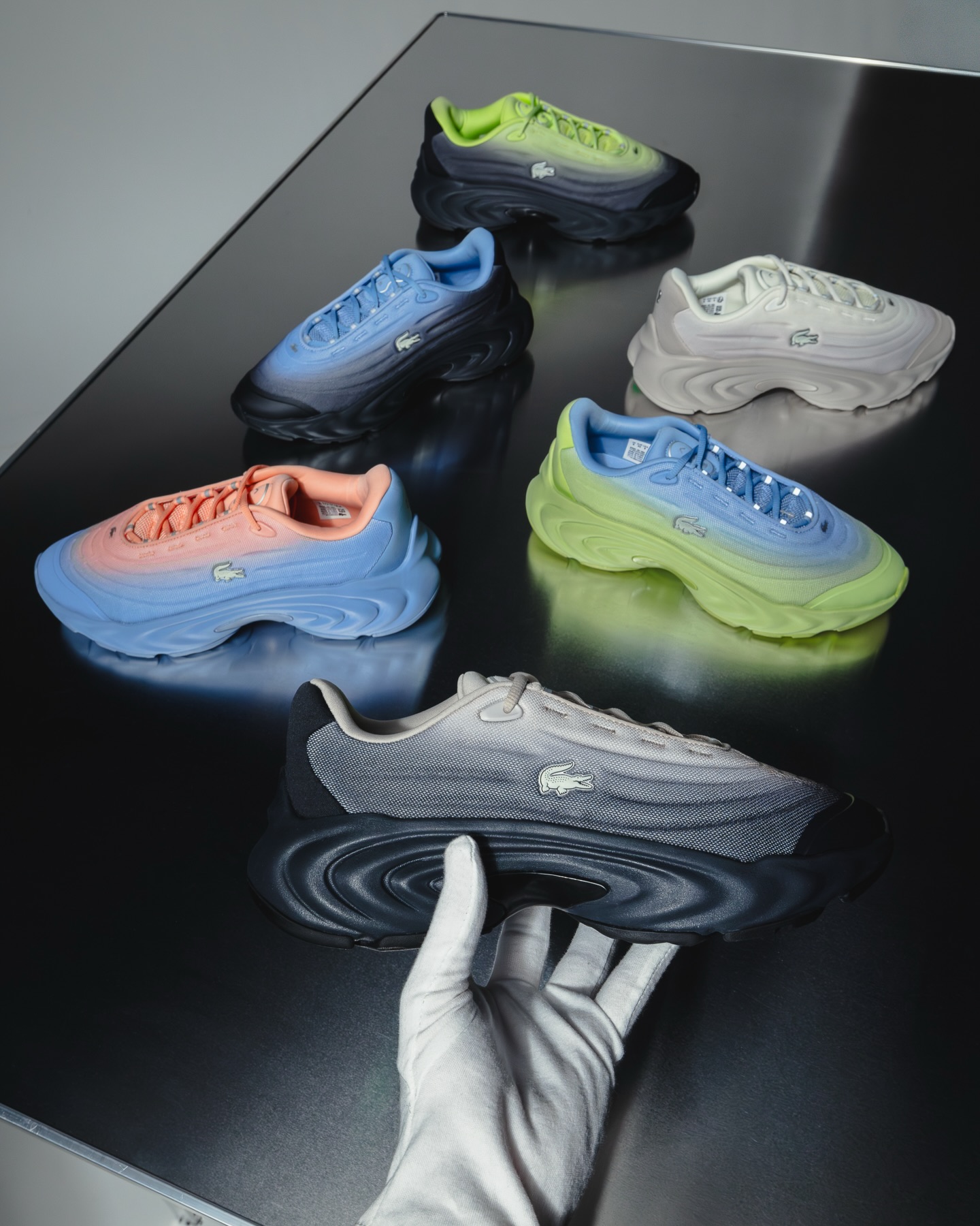 La palette de couleurs alterne entre modèles monochromes et dégradés plus audacieux. Des transitions de teintes allant du gris à l’anthracite ou du rose au bleu viennent accentuer l’idée de mouvement continu, tandis que certains détails réfléchissants complètent l’ensemble. Les différents modèles de la collection sont disponibles entre 130 et 180 euros sur le site Lacoste.