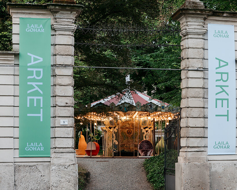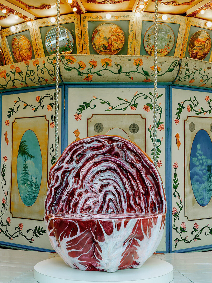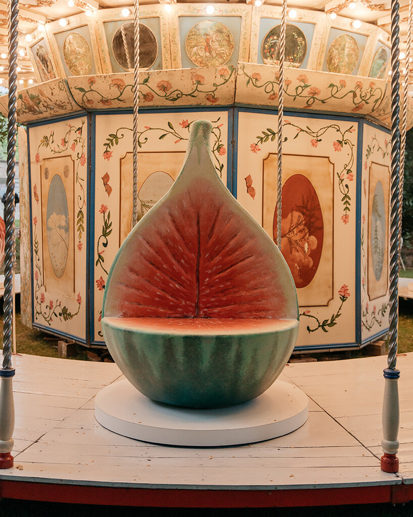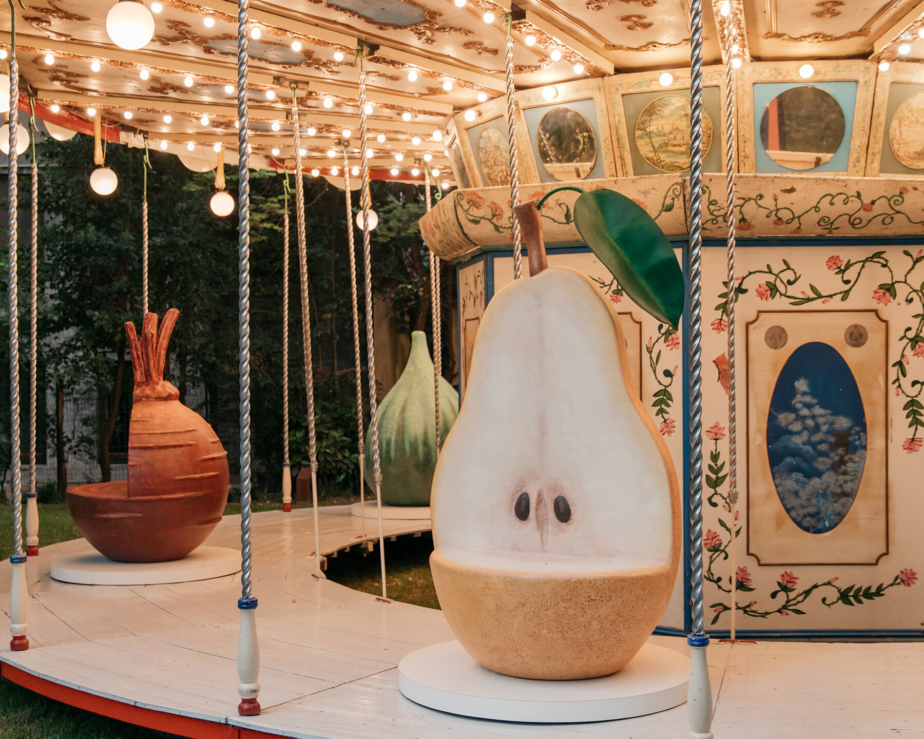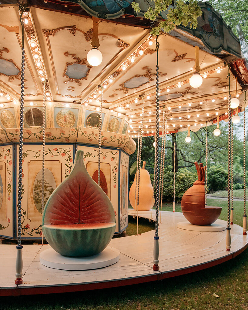 • Pour la Milan Design Week, l’artiste Laila Gohar transforme un manège en installation avec des fruits et légumes géants à la place des chevaux.