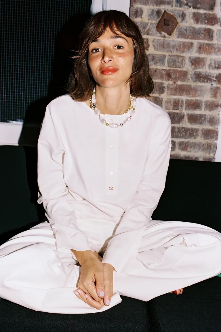 On y retrouve des influences workwear mêlées à des pièces plus délicates. Broderies, perles et jeux de textures viennent perturber les basiques. L’ensemble oscille entre utilité et ornement, dans une logique cohérente avec l’univers de la créatrice.