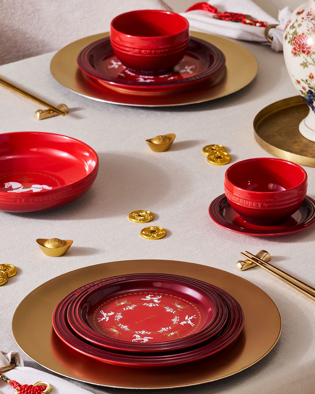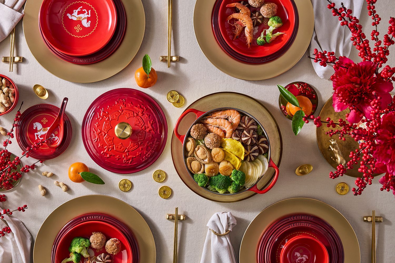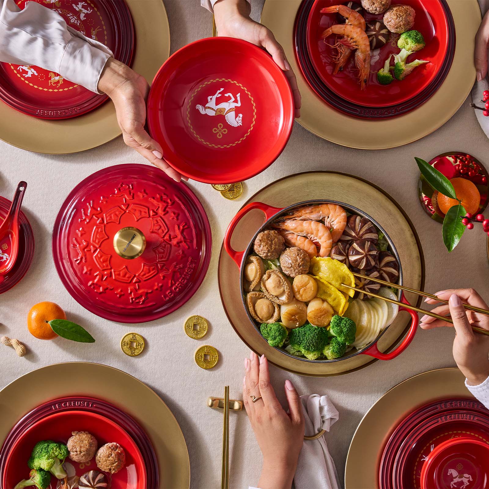 La collection a clairement été imaginée pour les repas rituels du Nouvel An lunaire, souvent construits autour de plats à partager et de symboles culinaires. Ici, Le Creuset propose un ensemble cohérent où la vaisselle n’est pas un simple accompagnement, mais une mise en scène : celle d’un repas familial, généreux, et pensé pour être célébré.
