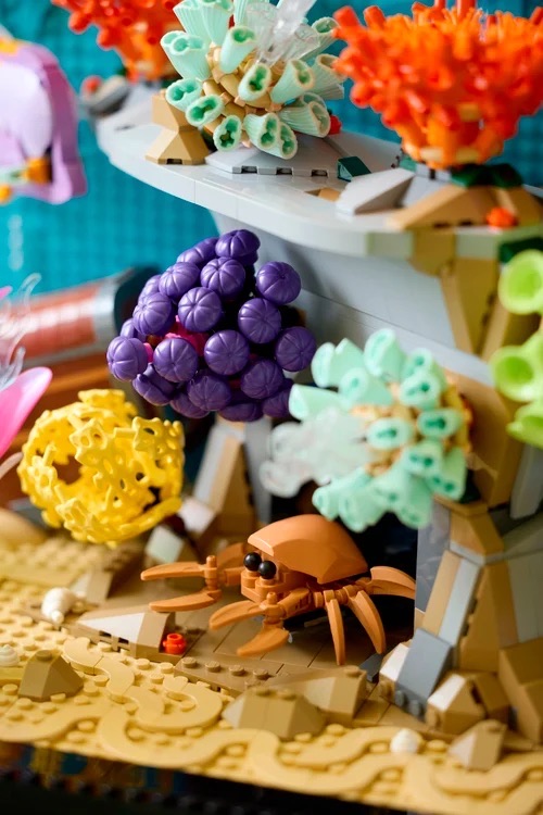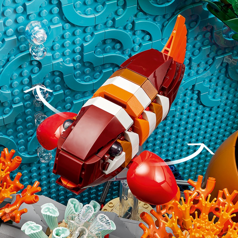 Mais la véritable magie de ce set se cache dans son ingénierie. Grâce à un réseau de manivelles, engrenages et leviers discrètement intégrés dans la structure, tout s’anime d’un simple geste. Les poissons nagent en cadence, les coraux se balancent au gré d’un courant invisible, les coffres au trésor s’ouvrent et se referment. Ce petit monde aquatique prend vie sous vos yeux, comme un décor en mouvement.