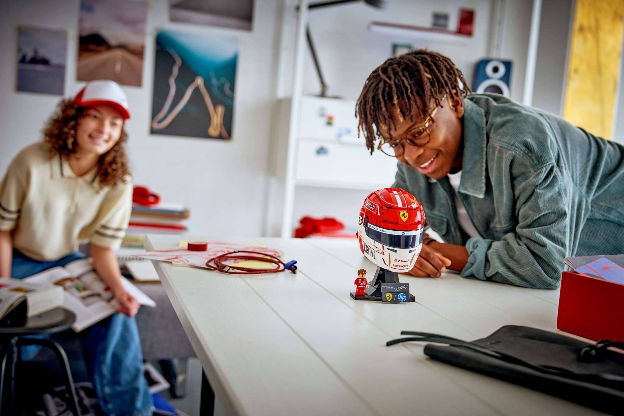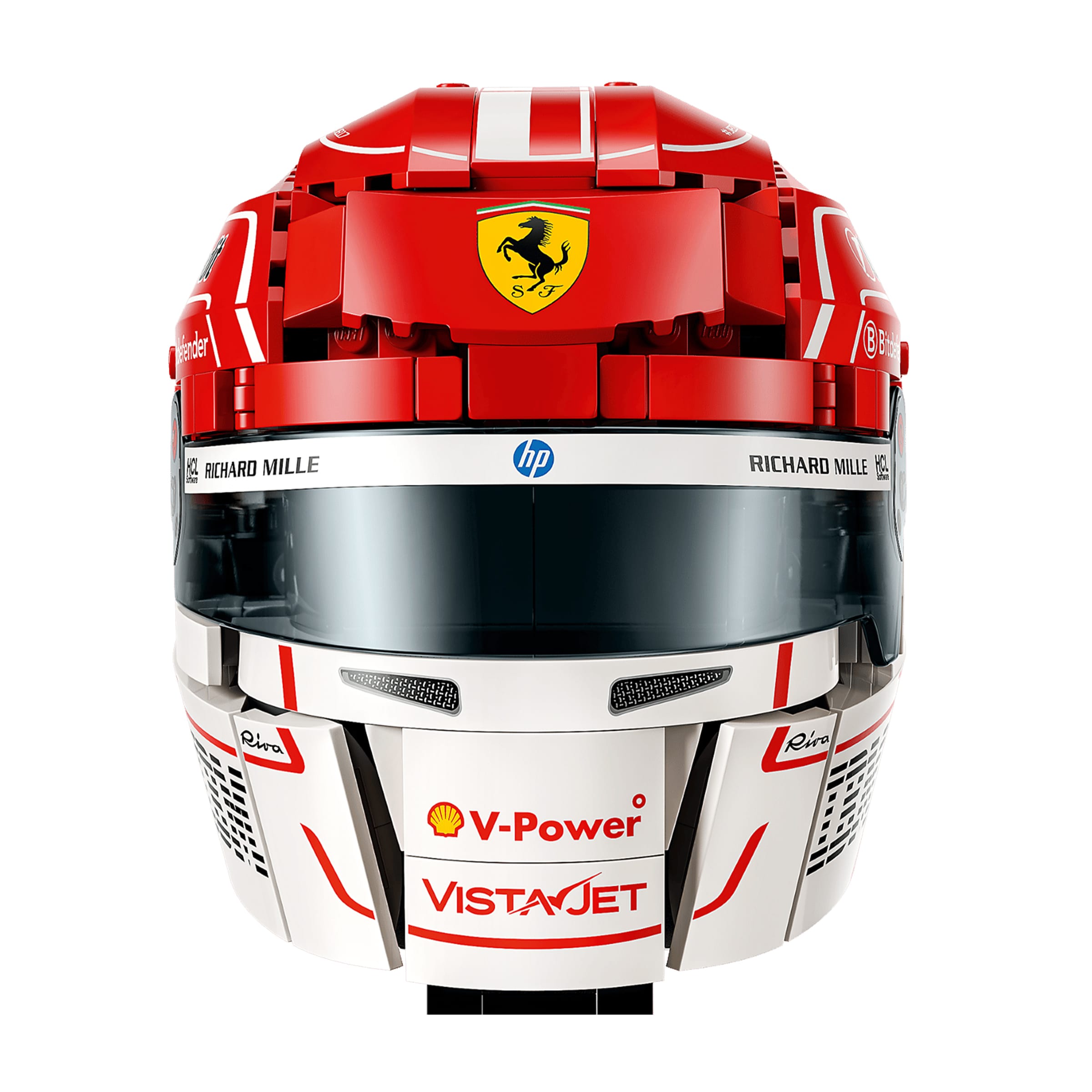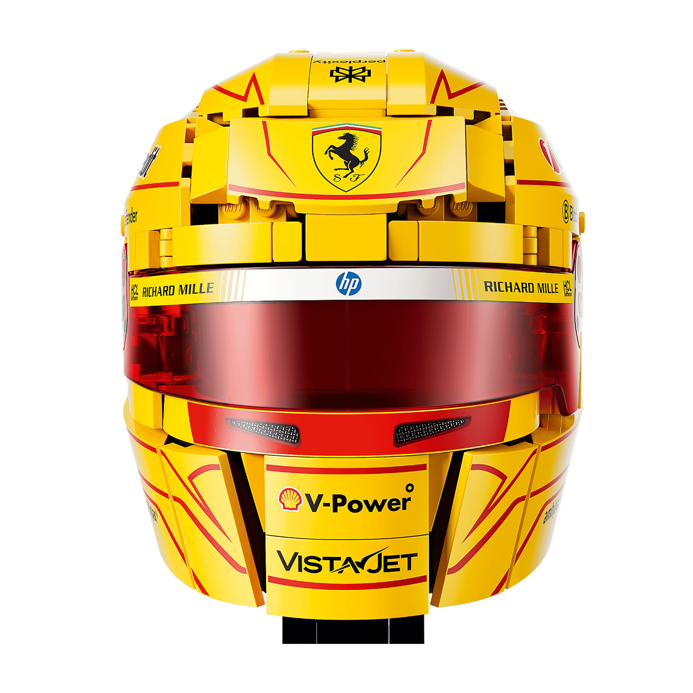 Chaque modèle s’inspire directement des designs portés par les pilotes en piste. Le casque de Charles Leclerc reprend ses couleurs et ses lignes caractéristiques, avec des contrastes marqués et des éléments graphiques fidèlement recréés en briques.